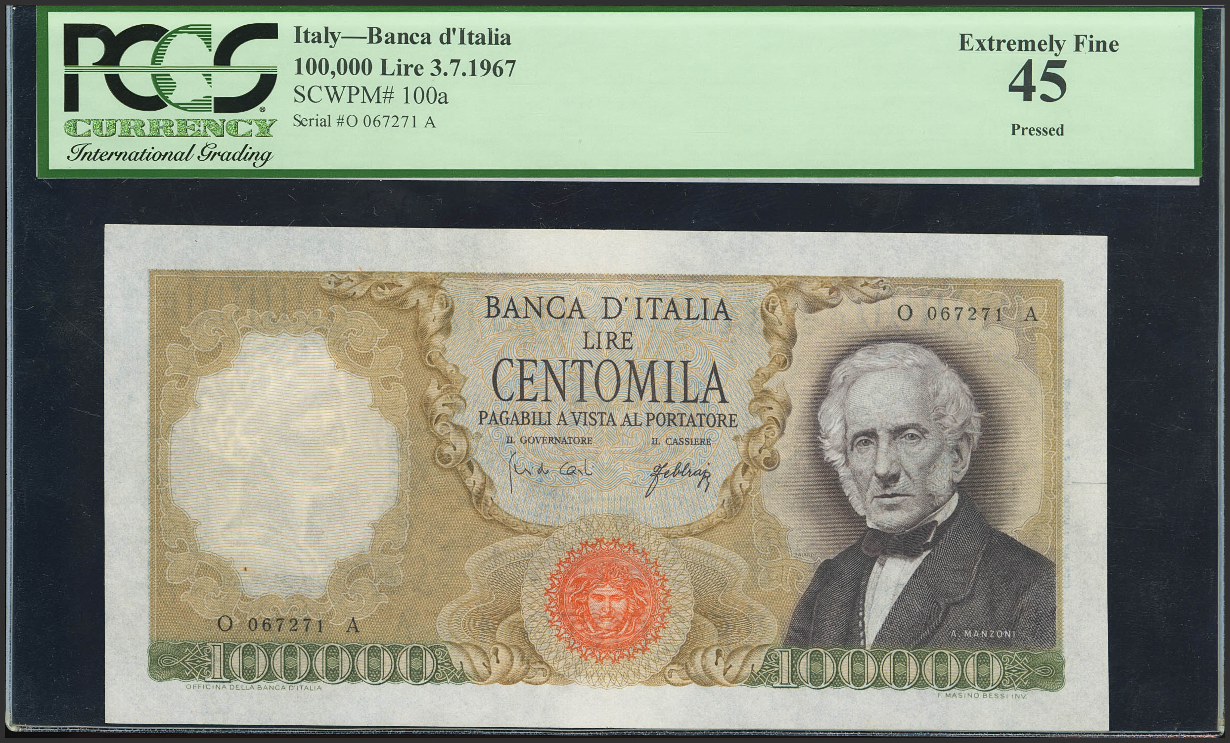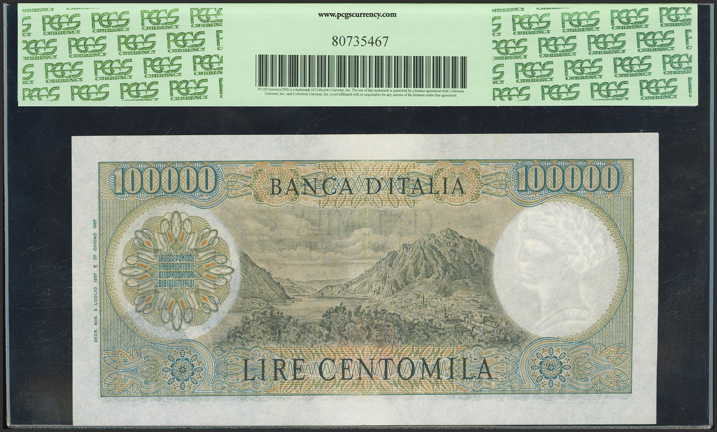 ITALY. 100000 Lire. 3 July 1967. (Pick: 100a). Rare. PCGS45 (pressed).
