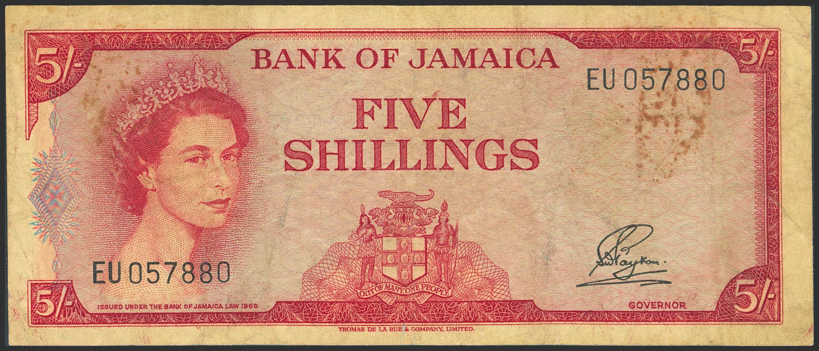 JAMAICA. 5 Shillings. (1964ca). (Pick: 51A). Less than Very Fine.