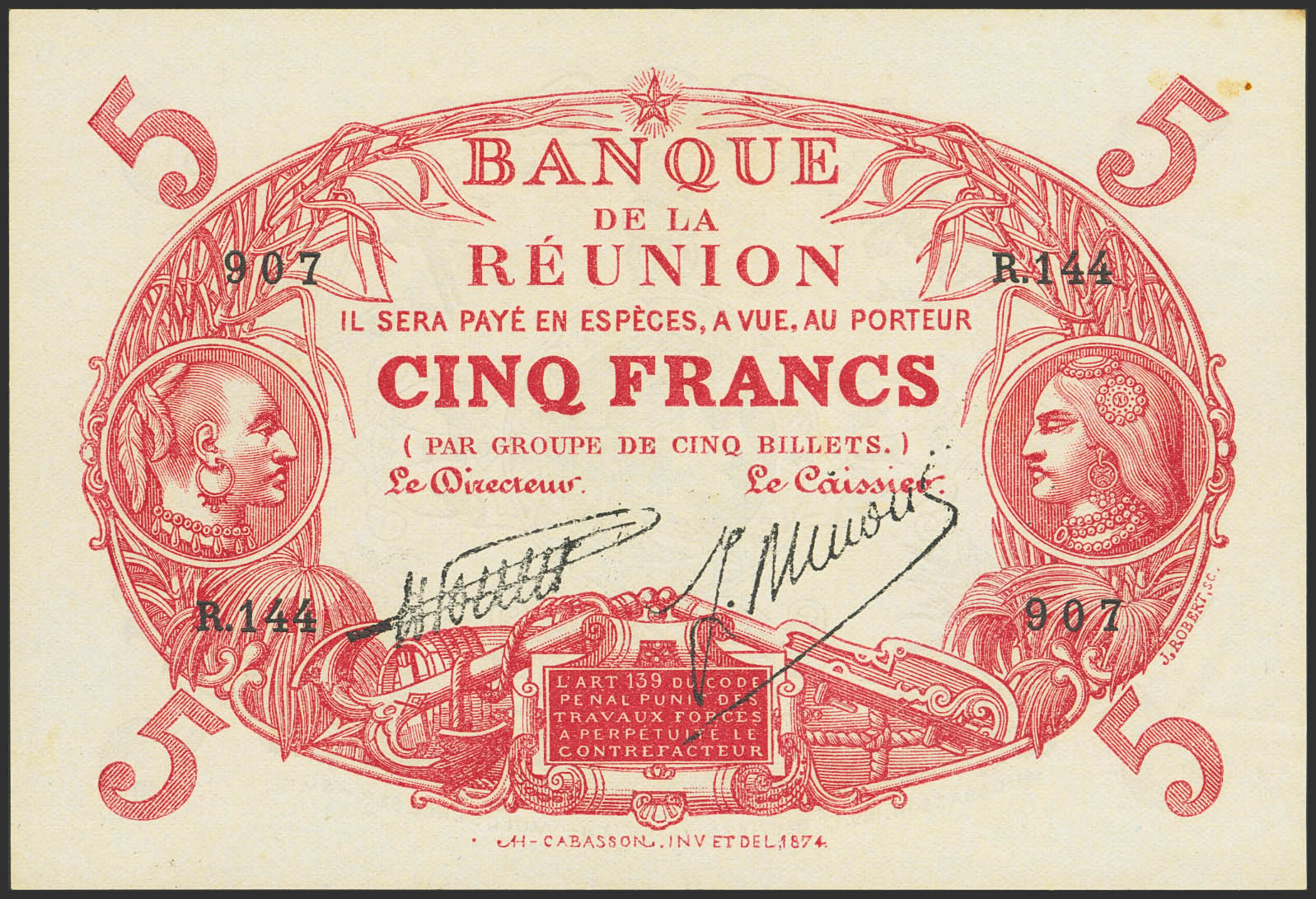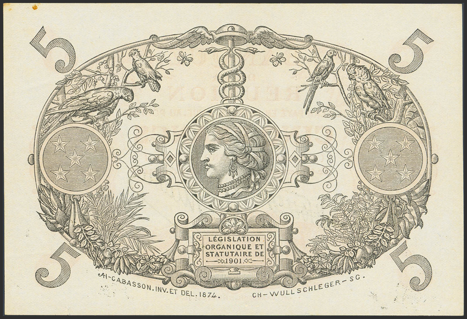 LA REUNION. 5 Francs. (1916ca). (Pick: 14). Very rare, especially in this quality, stains. Less than Uncirculated.