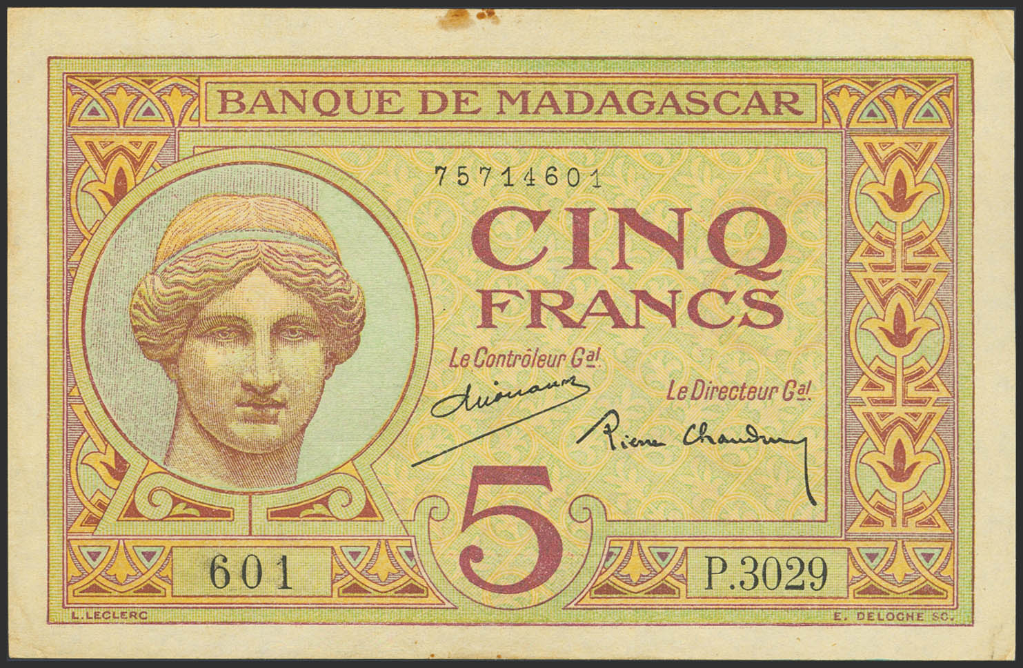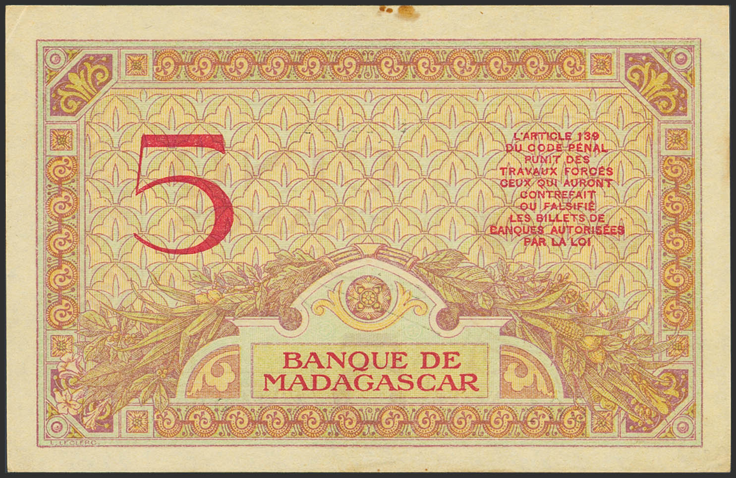 MADAGASCAR. 5 Francs. (1937ca). (Pick: 35). Stain. About Uncirculated.