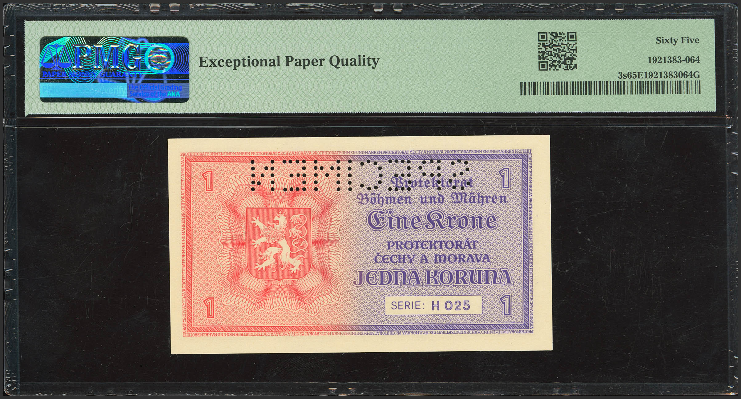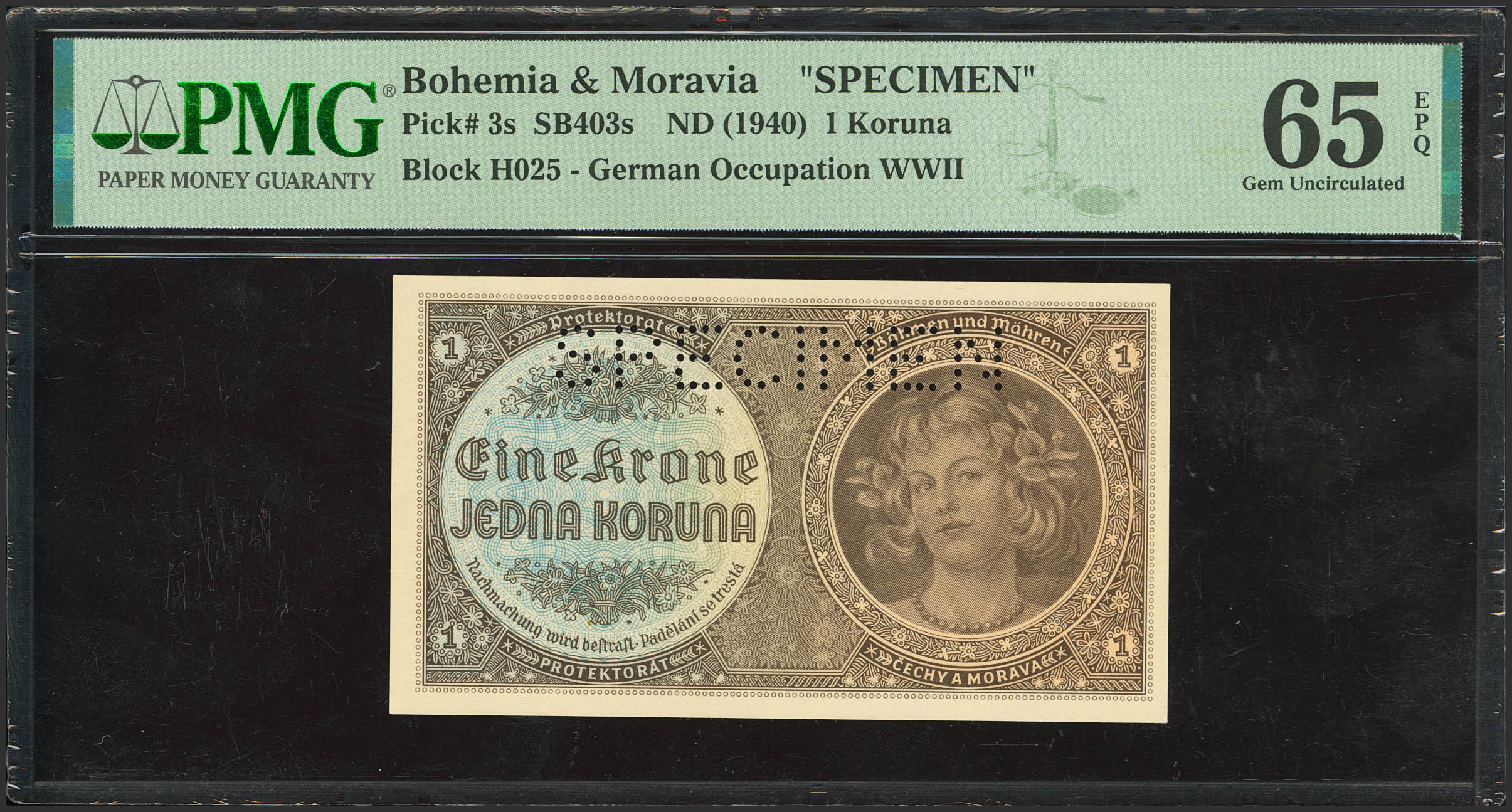 BOHEMIA AND MORAVIA. 1 Koruna. German occupation WWII. 1940. Specimen. (Pick: 3s). PMG65EPQ.