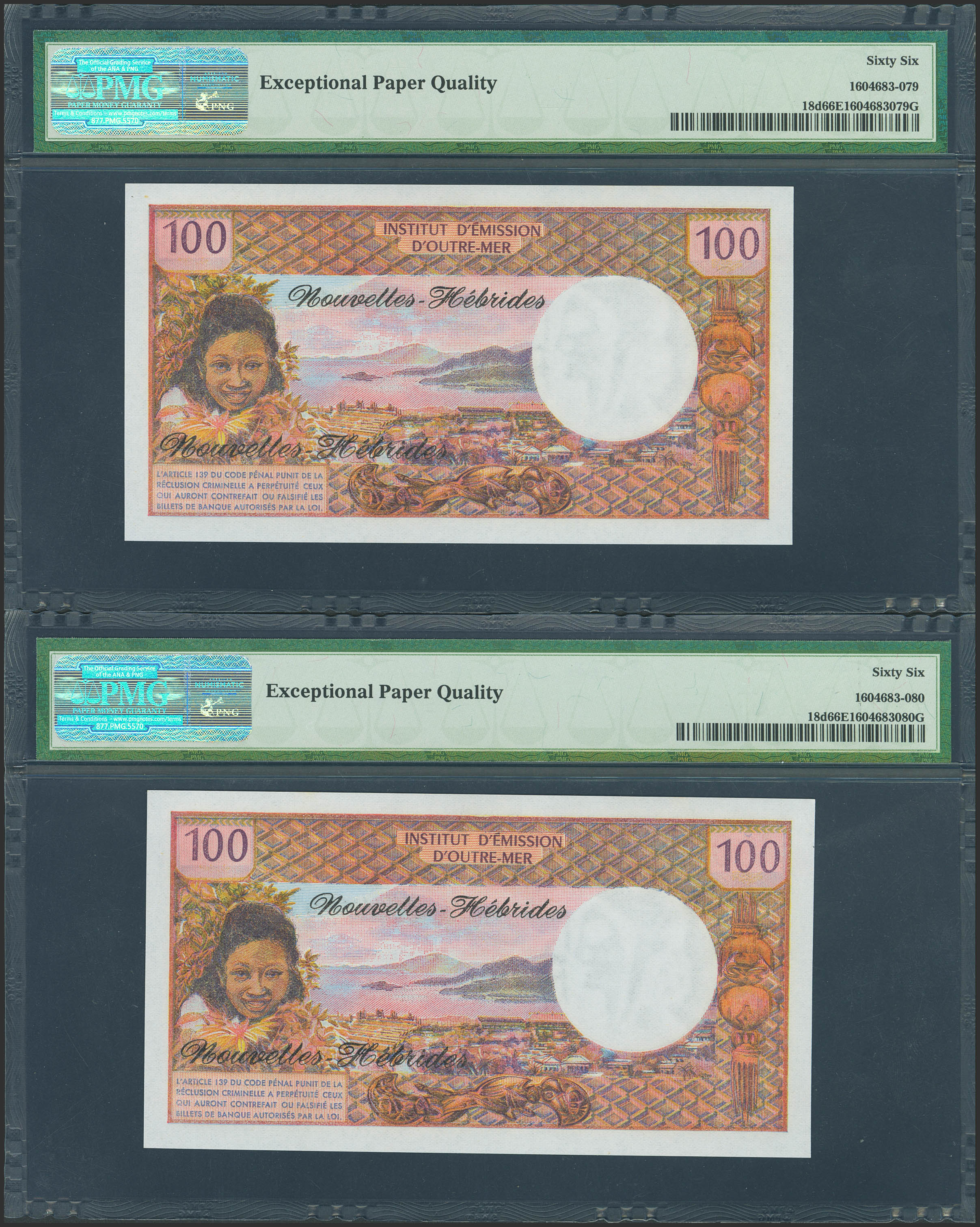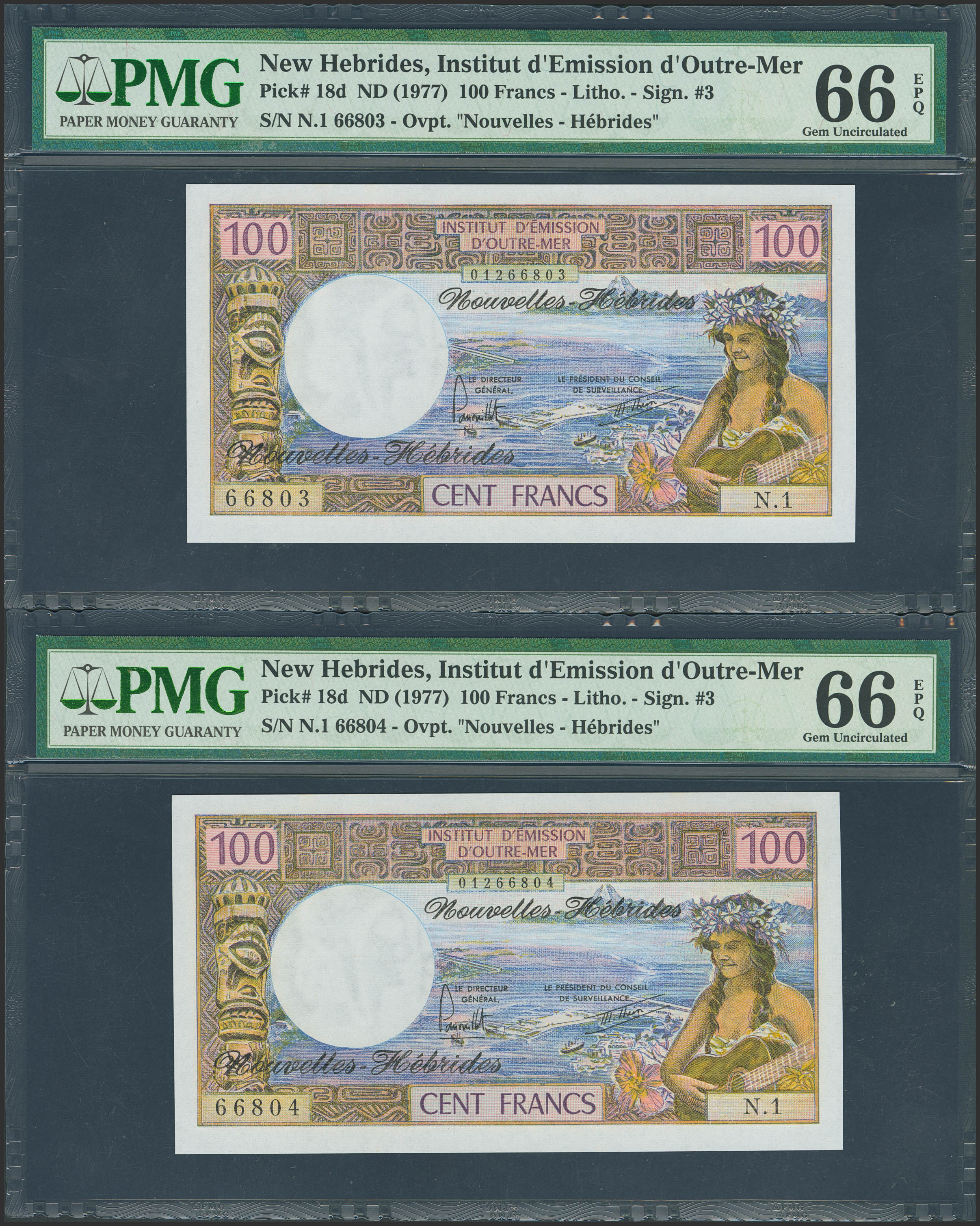 NEW HEBRIDES. 100 Francs. (1977ca). Correlative pair. (Pick: 18d). PMG66EPQ, both.