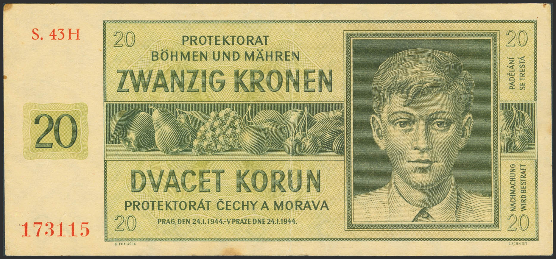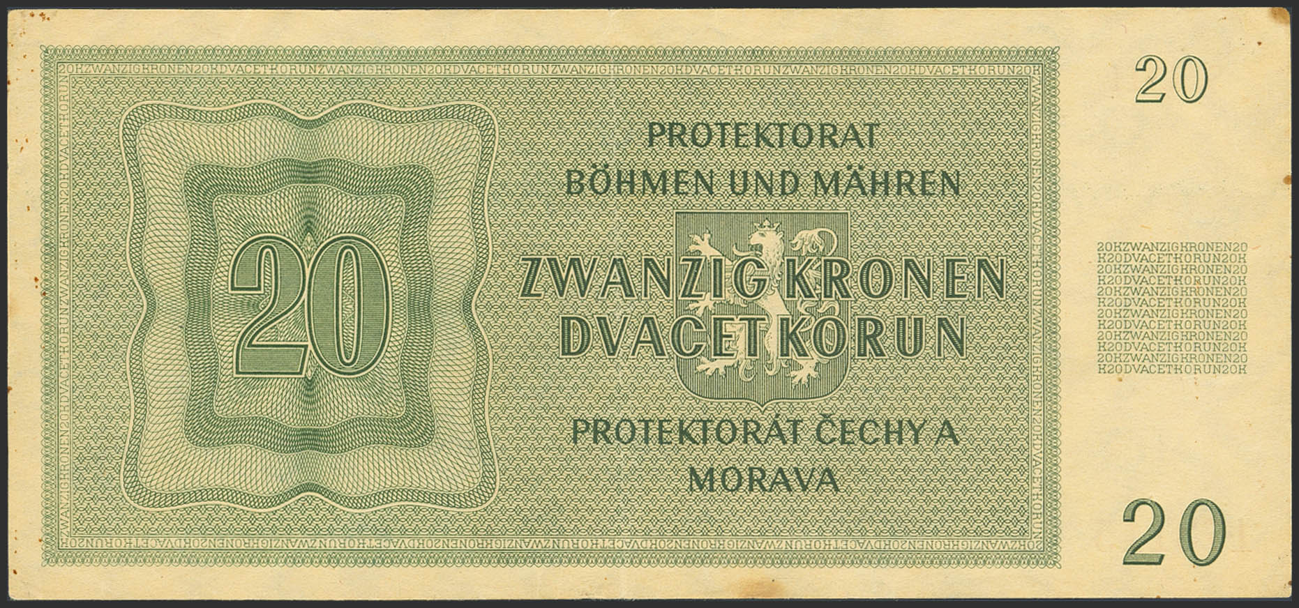 BOHEMIA AND MORAVIA. 20 Korun. 24 January 1944. (Pick: 9a). Less than Extremely Fine.