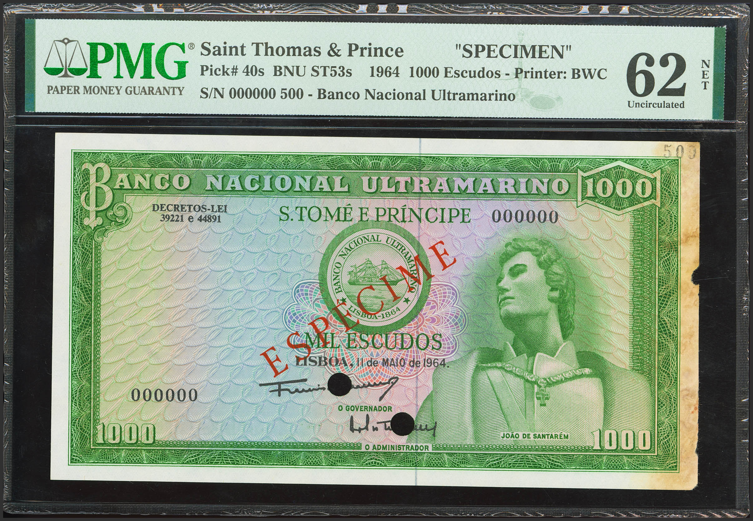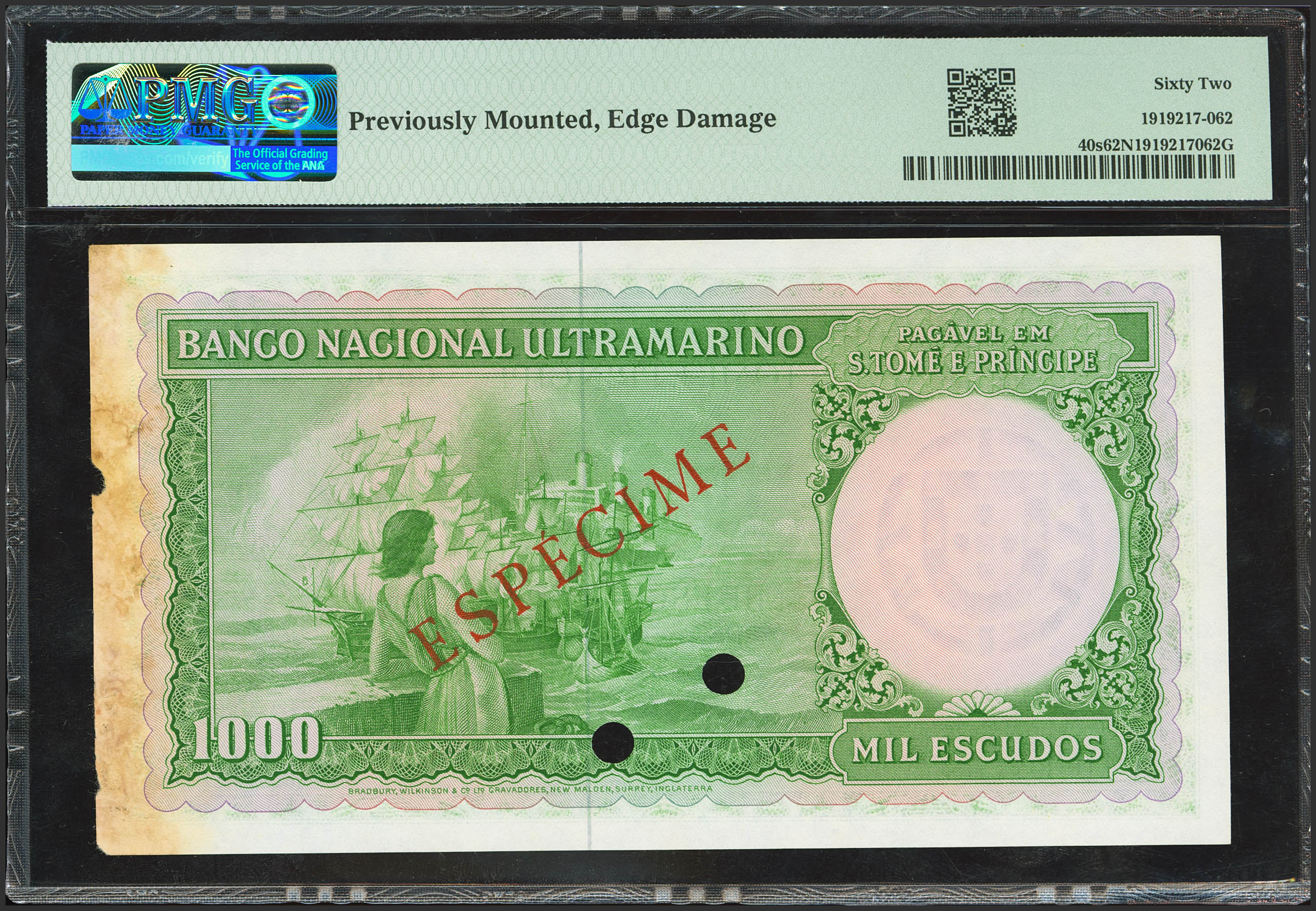 SAINT THOMAS AND PRINCE. 1000 Escudos. Portuguese administration. 1964. Specimen. (Pick: 40s). PMG62NET (previously mounted, edge damage).