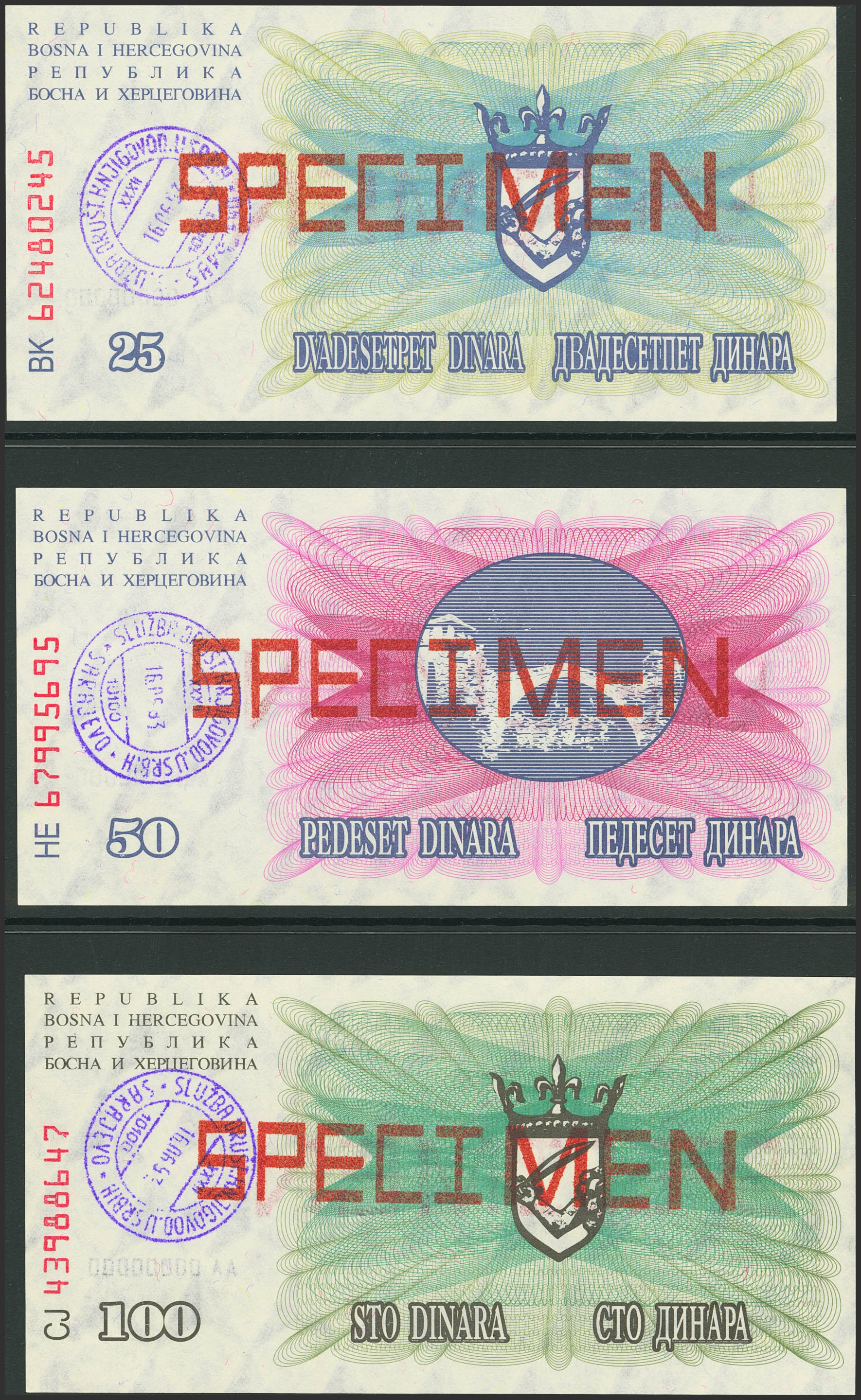 Set of 3 Banknotes from Bosnia and Herzegovina of 25 Dinara, 50 Dinar and 100 Dinara. 1992 and SPECIMEN. (Pick: 11s, 12s, 13s). Uncirculated.