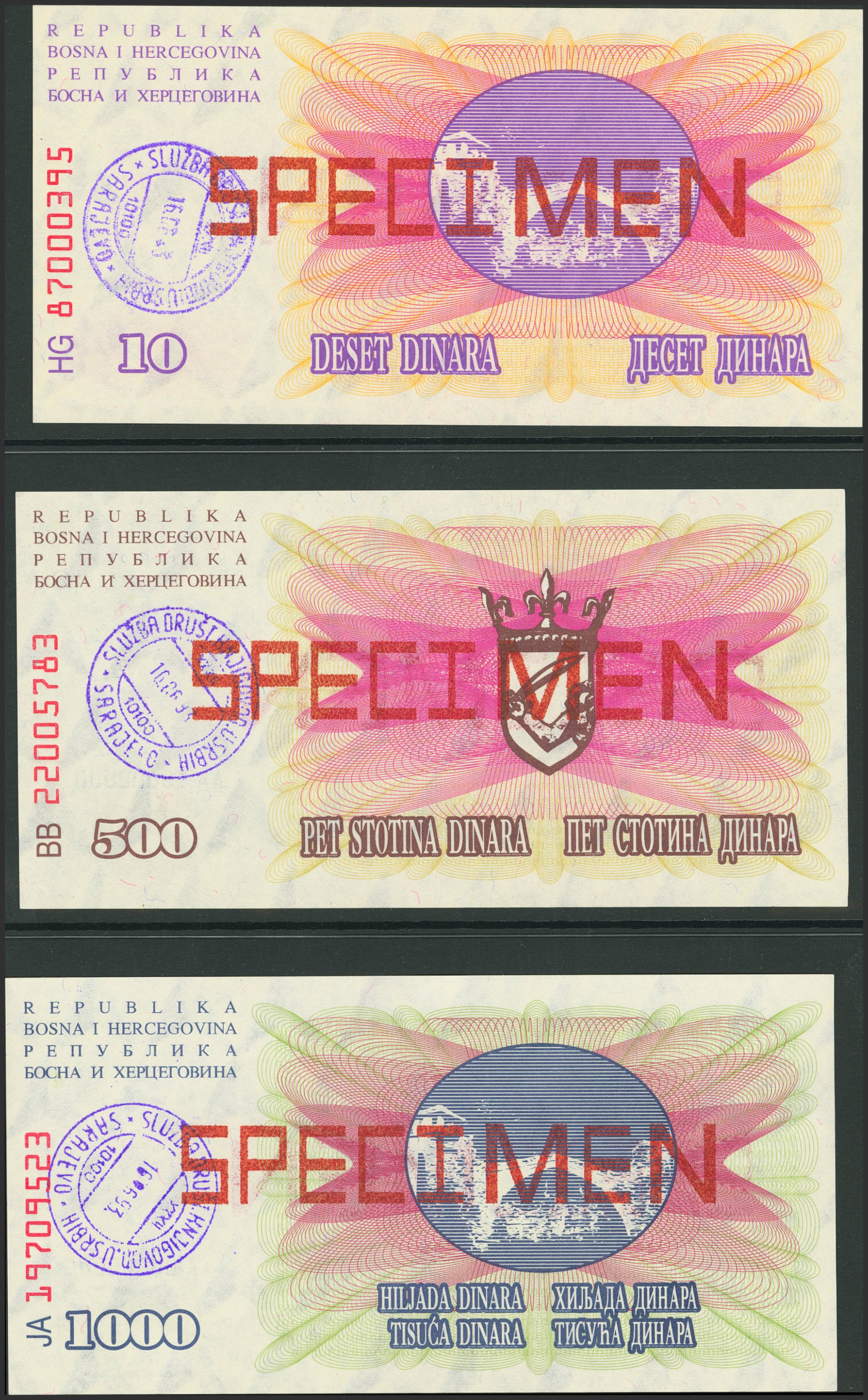 Set of 3 Banknotes from Bosnia and Herzegovina of 10 Dinara, 500 Dinar and 1000 Dinara. 1996 and SPECIMEN. (Pick: 41s, 45s, 46s). Uncirculated.
