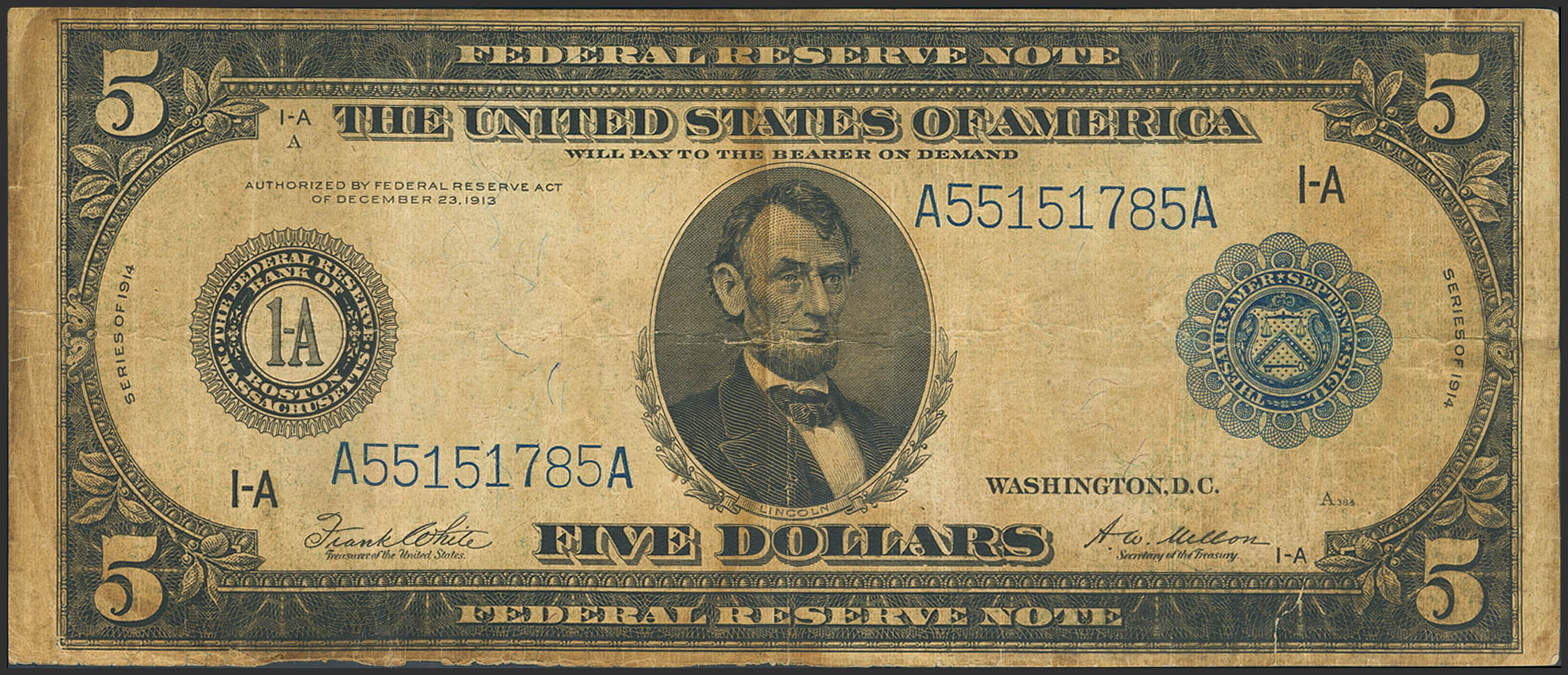 UNITED STATES. 5 Dollars. 1914. (Pick: 359b). Less than Fine.