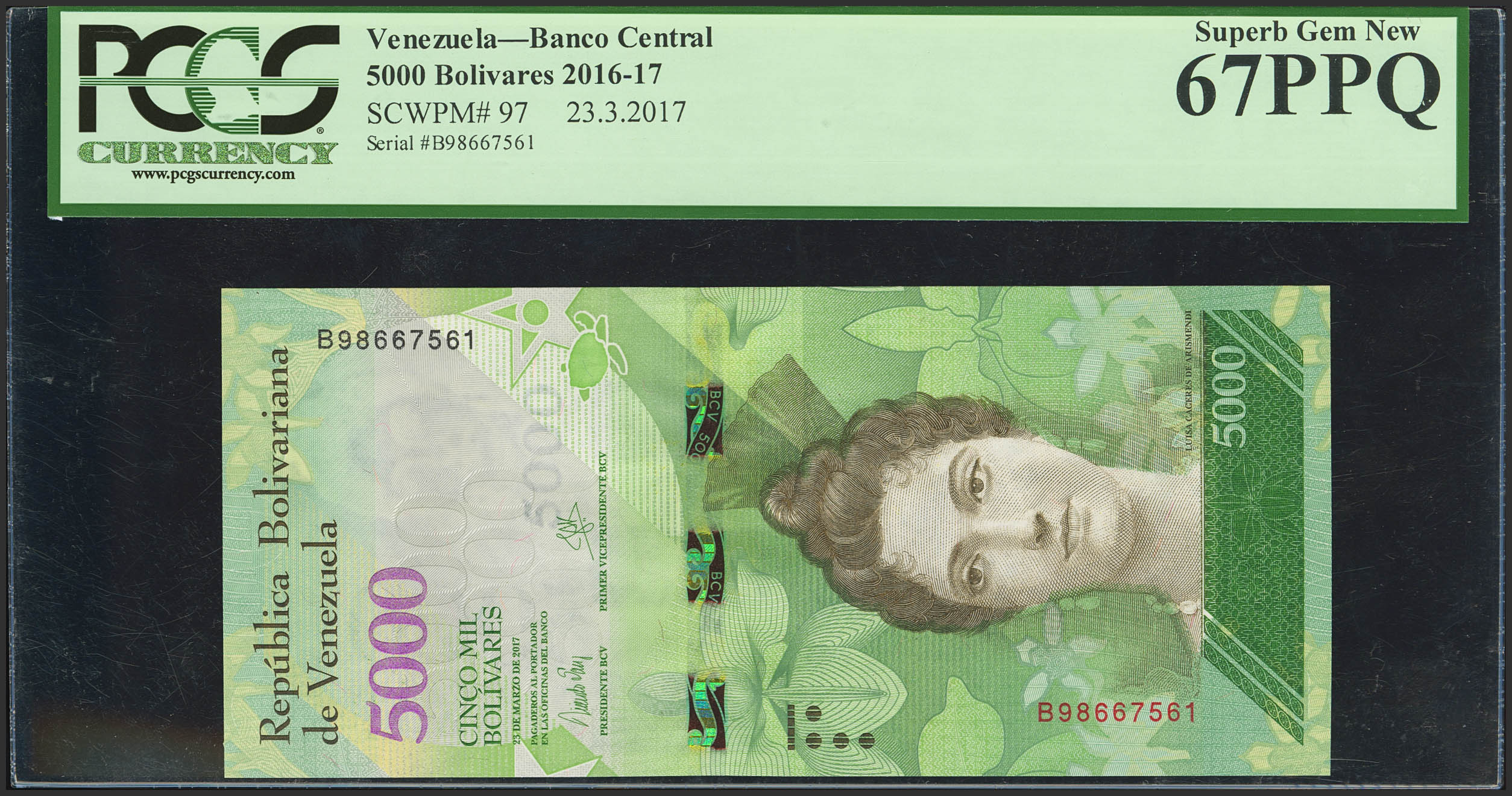 VENEZUELA. 5000 Bolivares. 23 March 2017. (Pick: 97). PCGS67PPQ.