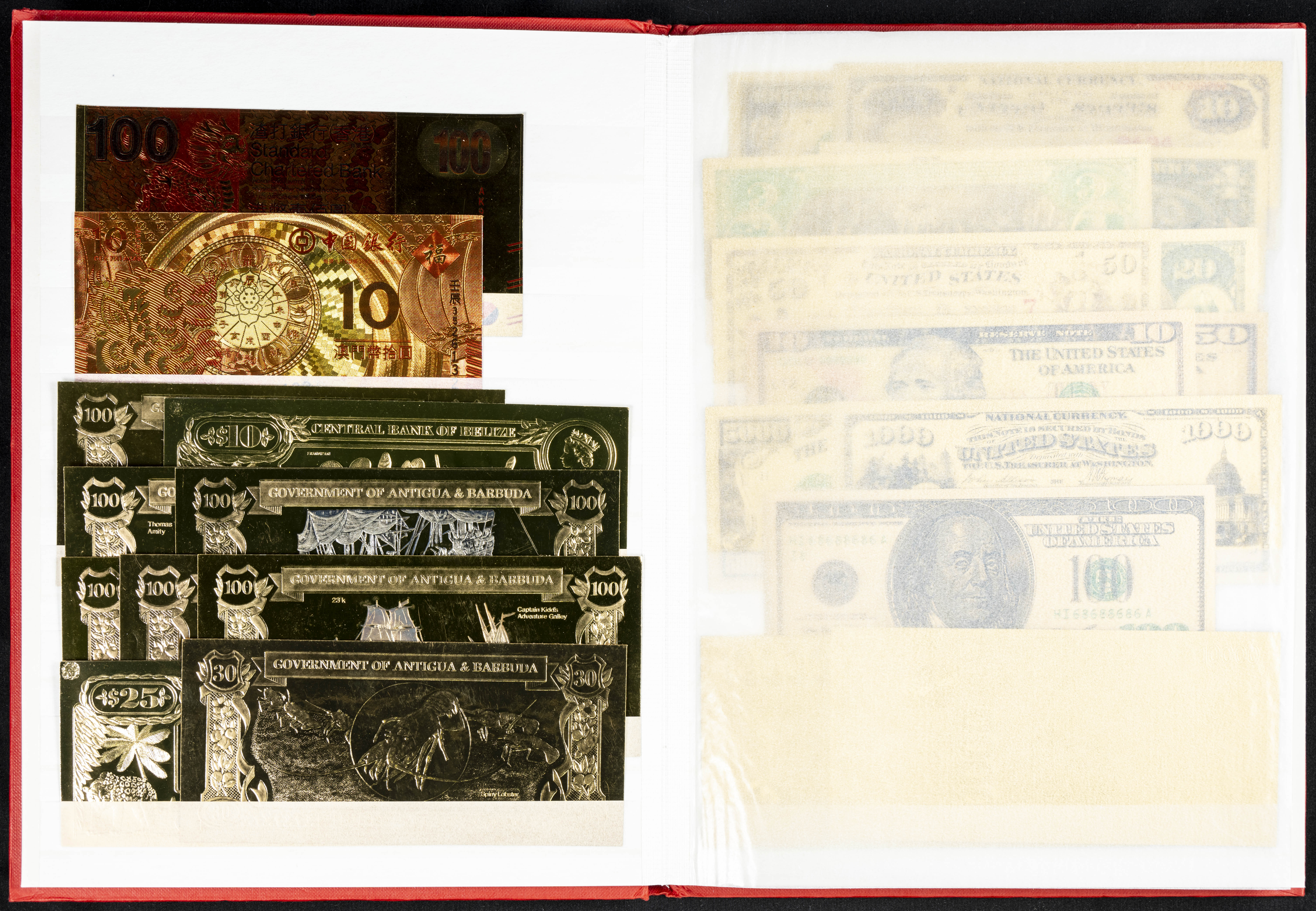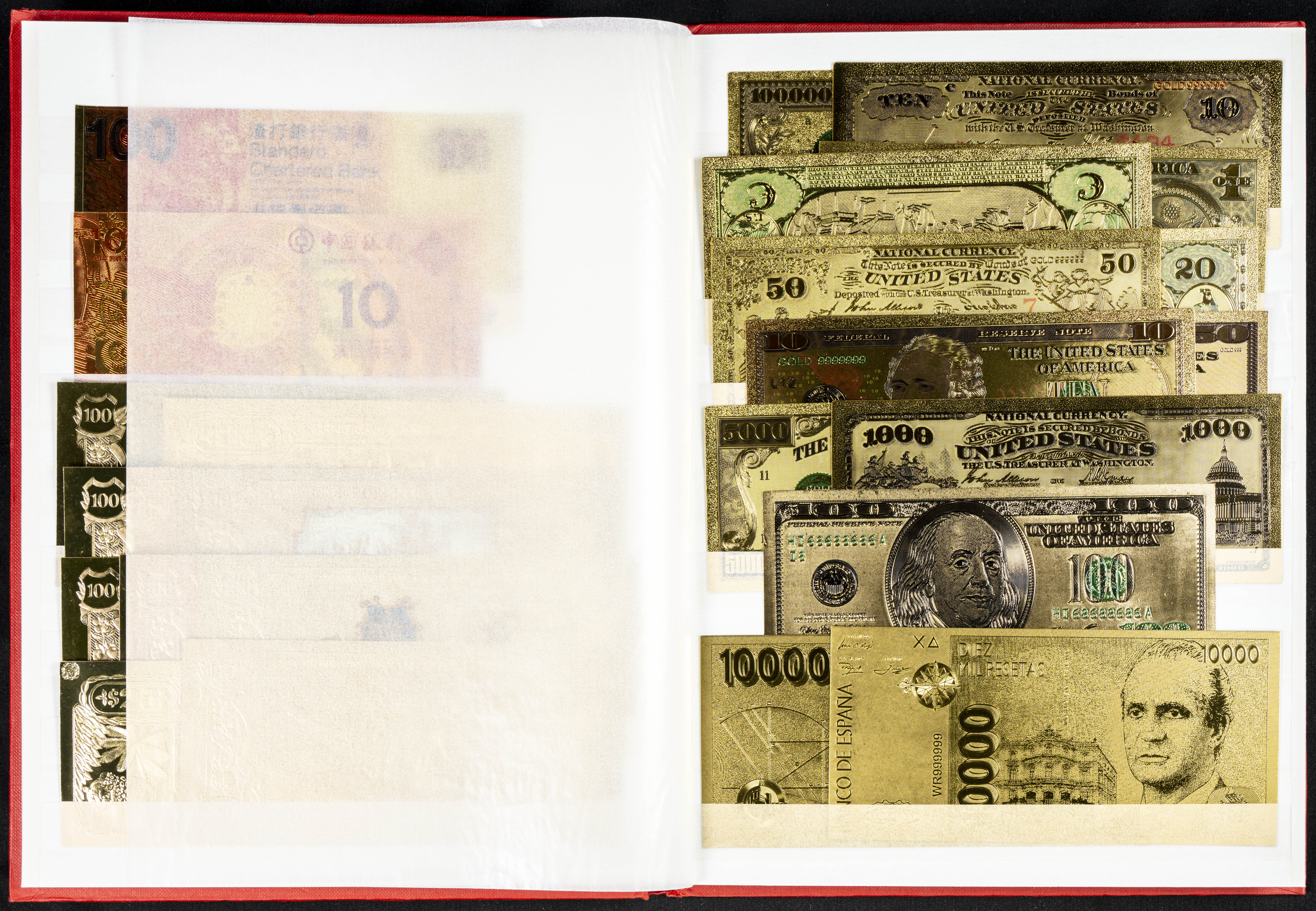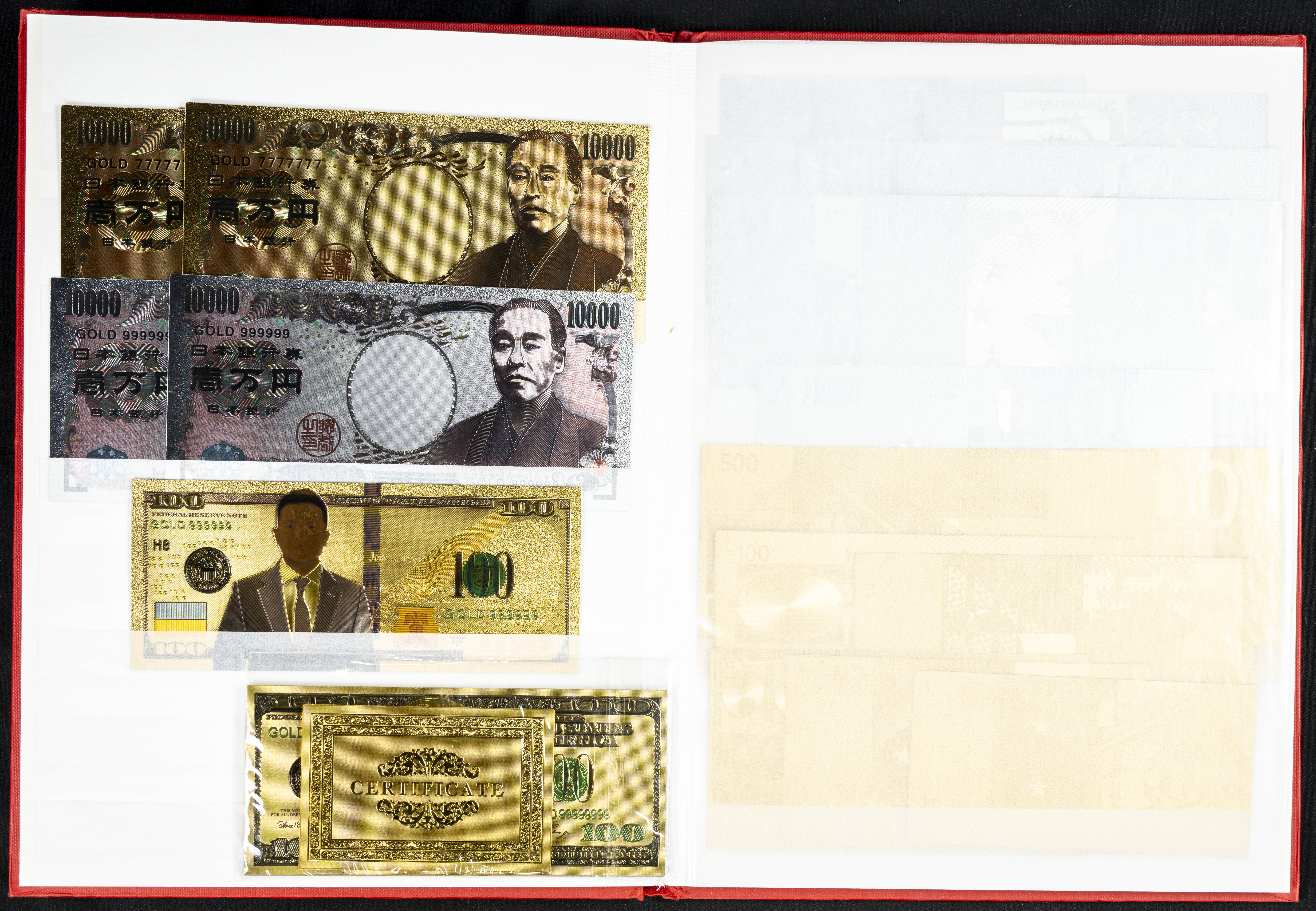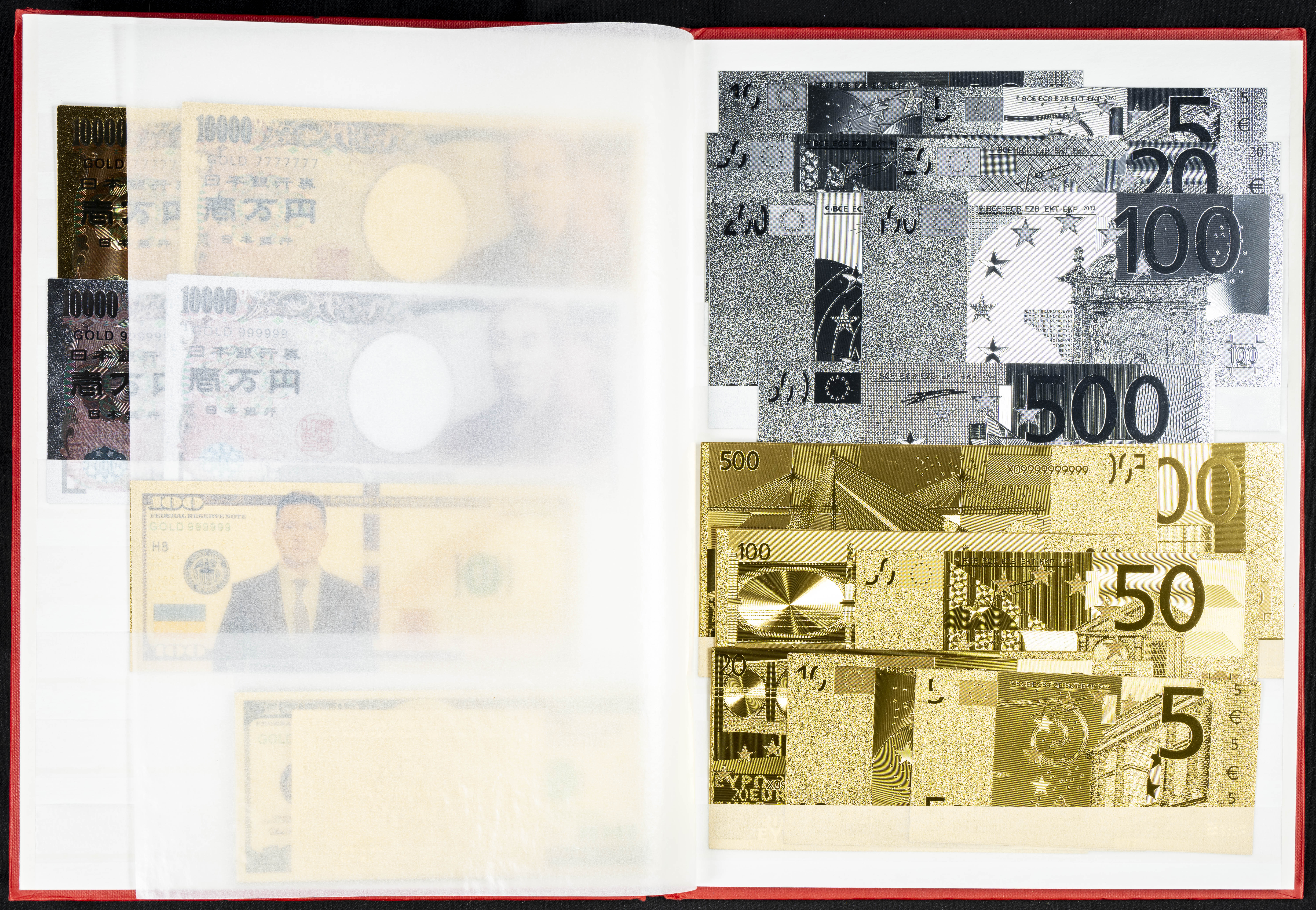 Set of reproductions of banknotes from around the world, printed on thin gold or silver foil, including euro banknotes. TO EXAM.