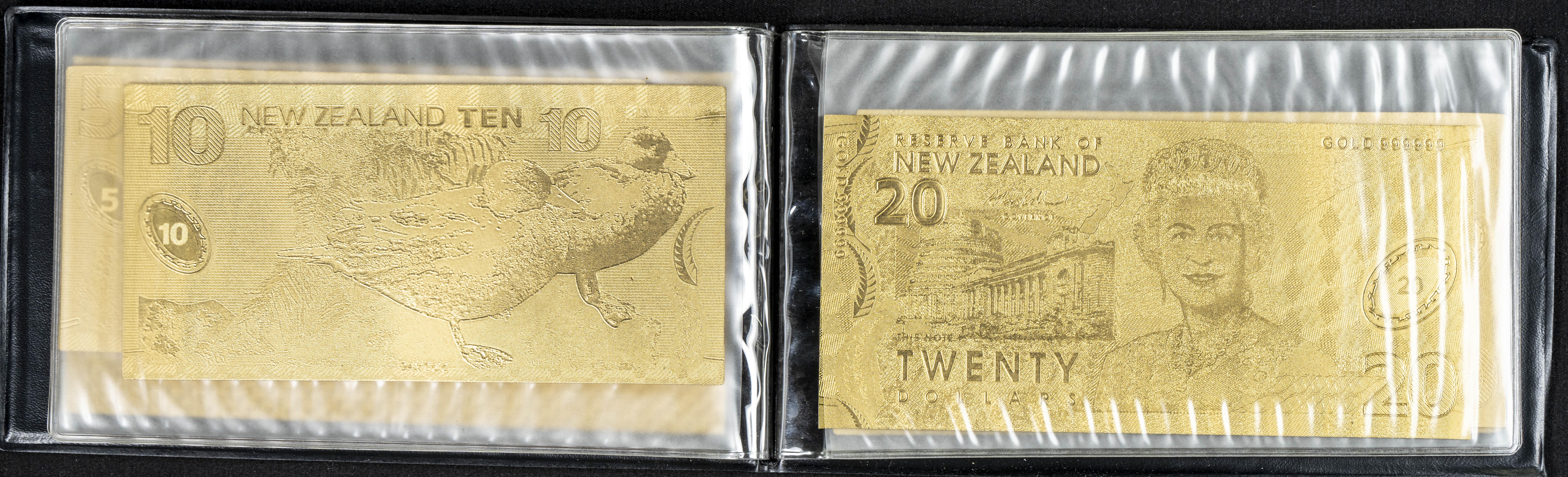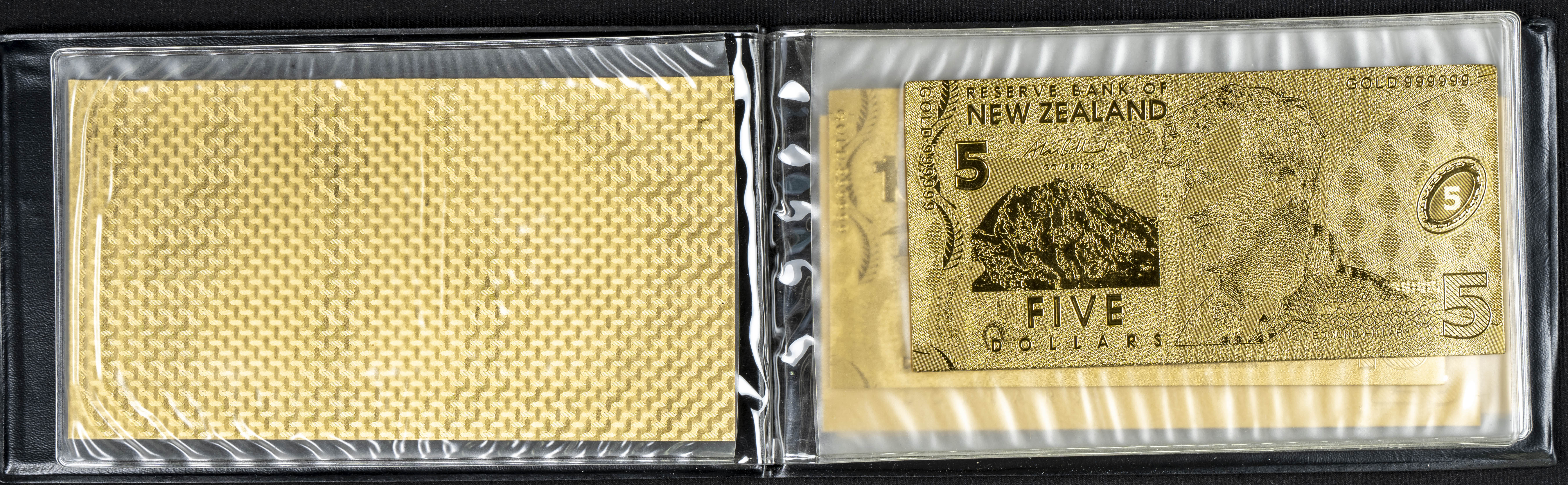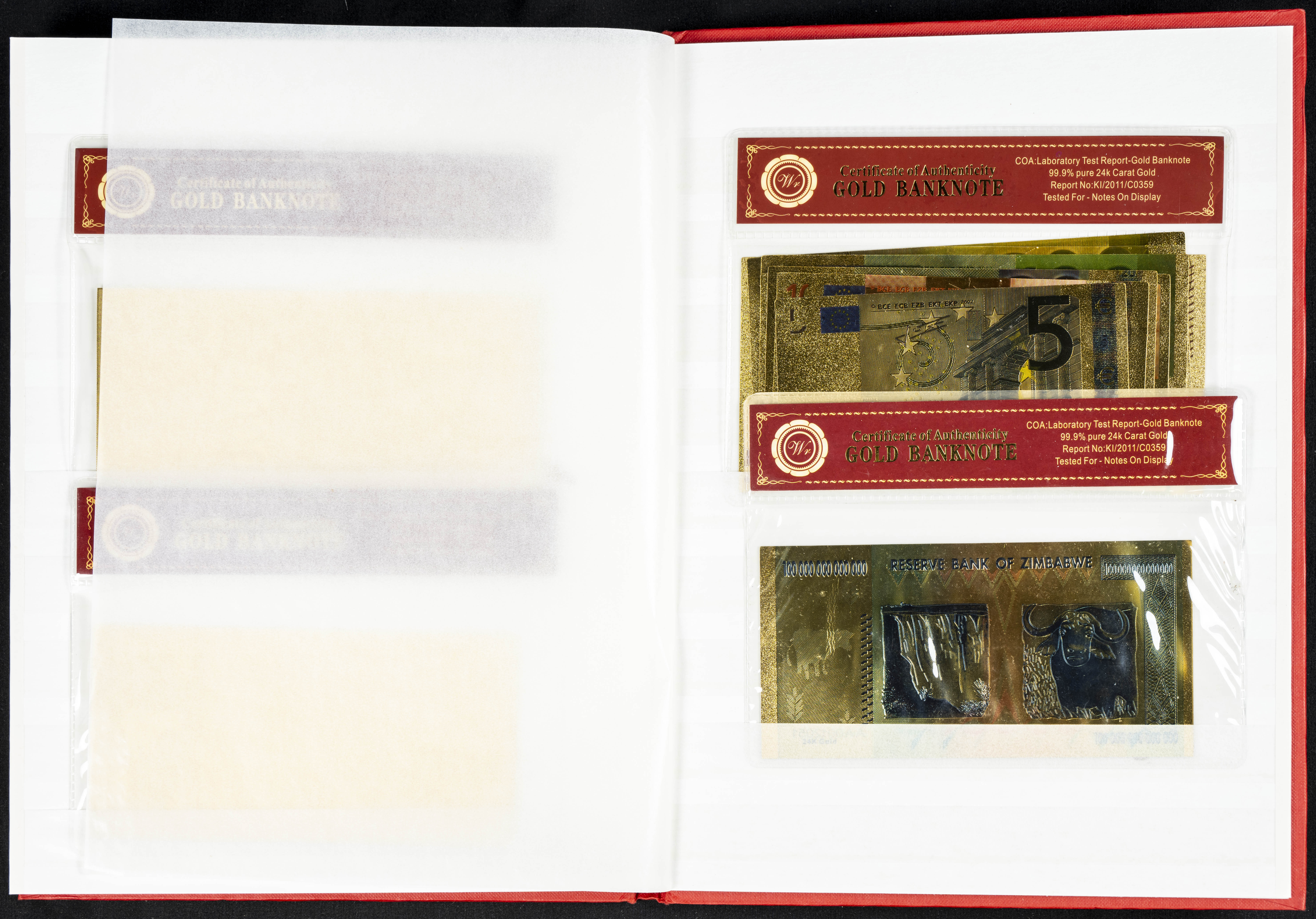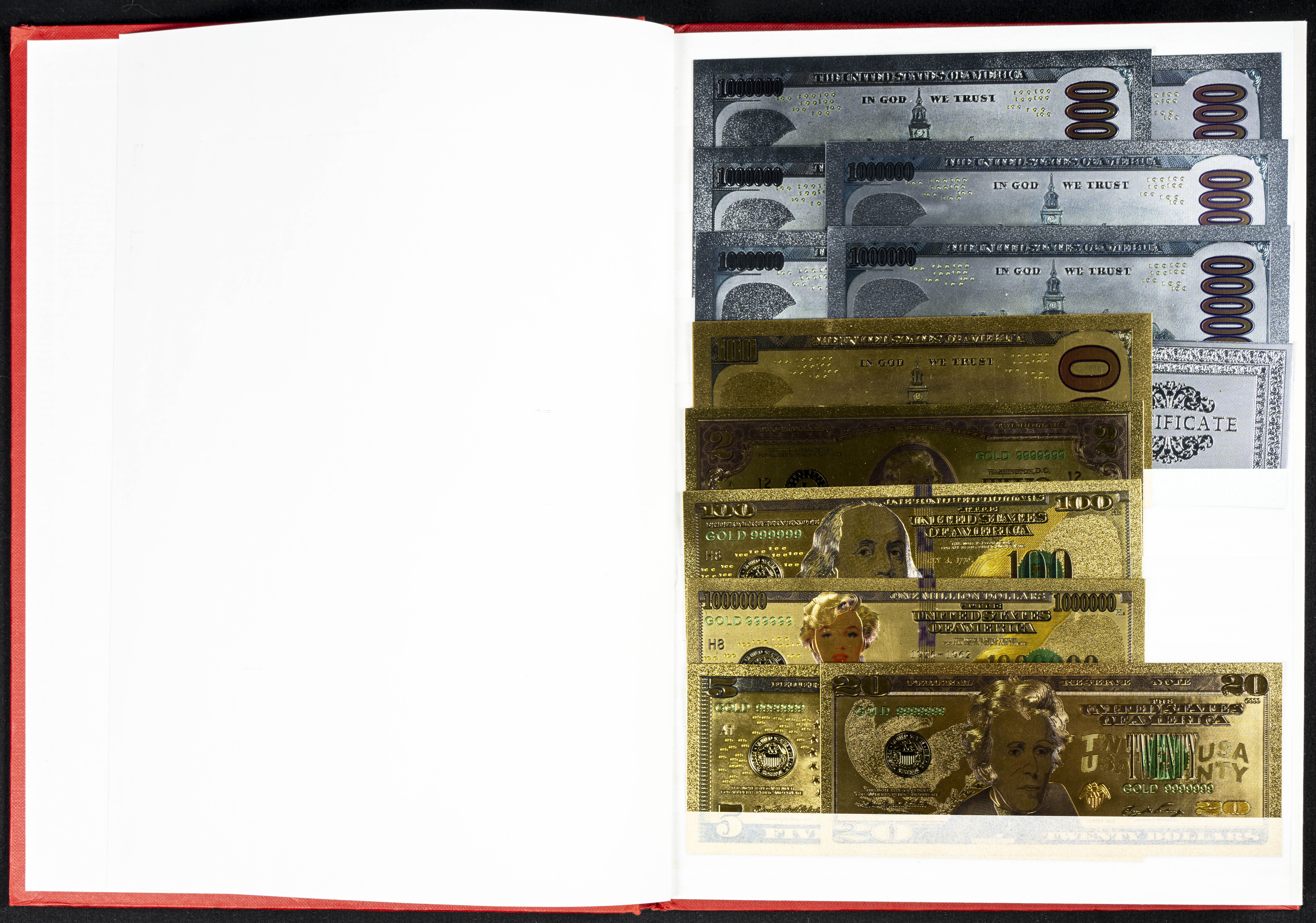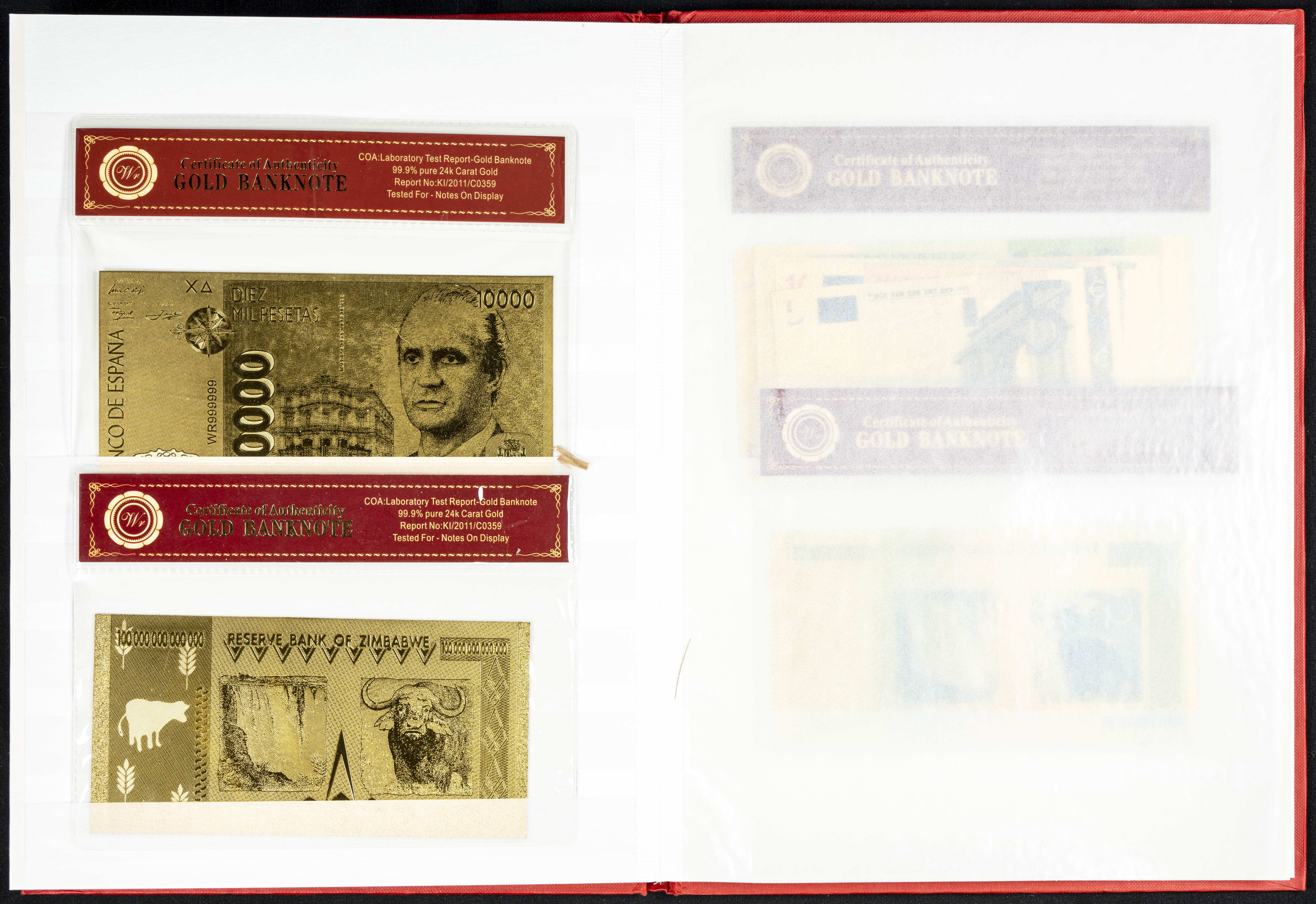 Set of reproductions of banknotes from around the world, printed on thin gold or silver foil, including euro banknotes. TO EXAM.