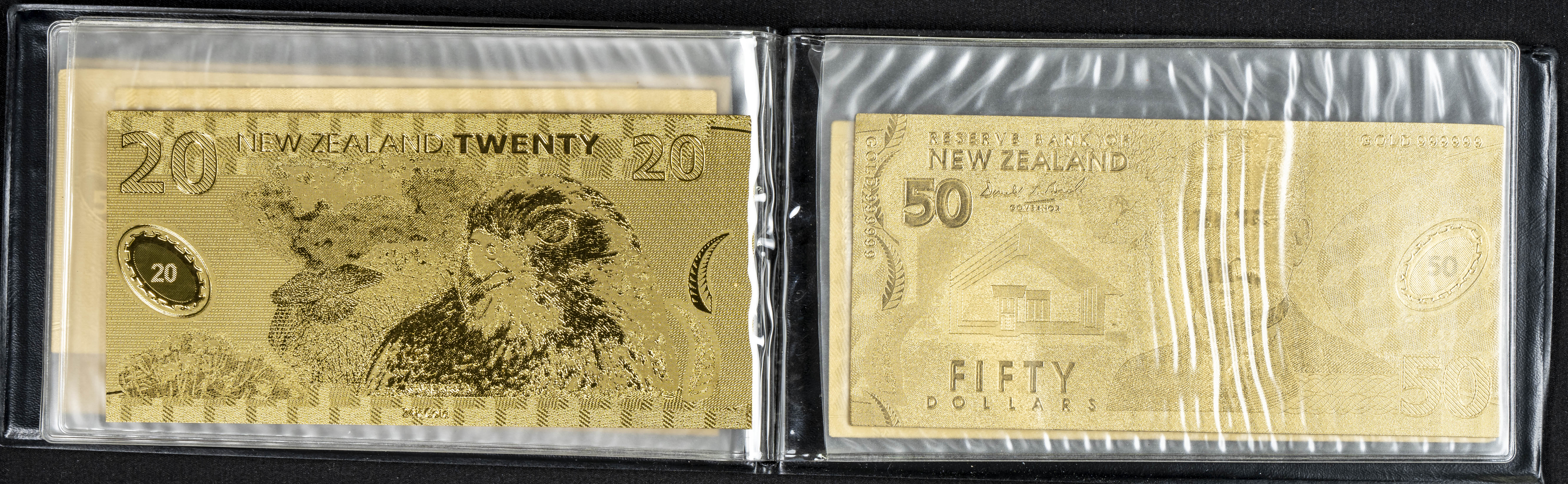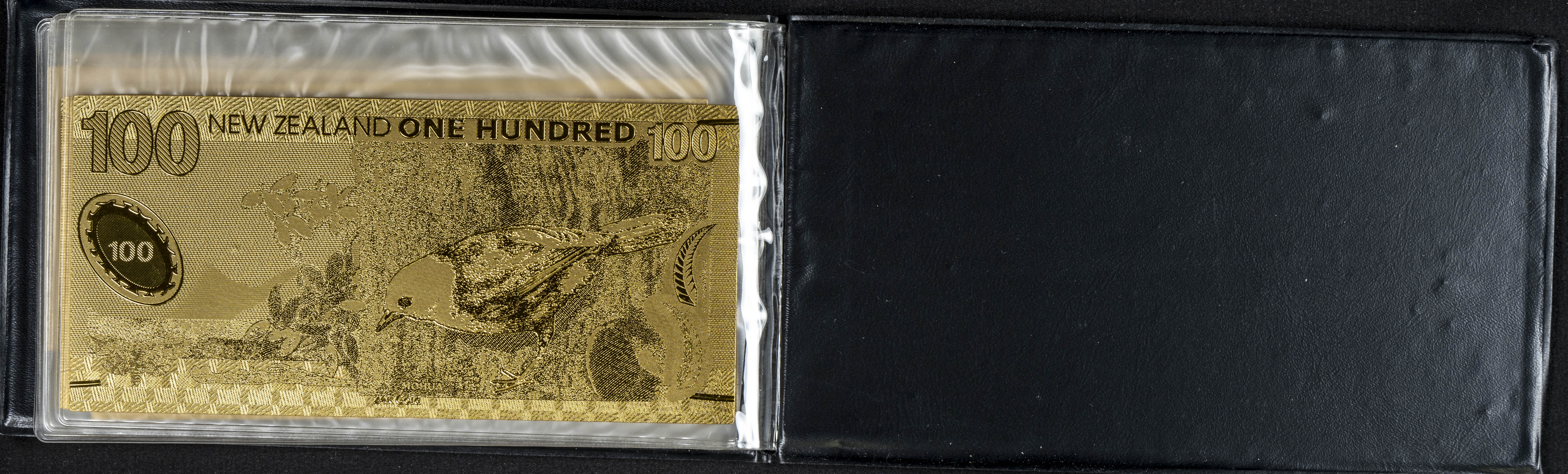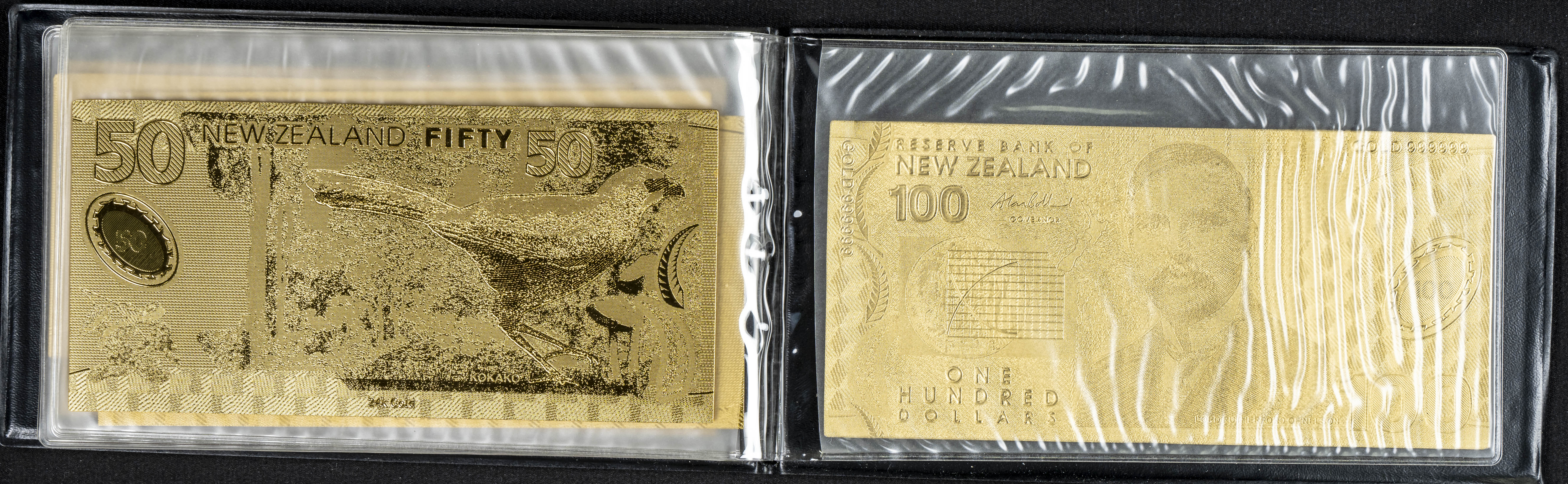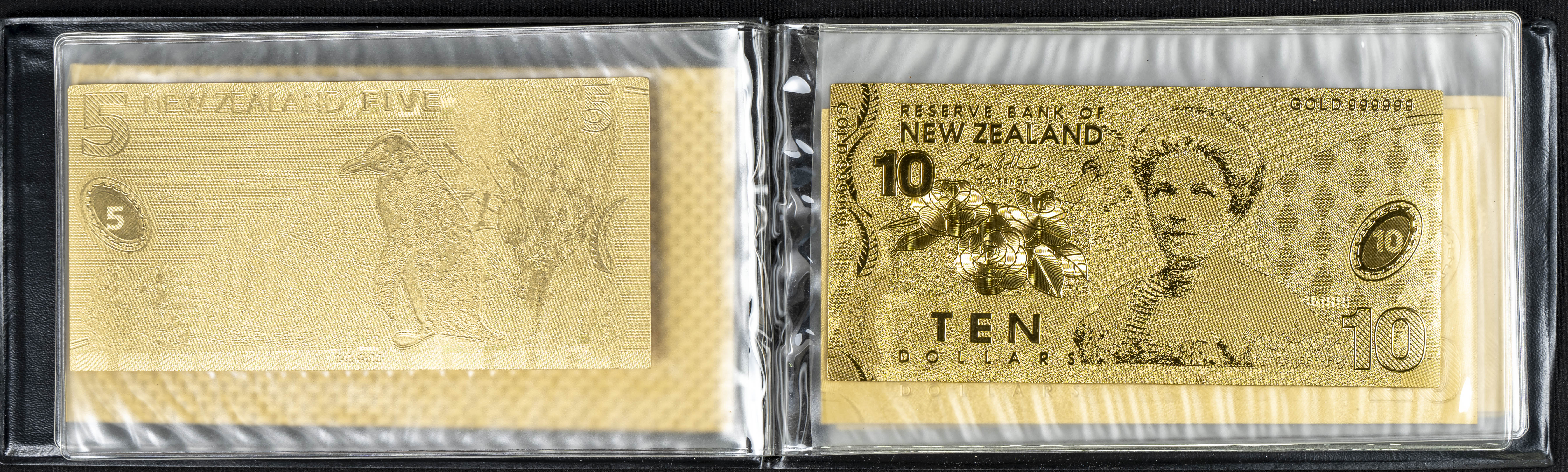 Set of reproductions of banknotes from around the world, printed on thin gold or silver foil, including euro banknotes. TO EXAM.
