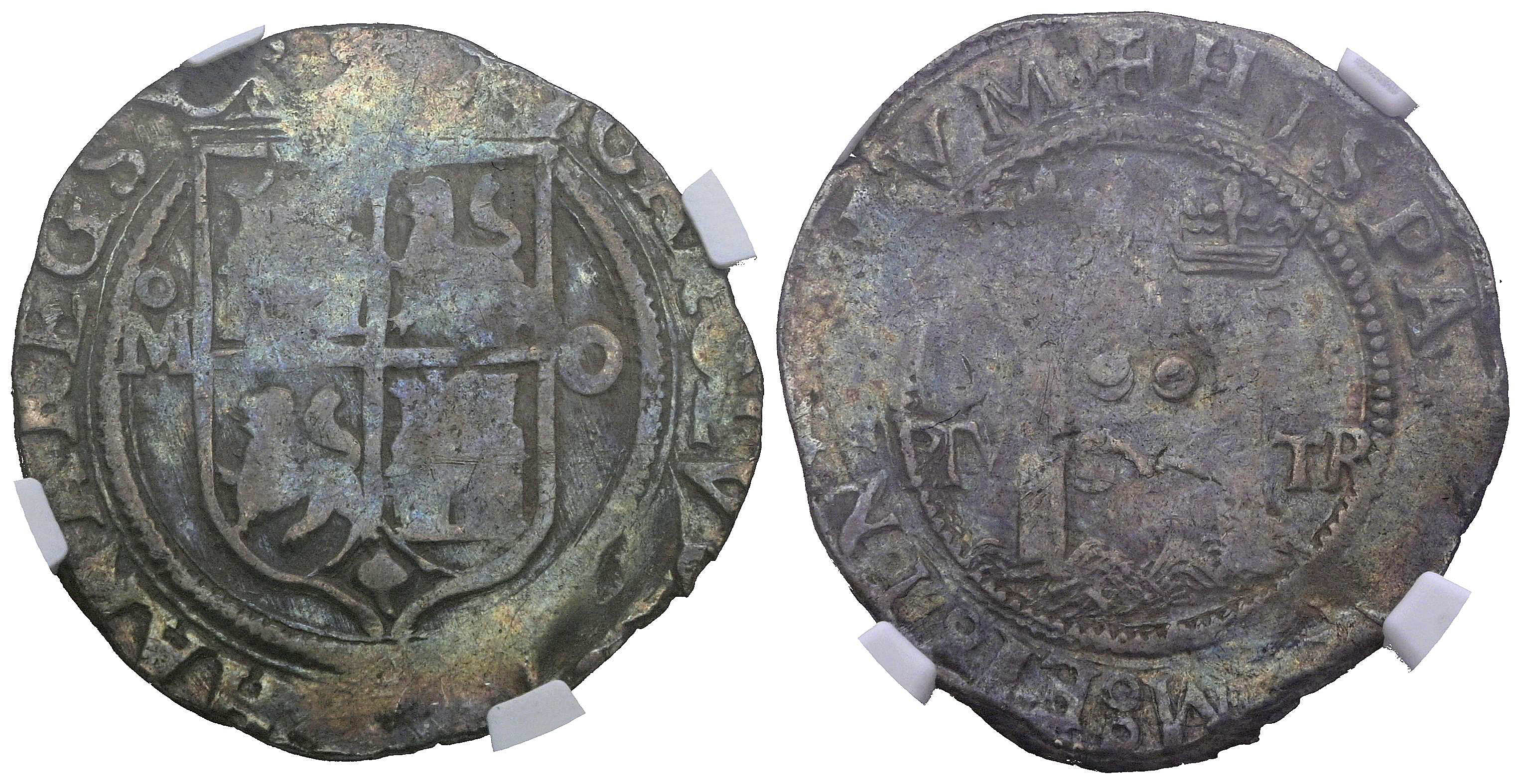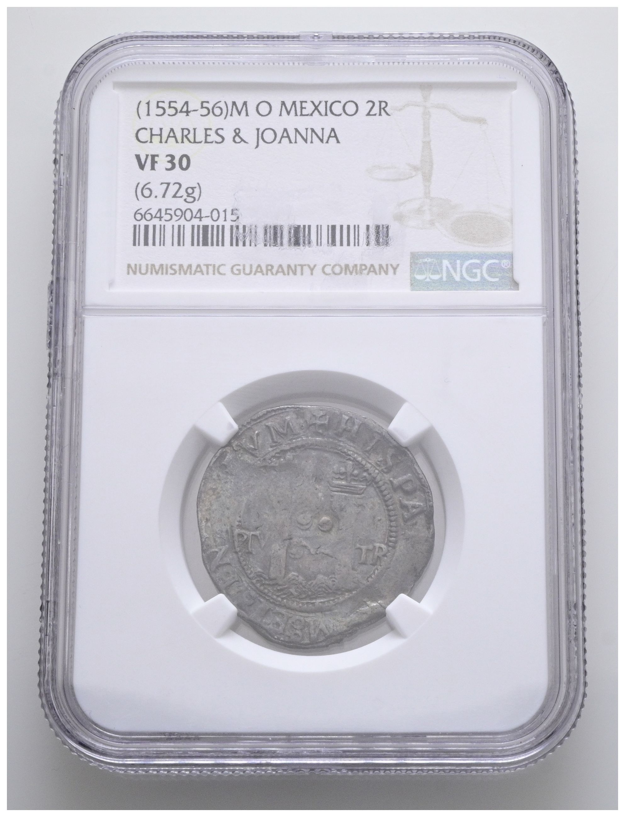 JUANA Y CARLOS (1504-1555). 2 Reales. (Ar. 6,72g/26mm). S/D (1554-1556). México M-O. (Cal-2019-103). Encapsulada por NGC VF 30.