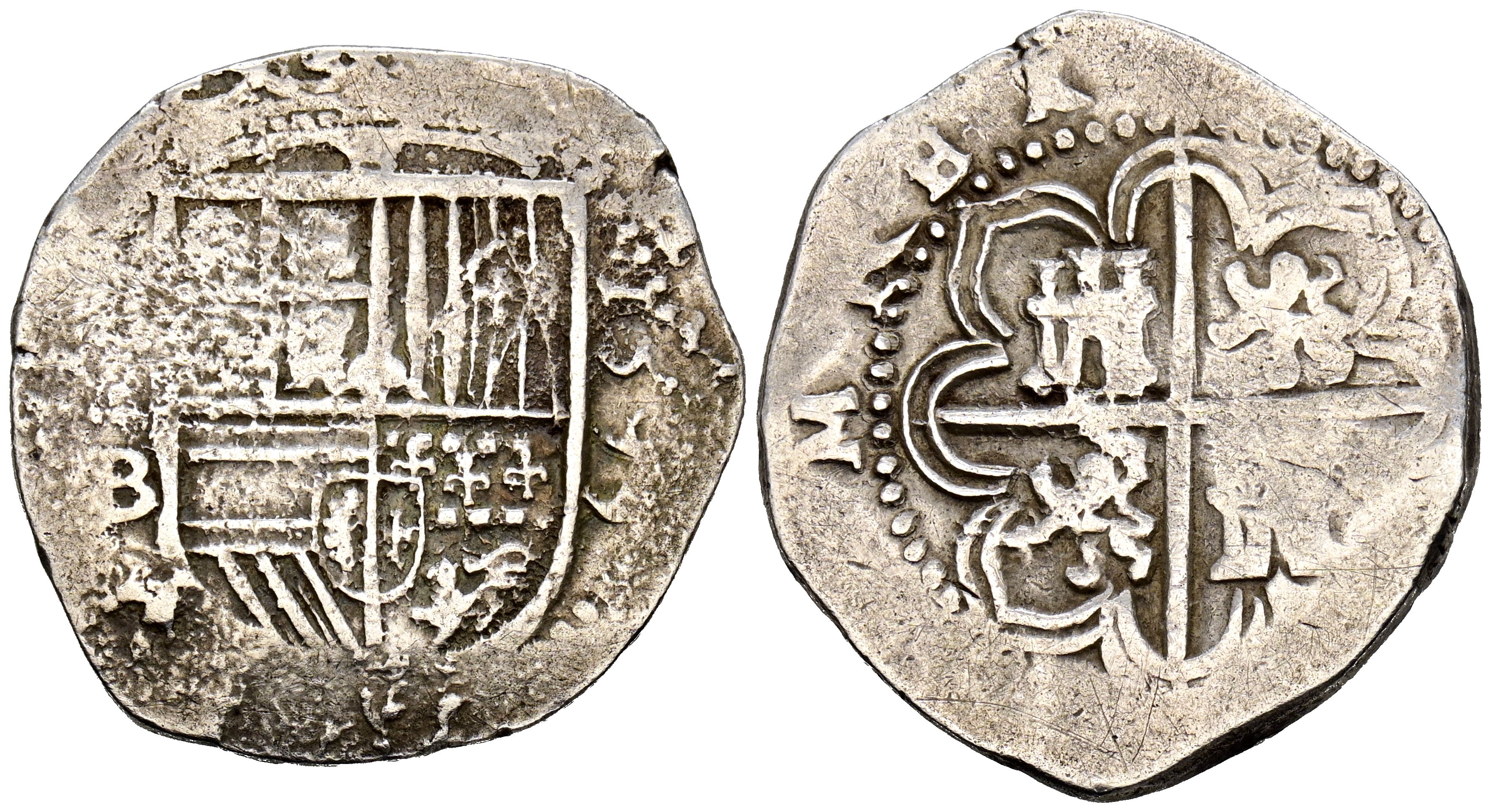 FELIPE II (1556-1598). 2 Reales. (Ar. 6,77g/25mm). 1593. Sevilla B. (Cal-2019-418). Fecha a la derecha del escudo. BC+.