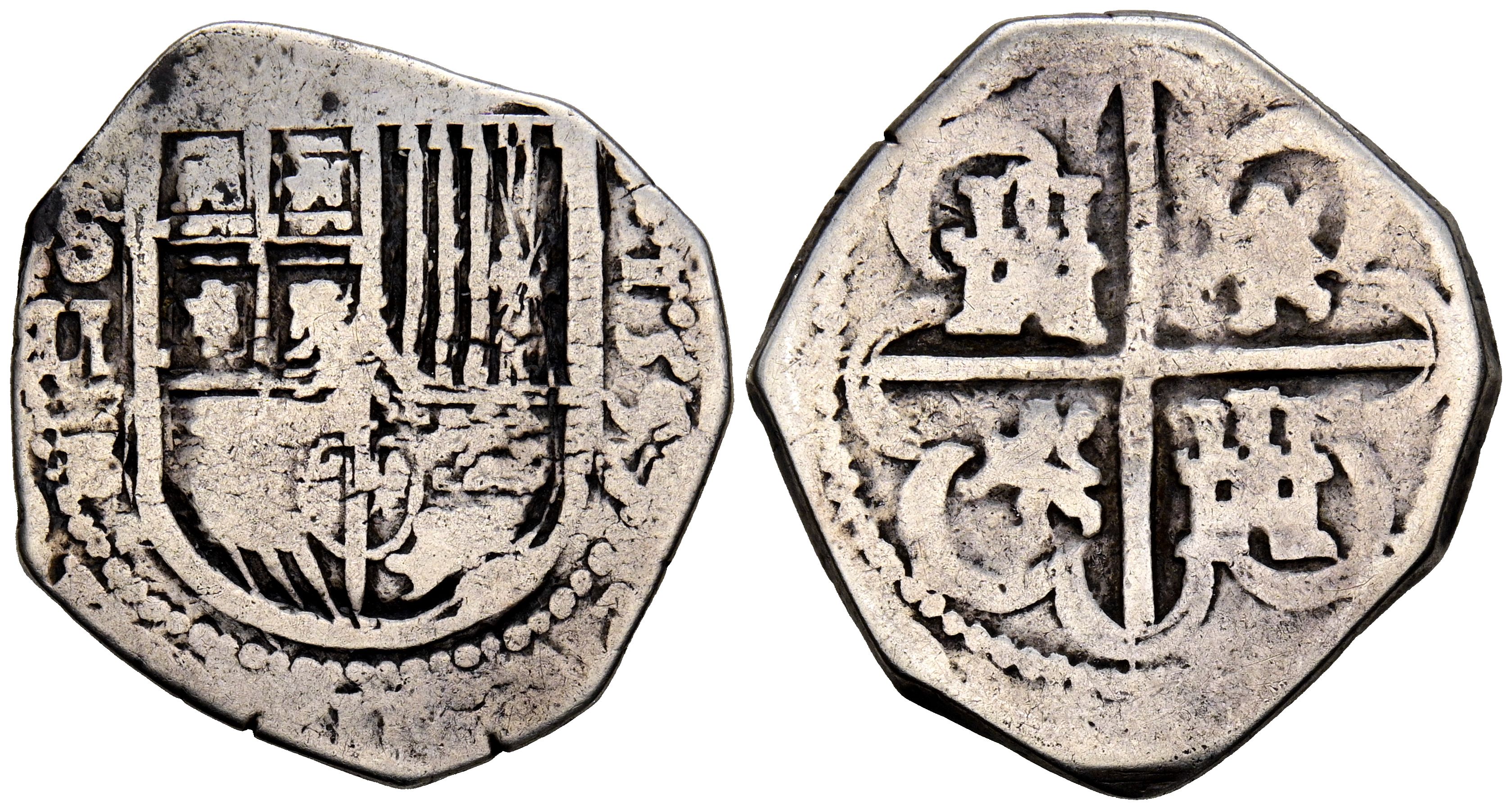 FELIPE II (1556-1597). 2 Reales. (Ar. 6,59g/23mm). 1597. Sevilla B. (Cal-2019-424). Fecha a la derecha del escudo. BC.