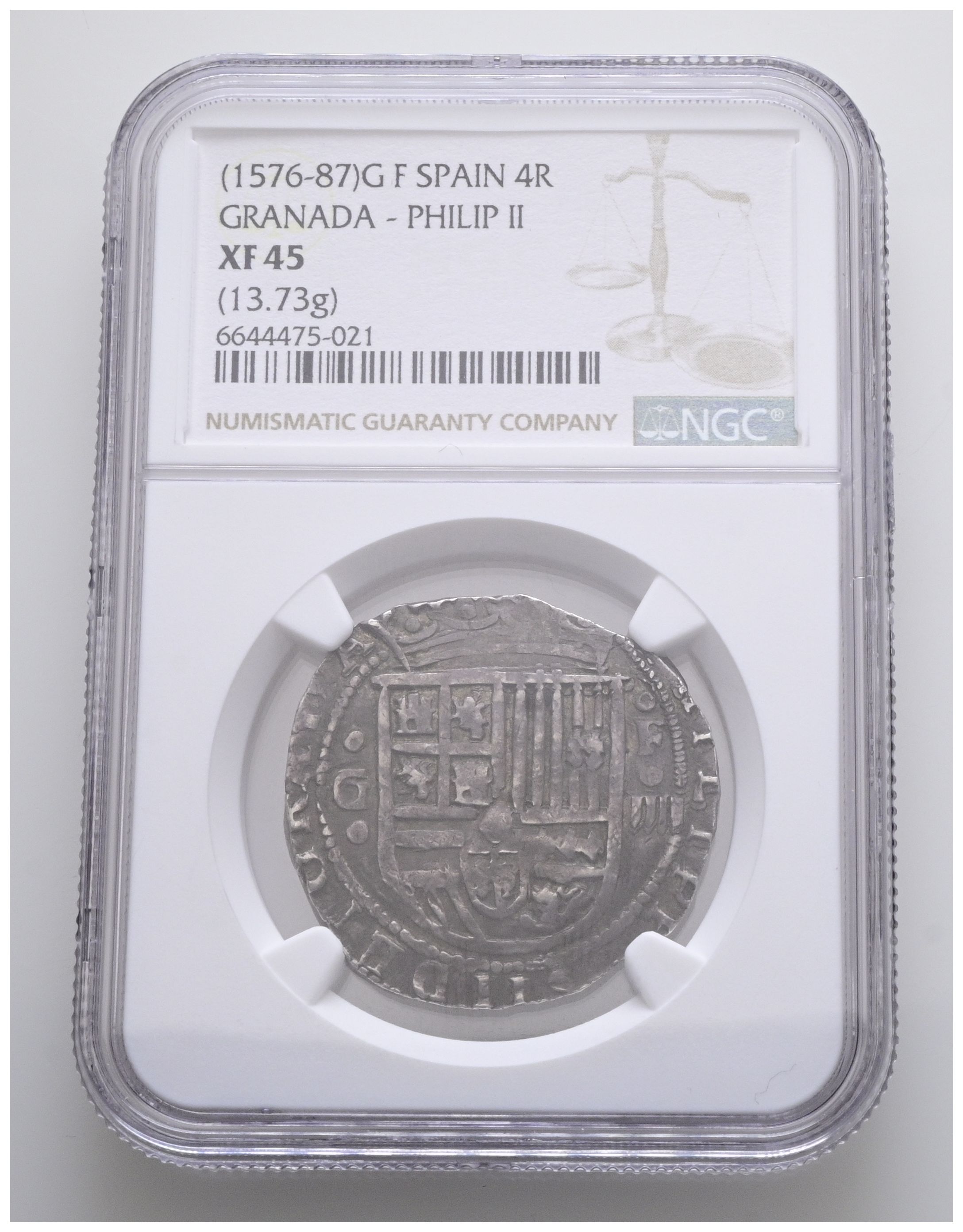FELIPE II (1556-1598). 4 Reales. (Ar. 13,73g/31mm). S/D (entre 1576-1587). Granada F. (Cal-2019-484). Encapsulada por NGC XF 45 (Top Pop, mejor ejemplar conservado en el censo de NGC).