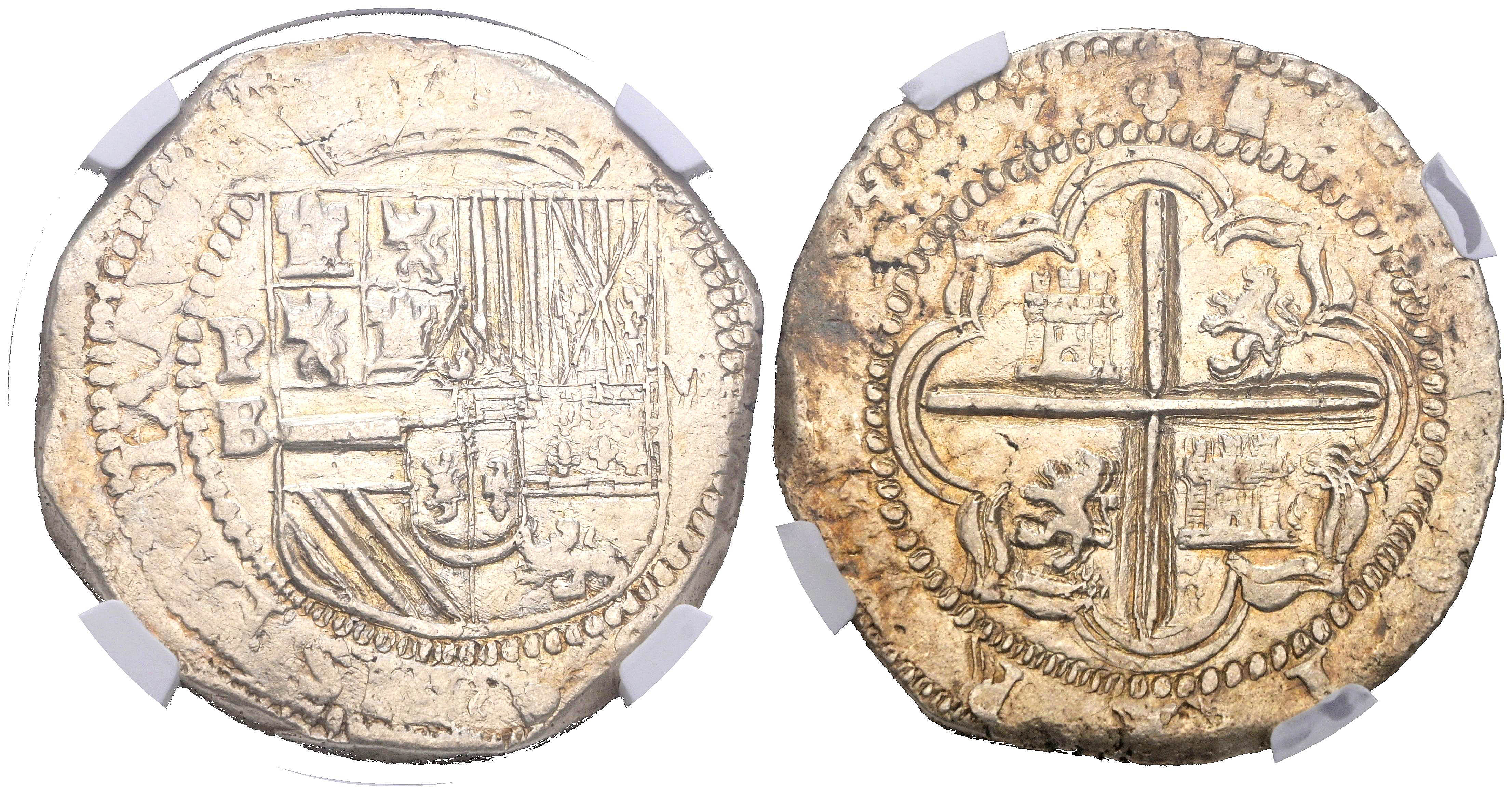 FELIPE II (1556-1598). 8 Reales. (Ar. 27,03g/39mm). S/D (1578-1595). Potosí B. (Cal-2019-672). Encapsulado por NGC AU Details, Cleaned.