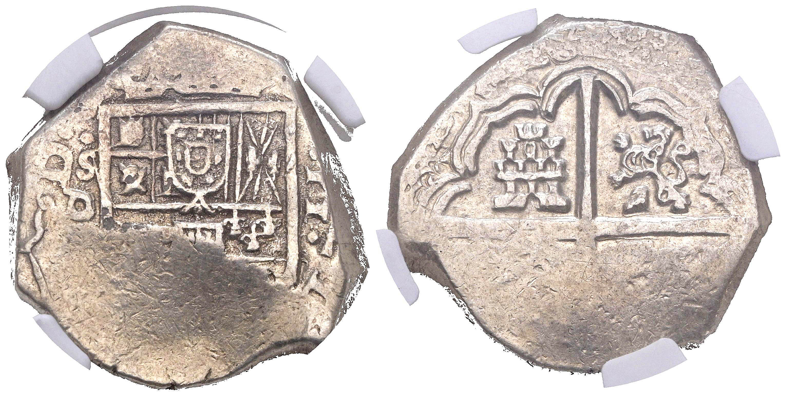 FELIPE III (1598-1621). 4 Reales. (Ar. 13,85g /24mm). Fecha no visible (1611-1618). Sevilla D. (Cal-2019-Tipo 154). Encapsulada por NGC AU 58 (Top Pop, mejor ejemplar conservado en el censo de NGC).