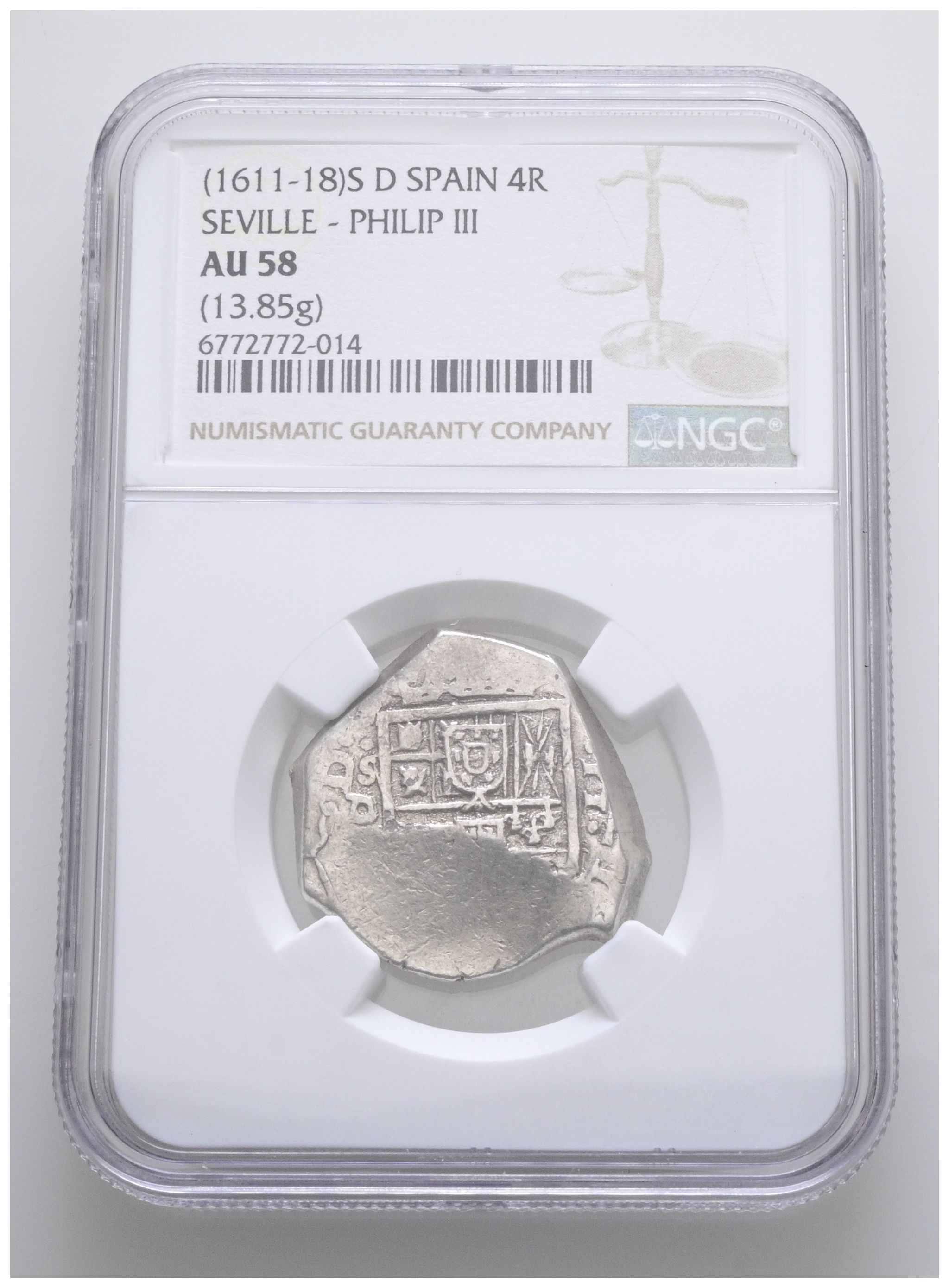 FELIPE III (1598-1621). 4 Reales. (Ar. 13,85g /24mm). Fecha no visible (1611-1618). Sevilla D. (Cal-2019-Tipo 154). Encapsulada por NGC AU 58 (Top Pop, mejor ejemplar conservado en el censo de NGC).