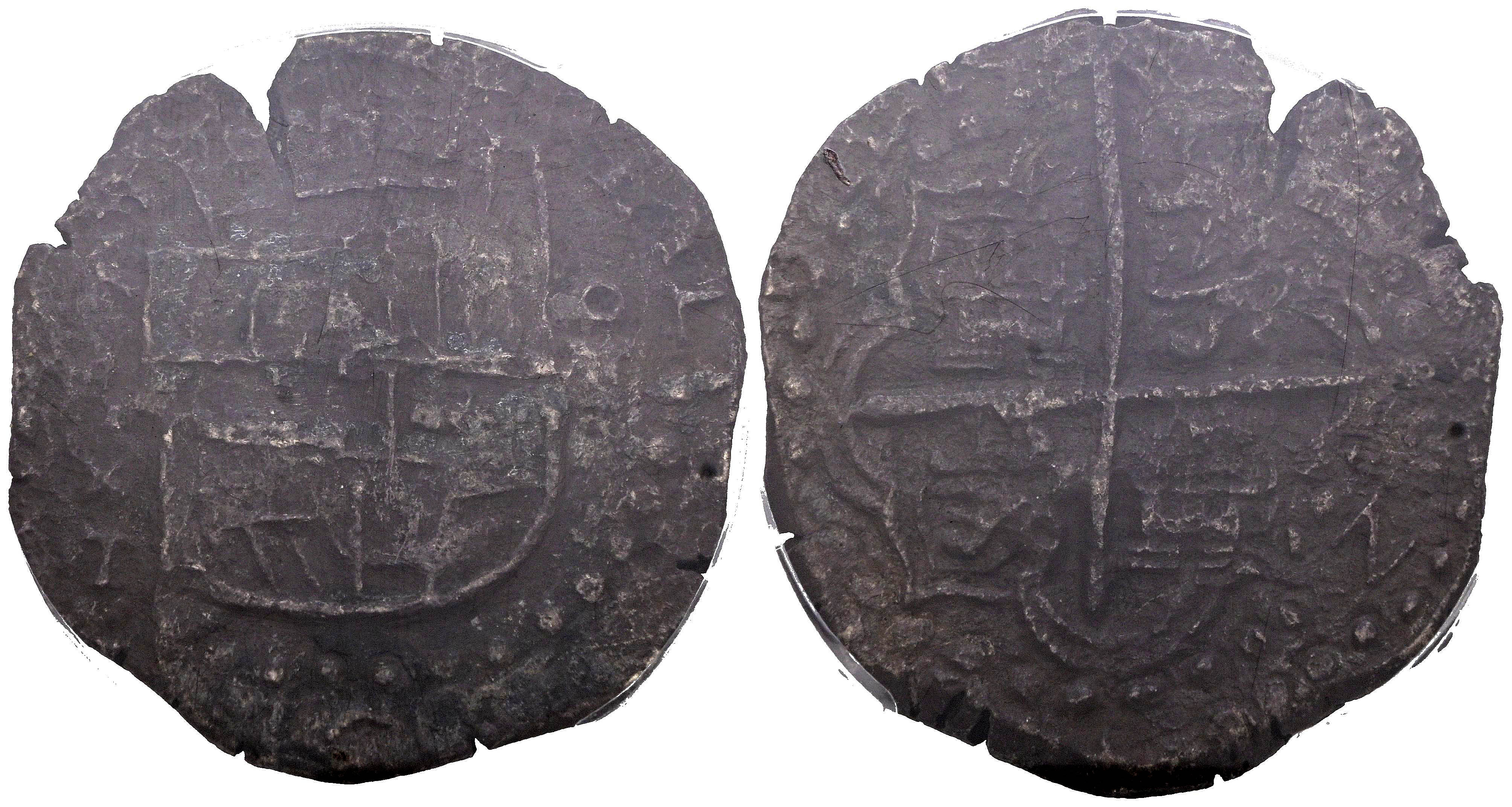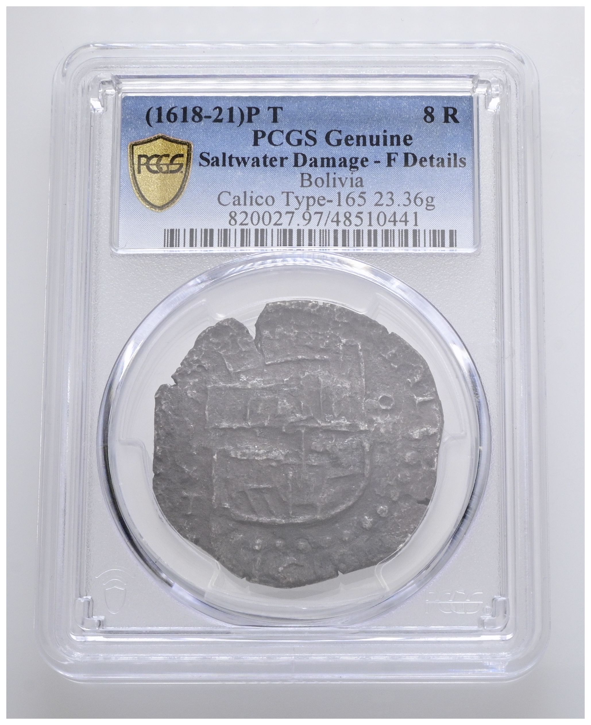FELIPE III (1598-1621). 8 Reales. (Ar. 23,36g/35mm). Fecha no visible. Potosí T. (Cal-2019-Tipo 165). Encapsulada por PCGS F Details, Saltwater Damage.