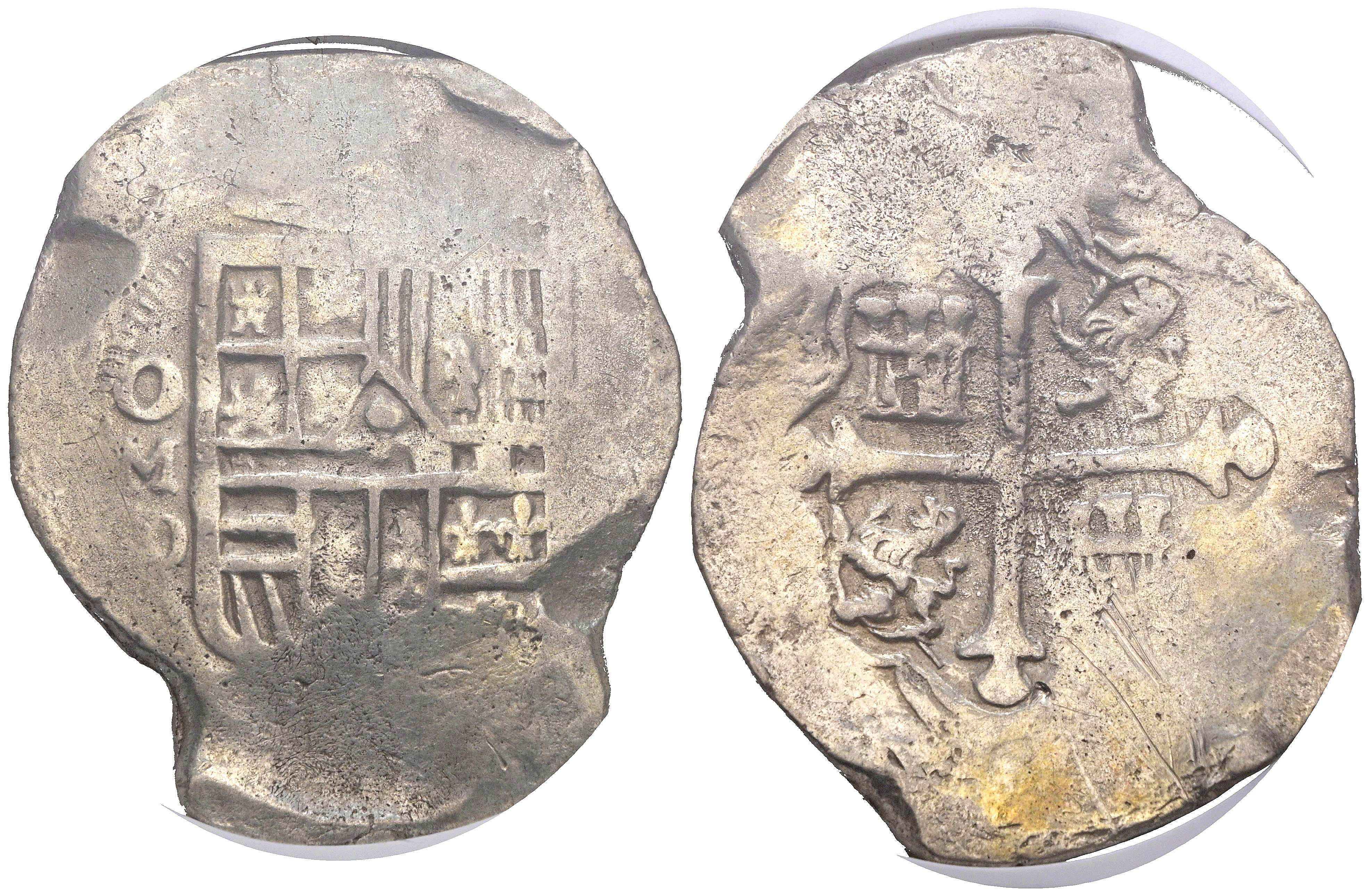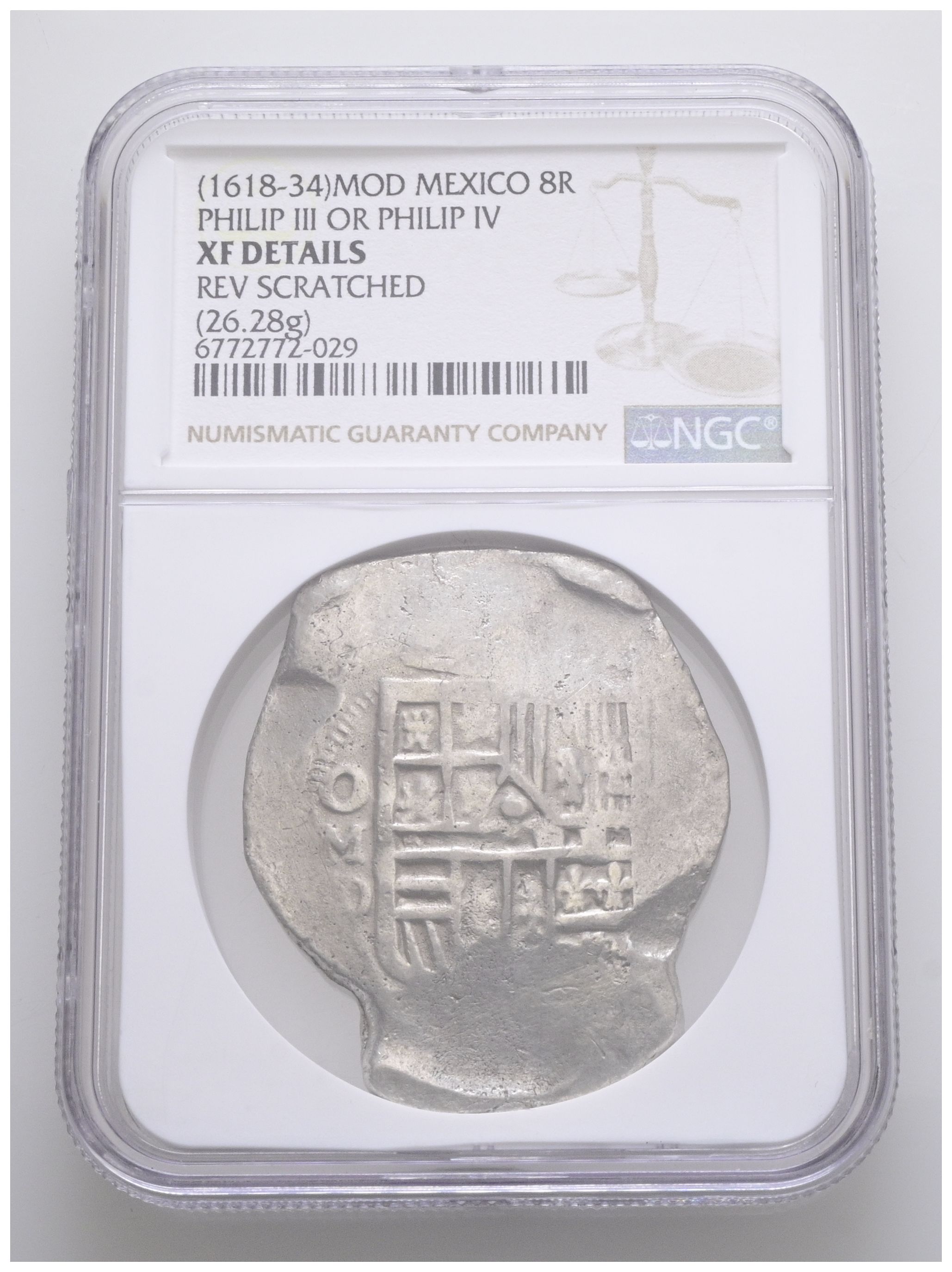 FELIPE III o FELIPE IV. 8 Reales. (Ar. 26,28g/41mm). Fecha no visible. México D. (Cal-2019-Tipo 162 ó 319). Encapsulado por NGC XF Details, Rev. Scratched.