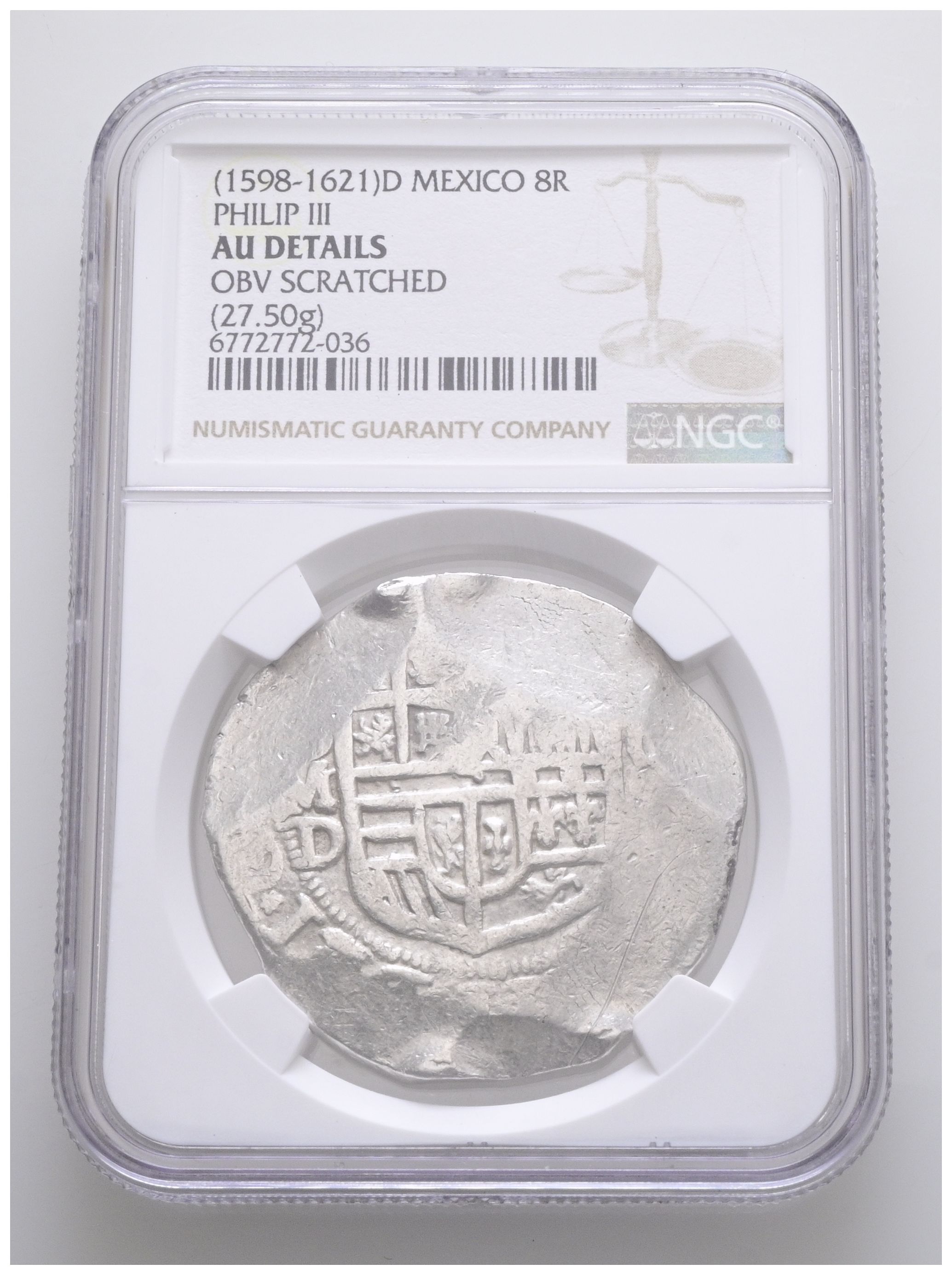 FELIPE III o FELIPE IV. 8 Reales. (Ar. 27,50g/39mm). Fecha no visible. México D. (Cal-2019-Tipo 162 ó 319). Encapsulado por NGC AU Details, Obv. Scratched.