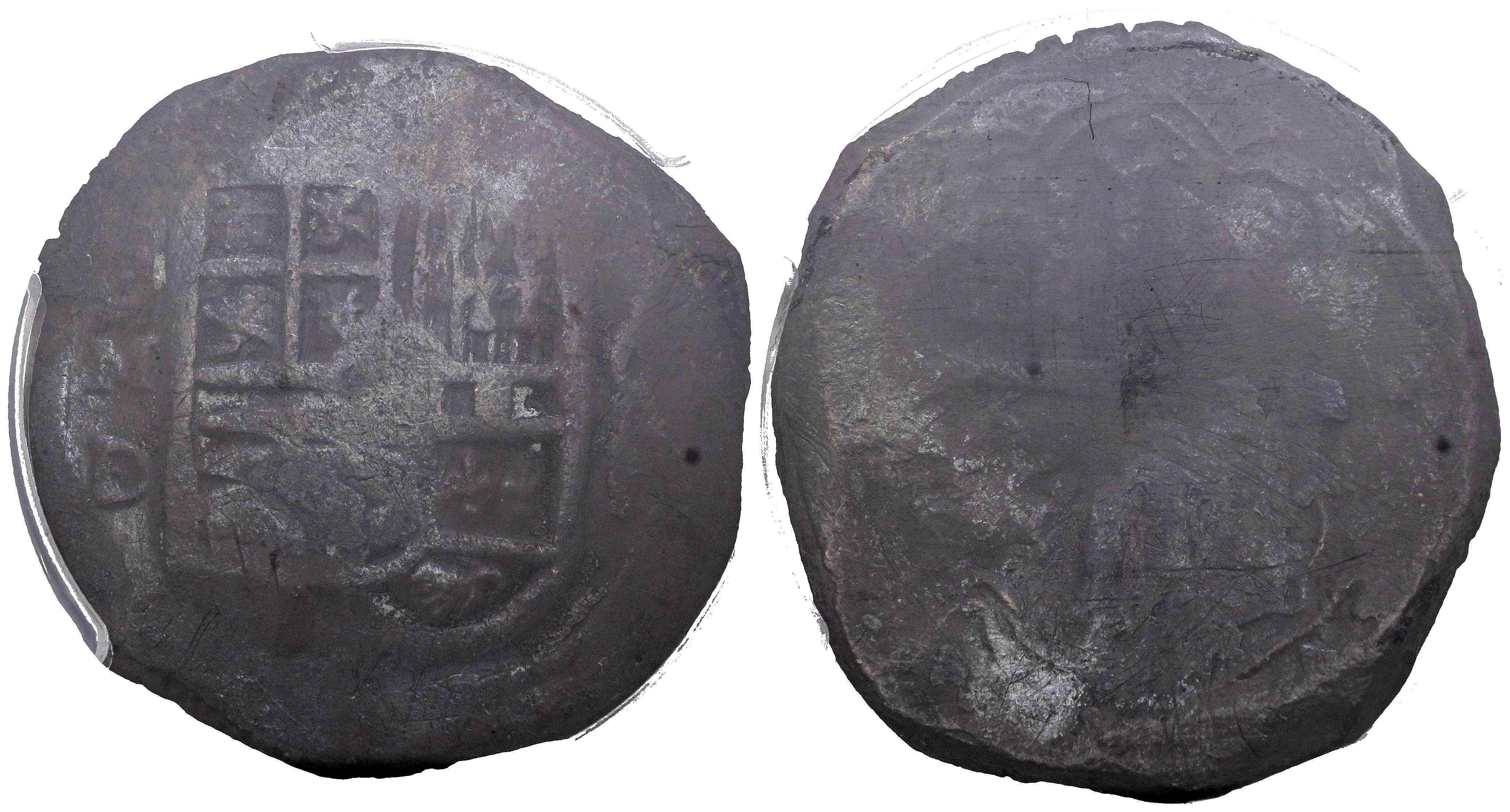 FELIPE III o FELIPE IV. 8 Reales. (Ar. 24,90g/38mm). Fecha no visible. México D. (Cal-2019-Tipo 162 ó 319). Encapsulado por PCGS F Details, Saltwater Damage.