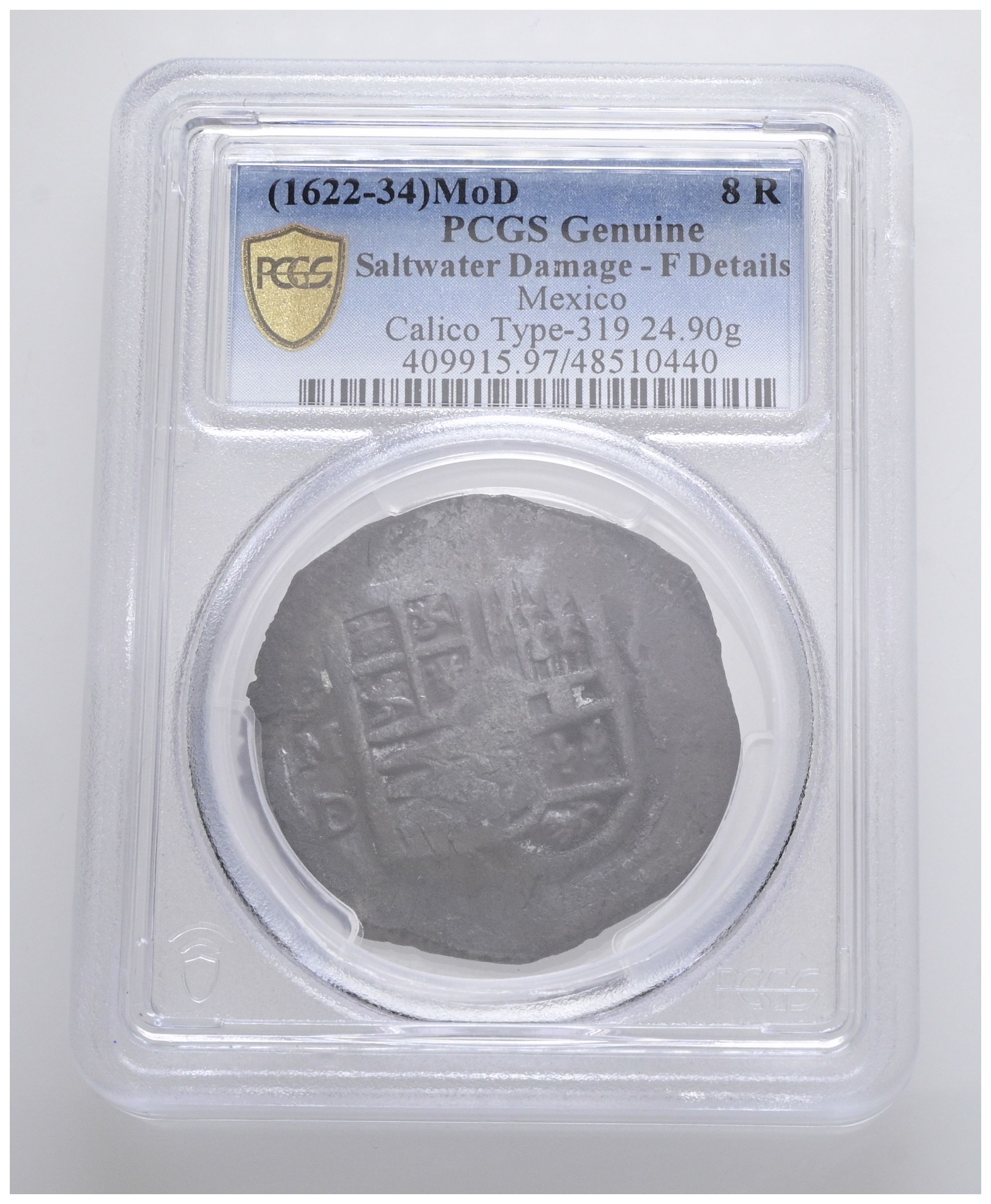 FELIPE III o FELIPE IV. 8 Reales. (Ar. 24,90g/38mm). Fecha no visible. México D. (Cal-2019-Tipo 162 ó 319). Encapsulado por PCGS F Details, Saltwater Damage.