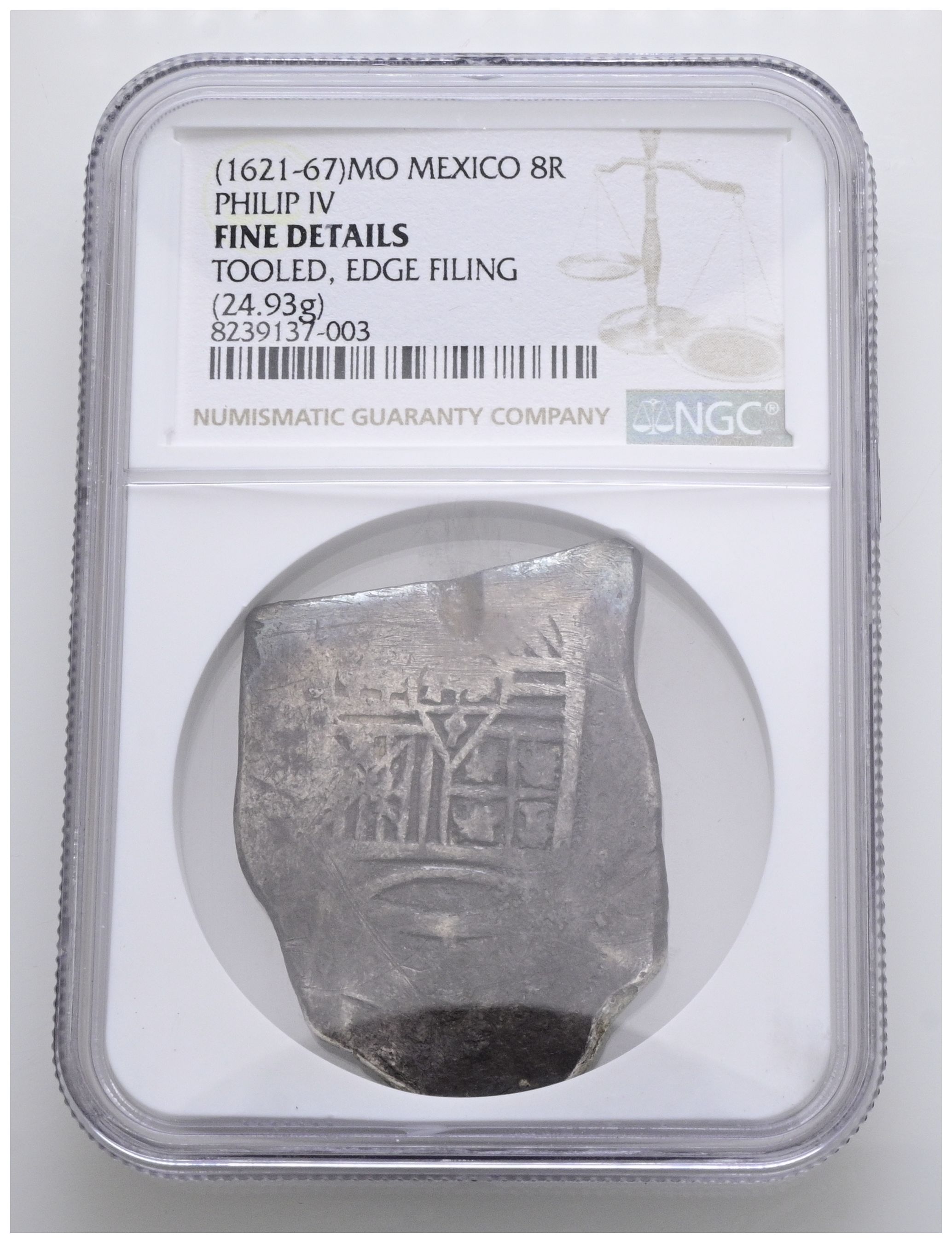 FELIPE III o FELIPE IV. 8 Reales. (Ar. 24,93g/39mm). Fecha no visible. México, ensayador no visible. (Cal-2019-Tipo 162 ó 319). Encapsulado por NGC Fine Details, Tooled, Edge Filing.