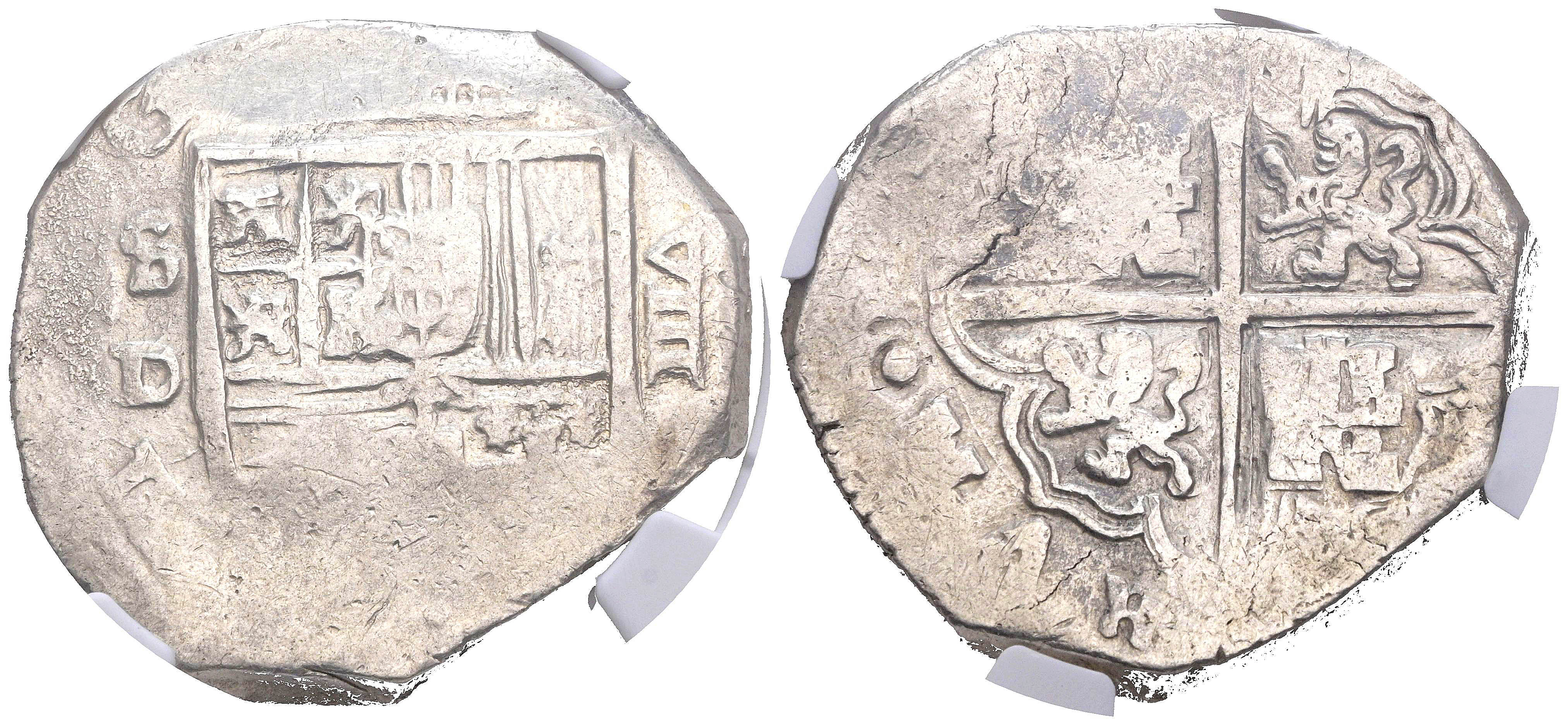 FELIPE III ó FELIPE IV. 8 Reales. (Ar. 27,52g/32mm). Fecha no visible (1598-1665). Sevilla D. Encapsulada por NGC AU Details, Cleaned.