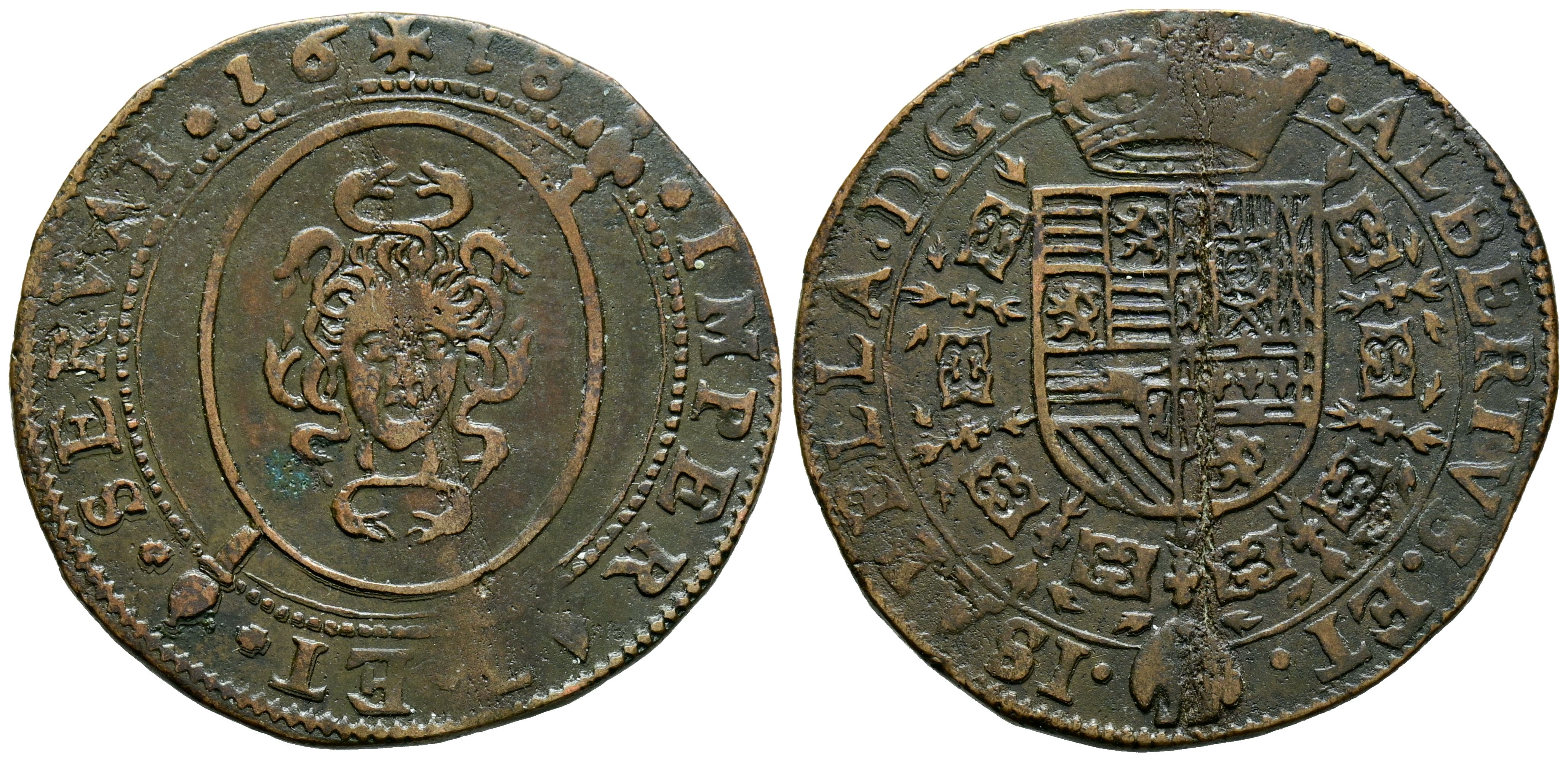 ALBERTO E ISABEL (1598-1621). Jetón. (Ae. 4,52/29mm). 1618. Tesorería desconocida. El gobernante inexpugnable. (Dugniolle 3752). MBC. Bonito ejemplar.