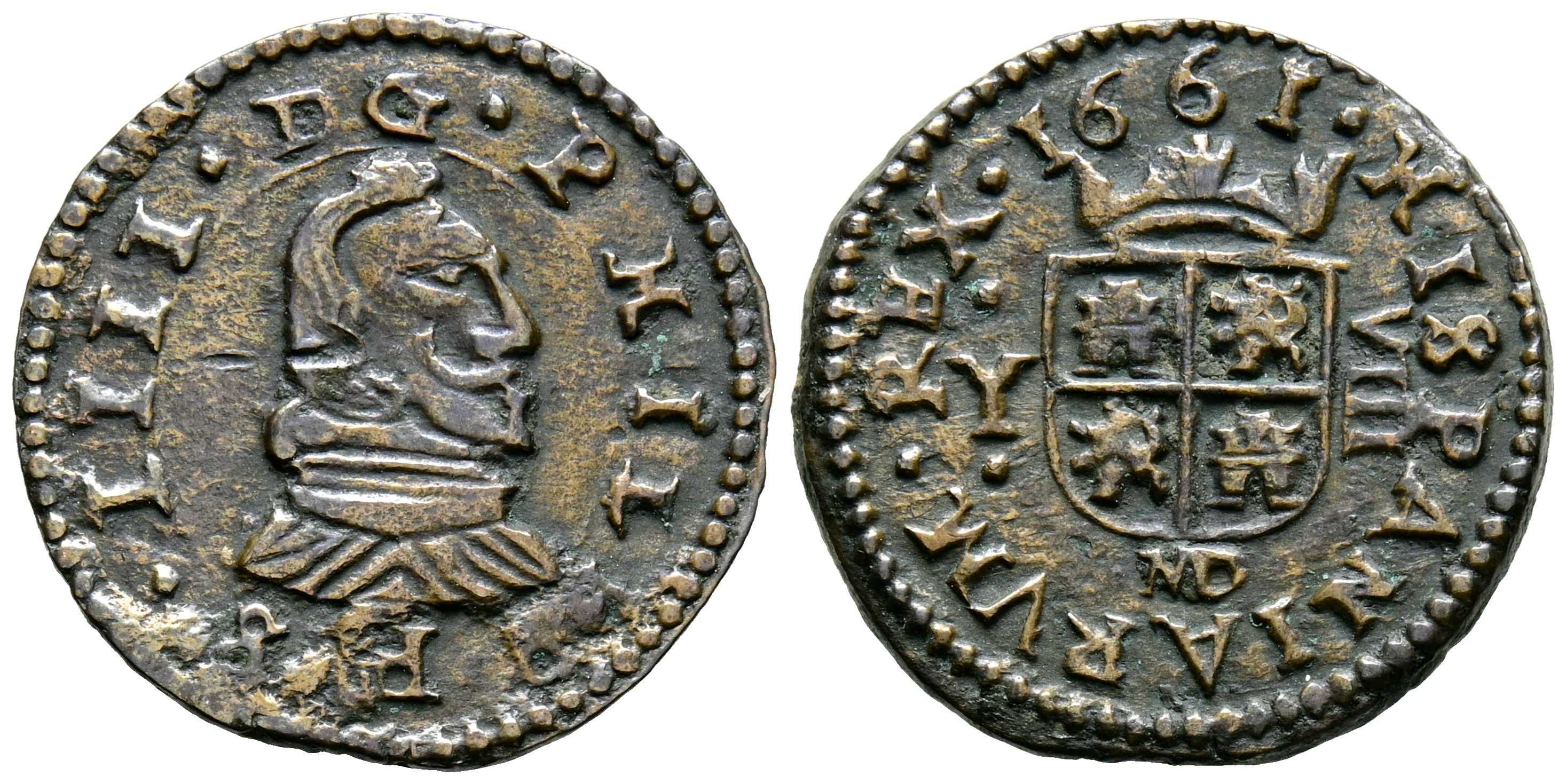 FELIPE IV (1621-1665). 8 Maravedís. (Ae. 2,47g/21mm). 1661. Madrid Y. (Cal-2019-358). Marca de ceca MD debajo del escudo. MBC+.