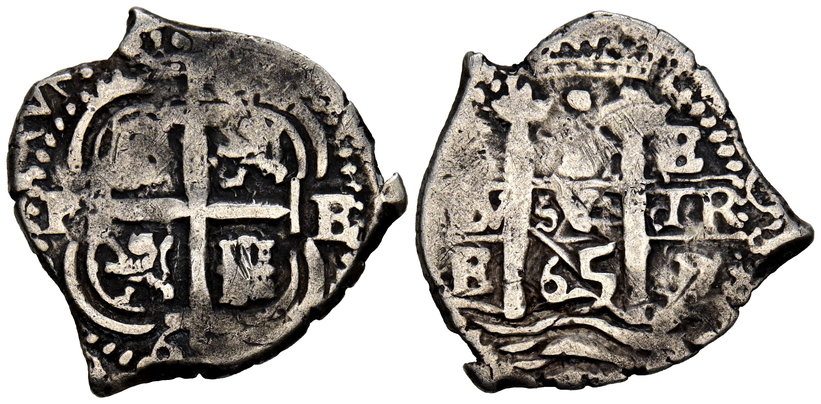 FELIPE IV (1621-1665). 1 Real. (Ar. 2,38g/20mm). 1665. Potosí E. (Cal-2019-767). Triple ensayador visible y doble fecha (parcial la de anverso). MBC. Bonito tono.Ex Colección Conde de Lemos.