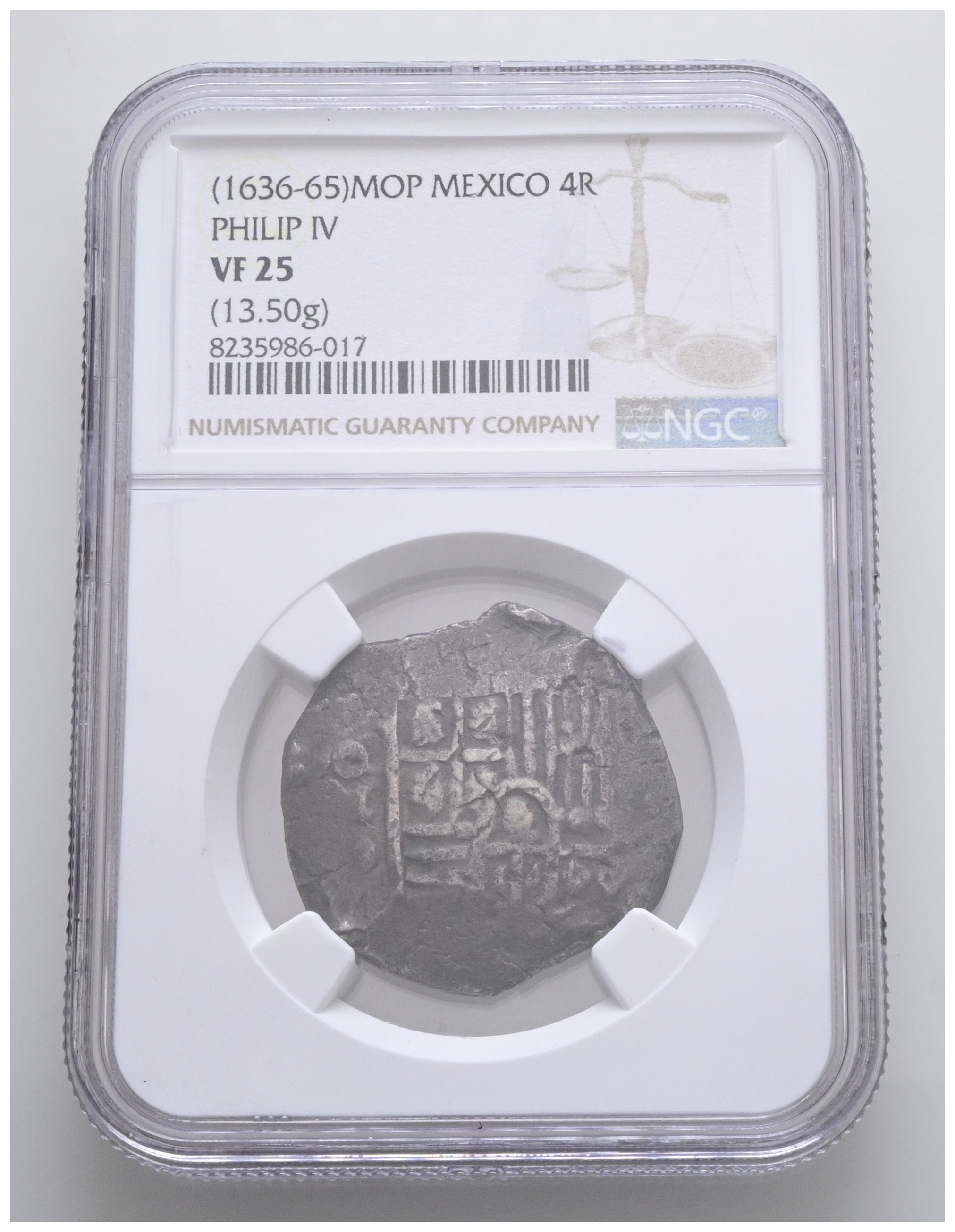 FELIPE IV (1621-1665). 4 Reales. (Ar. 13,50g/26mm). Fecha no visible (entre 1636-1665). México P. (Cal-2019-Tipo 275). Encapsulada por NGC VF 25.