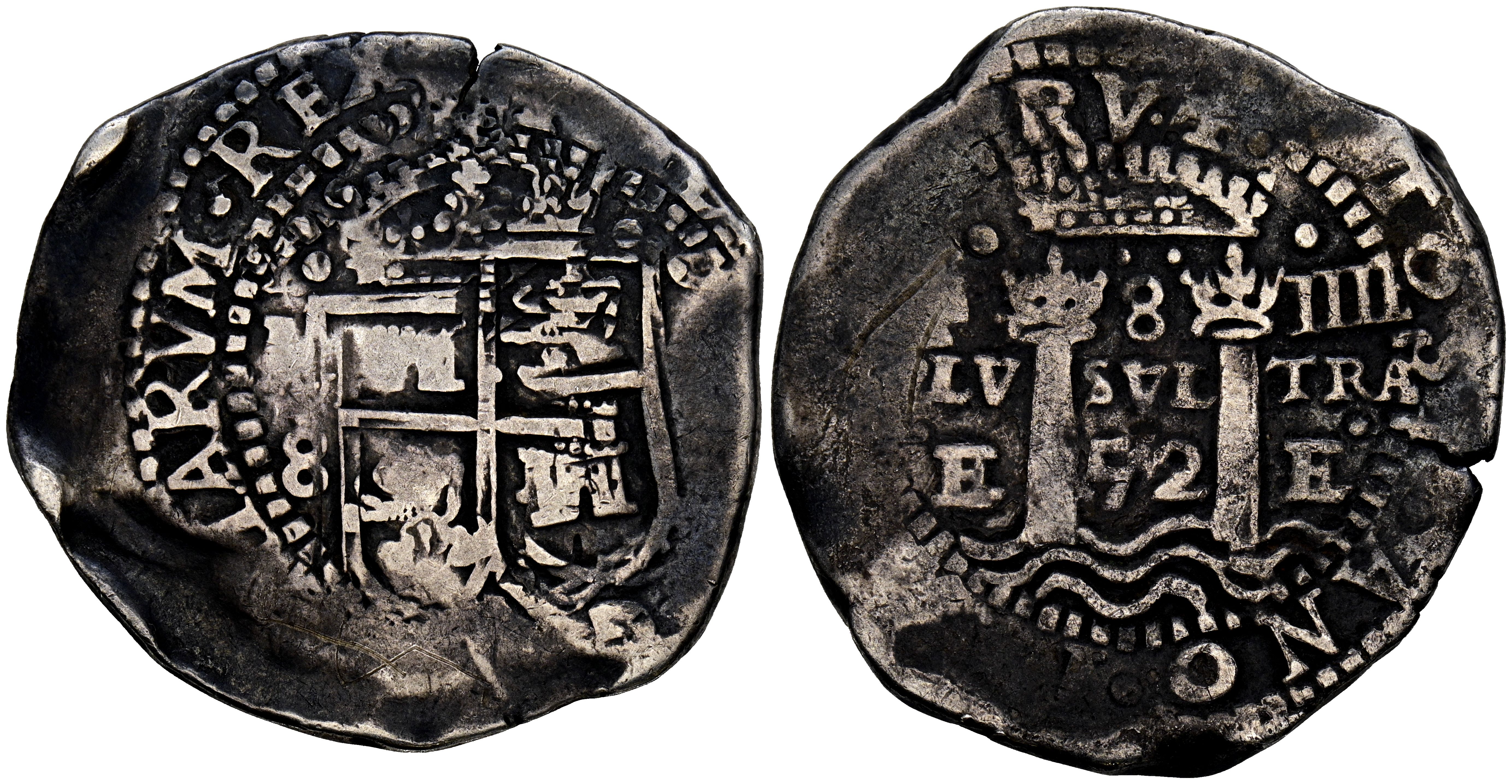 FELIPE IV (1621-1665). 8 Reales. (Ar. 27,19g/39mm). 1652. Potosí E (Cal-2019-1499). Sin PH bajo corona y con valor IIII en reverso. MBC. Escaso ejemplar.