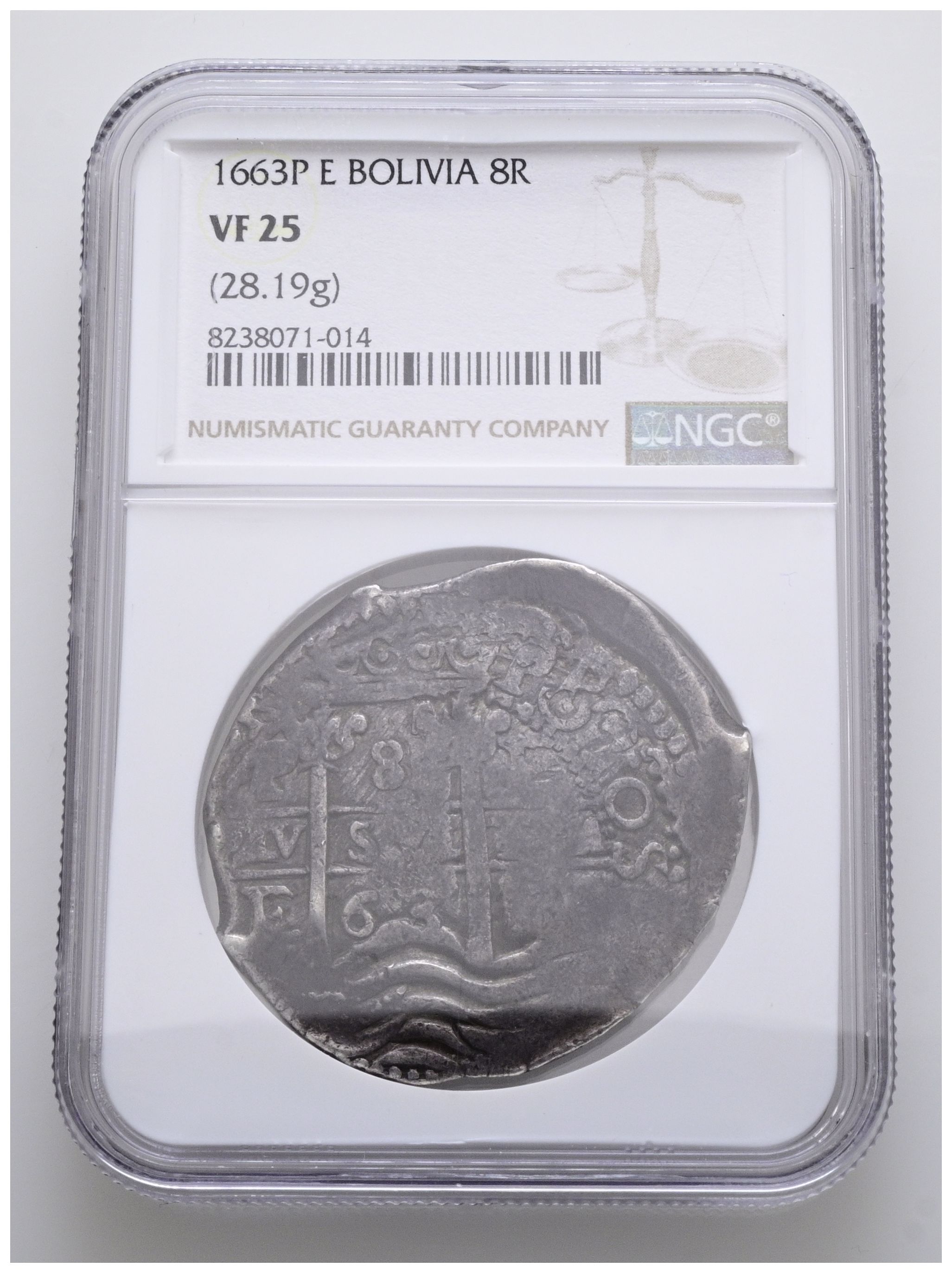 FELIPE IV (1621-1665). 8 Reales. (Ar. 28,19g/39mm). 1663. Potosí E. (Cal-2019-1527). Doble ensayador y fecha. Encapsulada por NGC VF 25. Fecha escasa.