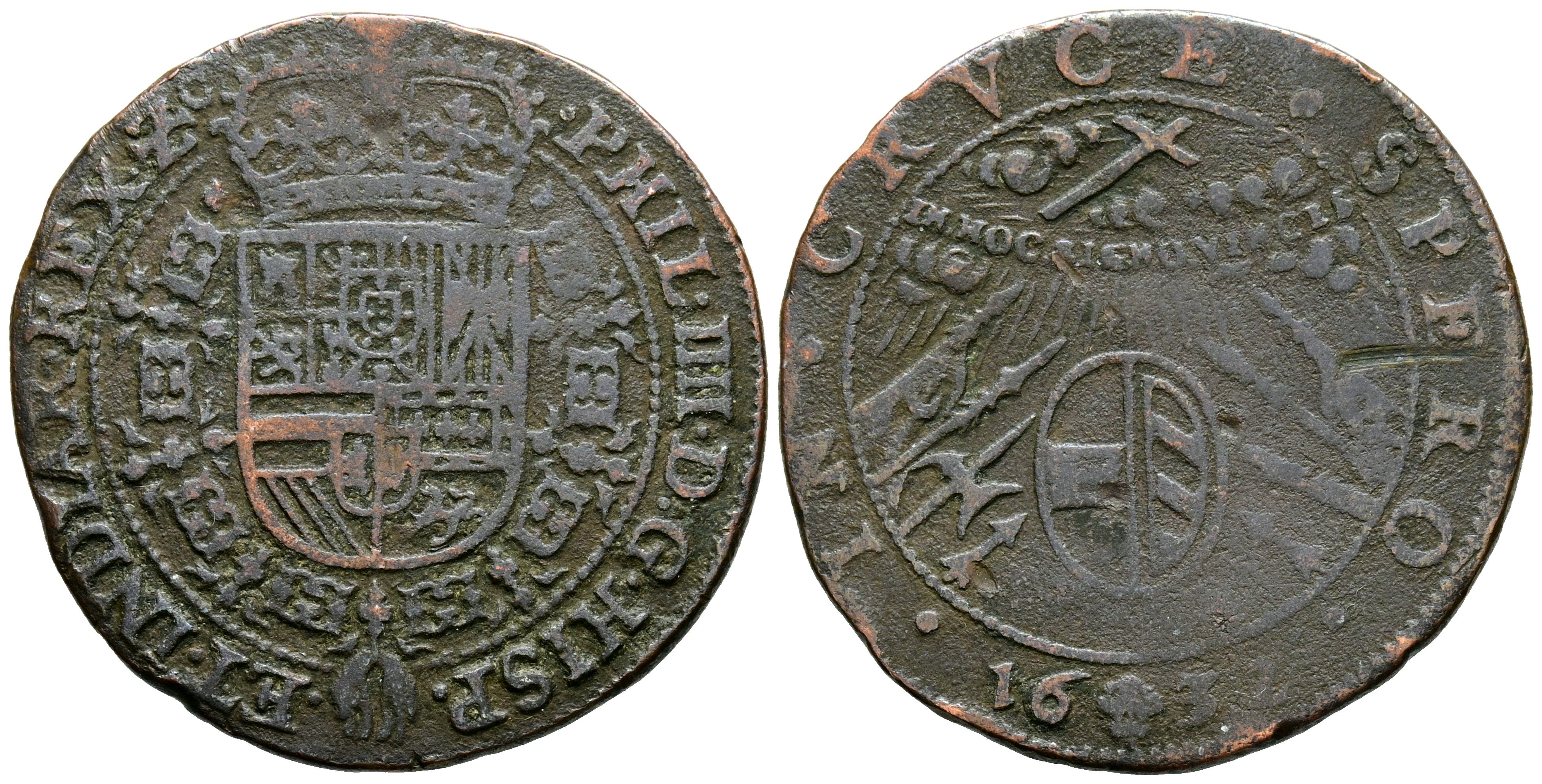 FELIPE IV (1621-1665). Jetón. (Ae. 5,19g/28mm). 1632. Bruselas. Tesorería desconocida. Alegoría de la Fe religiosa. (Dugniolle 3877). BC+.