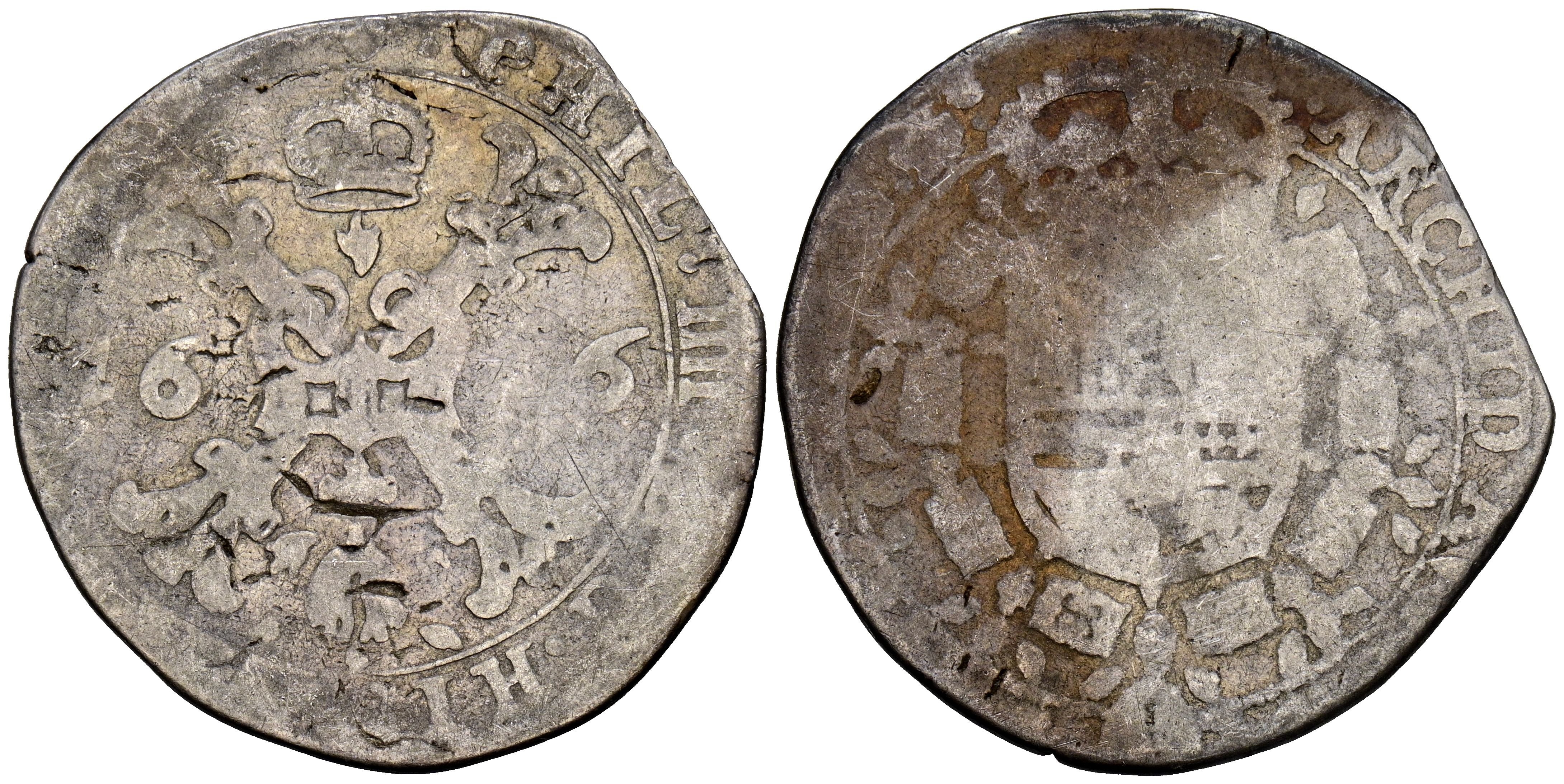 FELIPE IV (1621-1665). 1/4 Patagón. (Ar. 6,15g/30mm). 16?6 (1626 o 1656). Bruselas. (Vicenti 668 ó 686). BC.