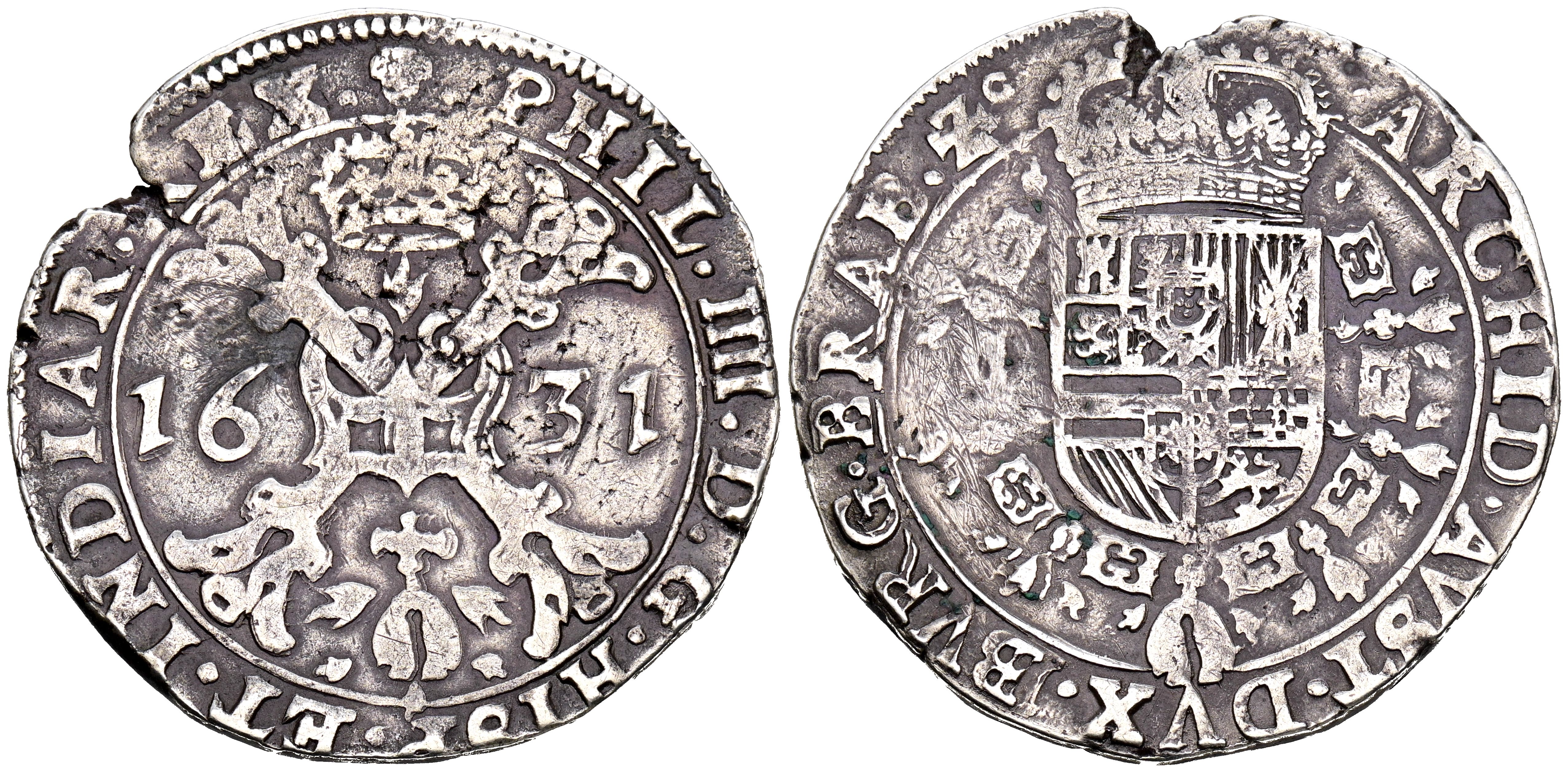 FELIPE IV (1621-1665). 1/2 Patagón. (Ar. 13,79g/36mm). 1631. Bruselas. (Vicenti 761). MBC.