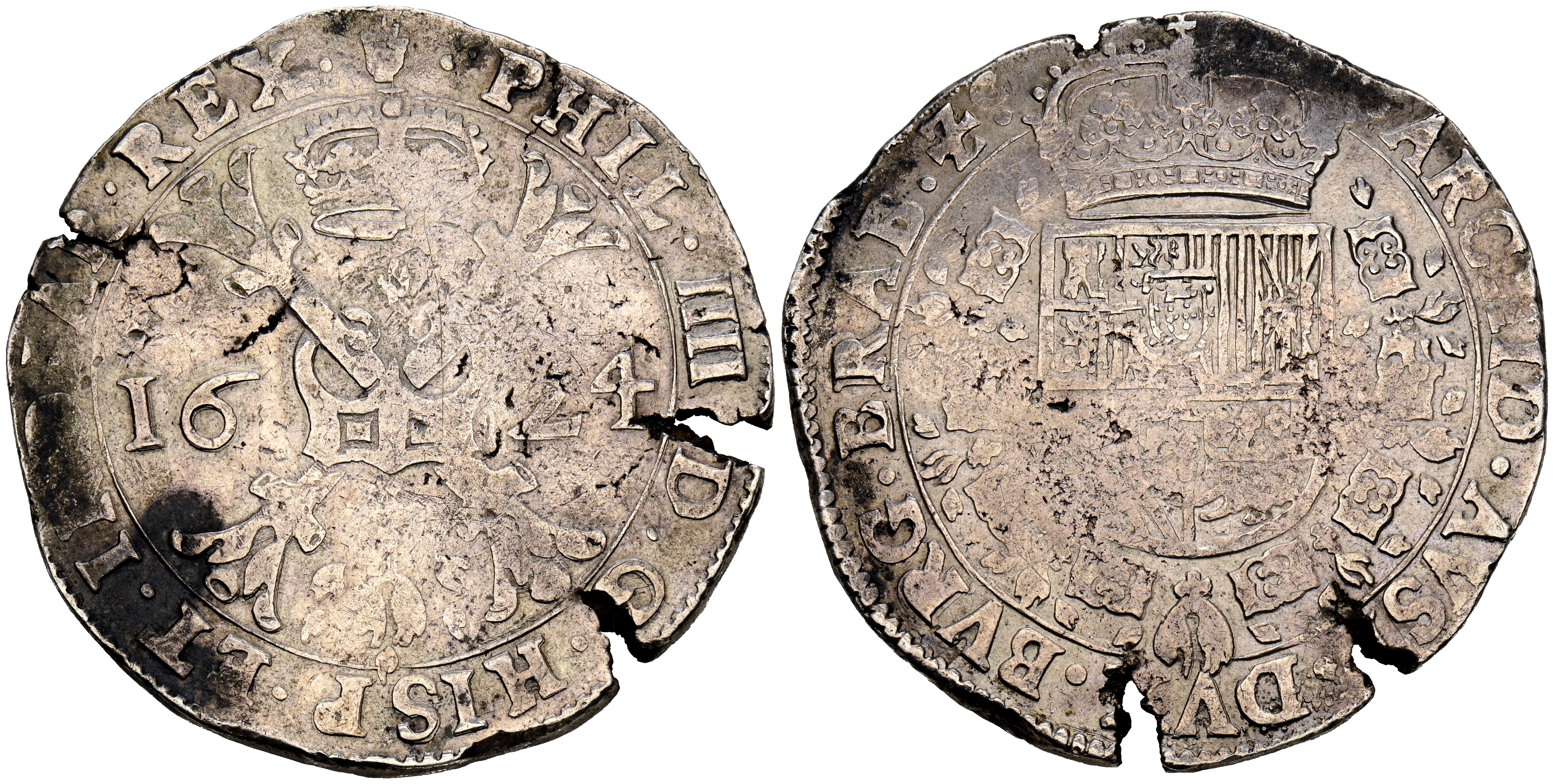 FELIPE IV (1621-1665). 1 Patagón. (Ar. 27,91g/43mm). 1624. Amberes. (Vicenti 930). MBC. A pesar de los defectos del cospel, la pieza presenta un precioso brillo y un interesante nivel de detalles para este tipo de pieza.