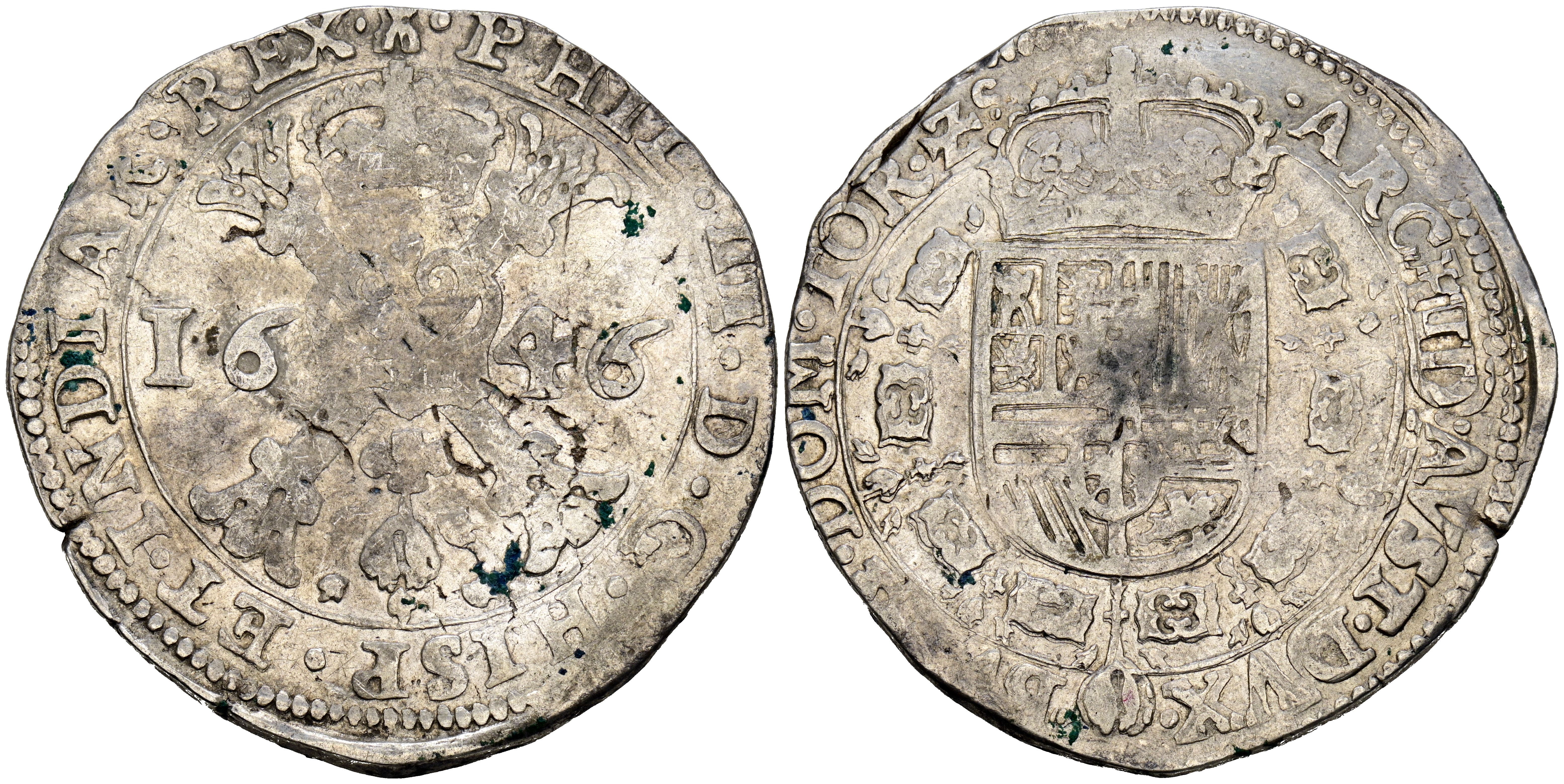 FELIPE IV (1621-1665). 1 Patagón. (Ar. 27,73g/44mm). 1646. Tournai. (Vicenti 1129). MBC+. Puntos de verdín. Precioso brillo.