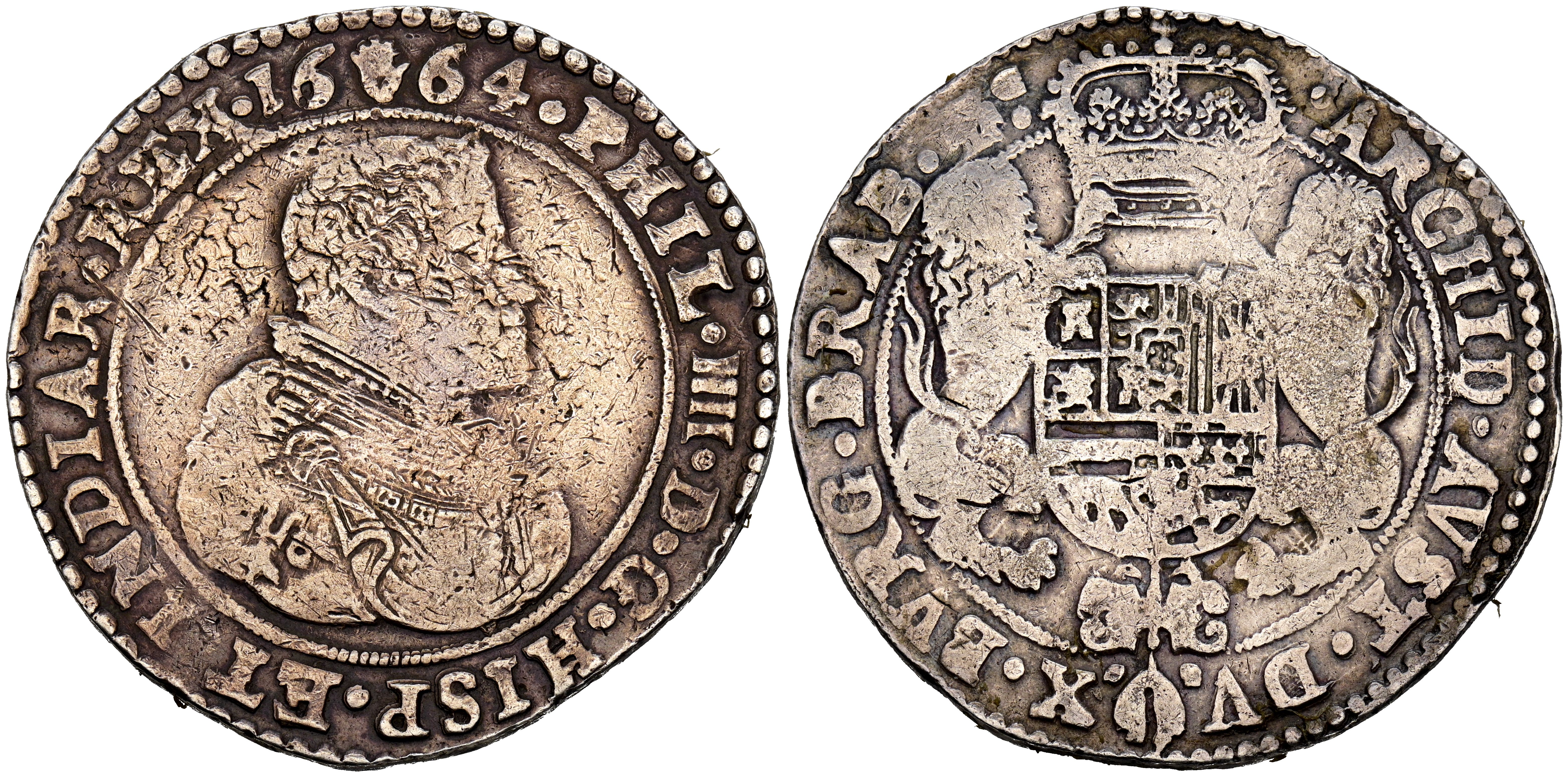 FELIPE IV (1621-1665). Ducatón. (Ar. 32,48g/44mm). 1664. Amberes. (Vicenti 1252). MBC-. Pátina oscura.