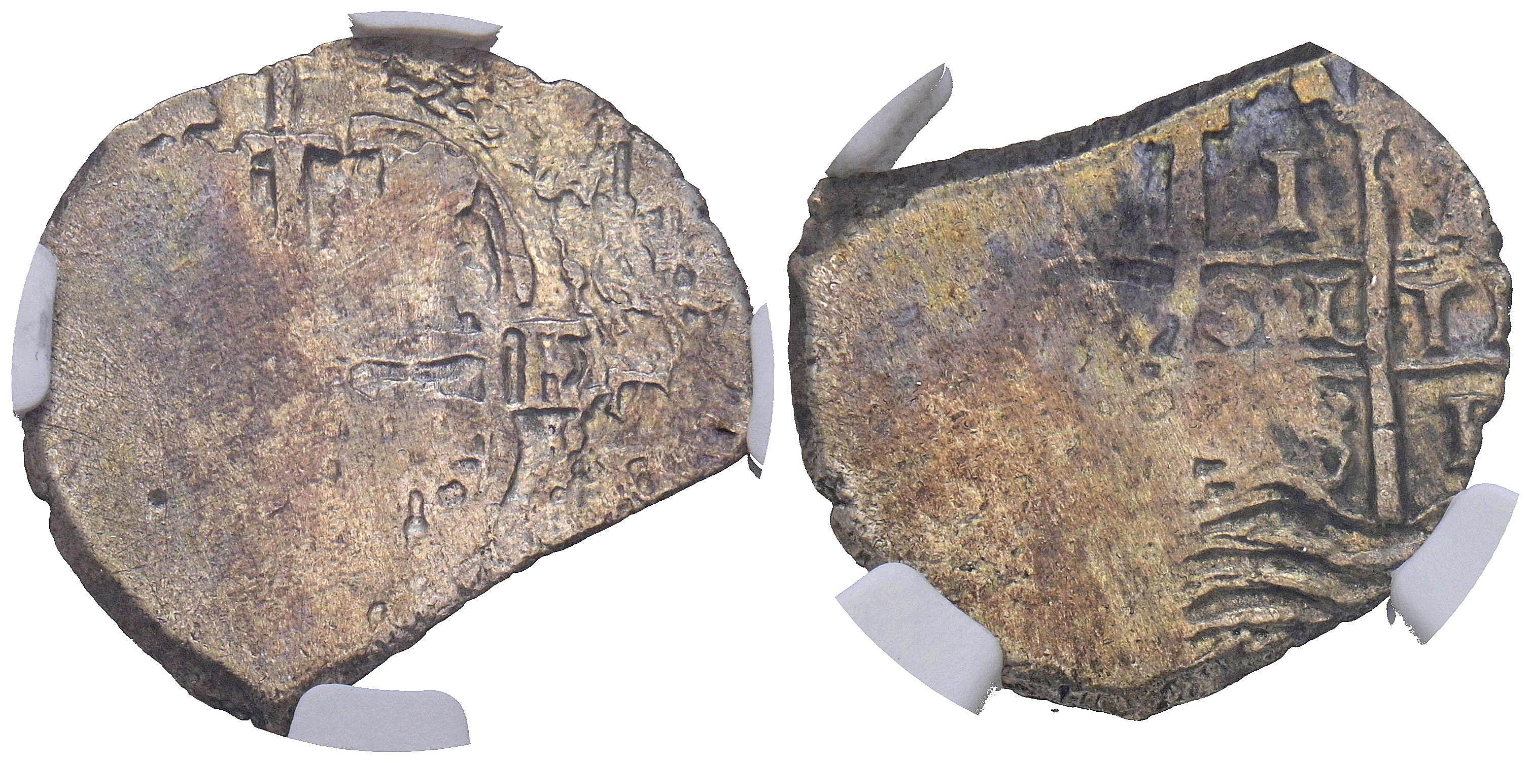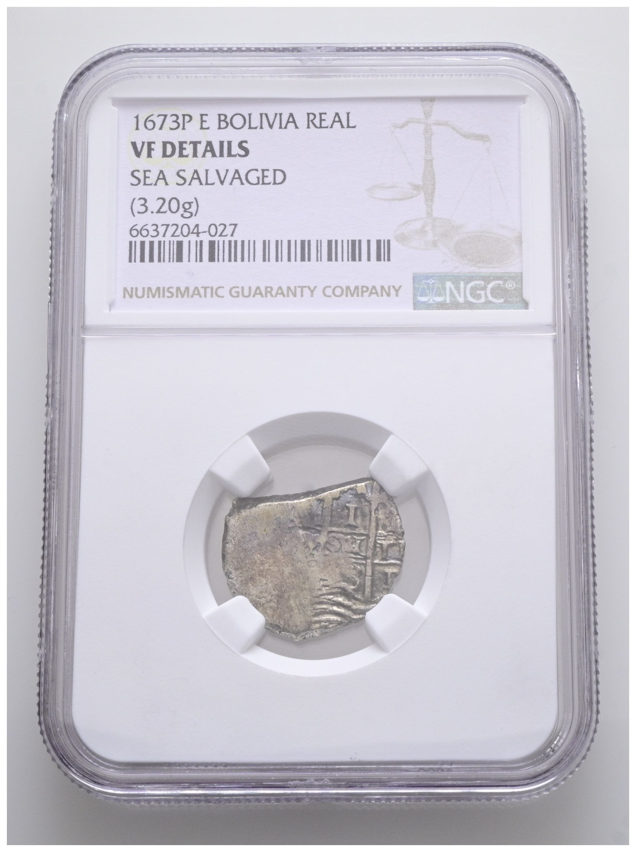 CARLOS II (1665-1700). 1 Real. (Ar. 3,20g/19mm). 1673. Potosí E. (Cal-2019-258). Encapsulado por NGC VF Details, Sea salvaged.