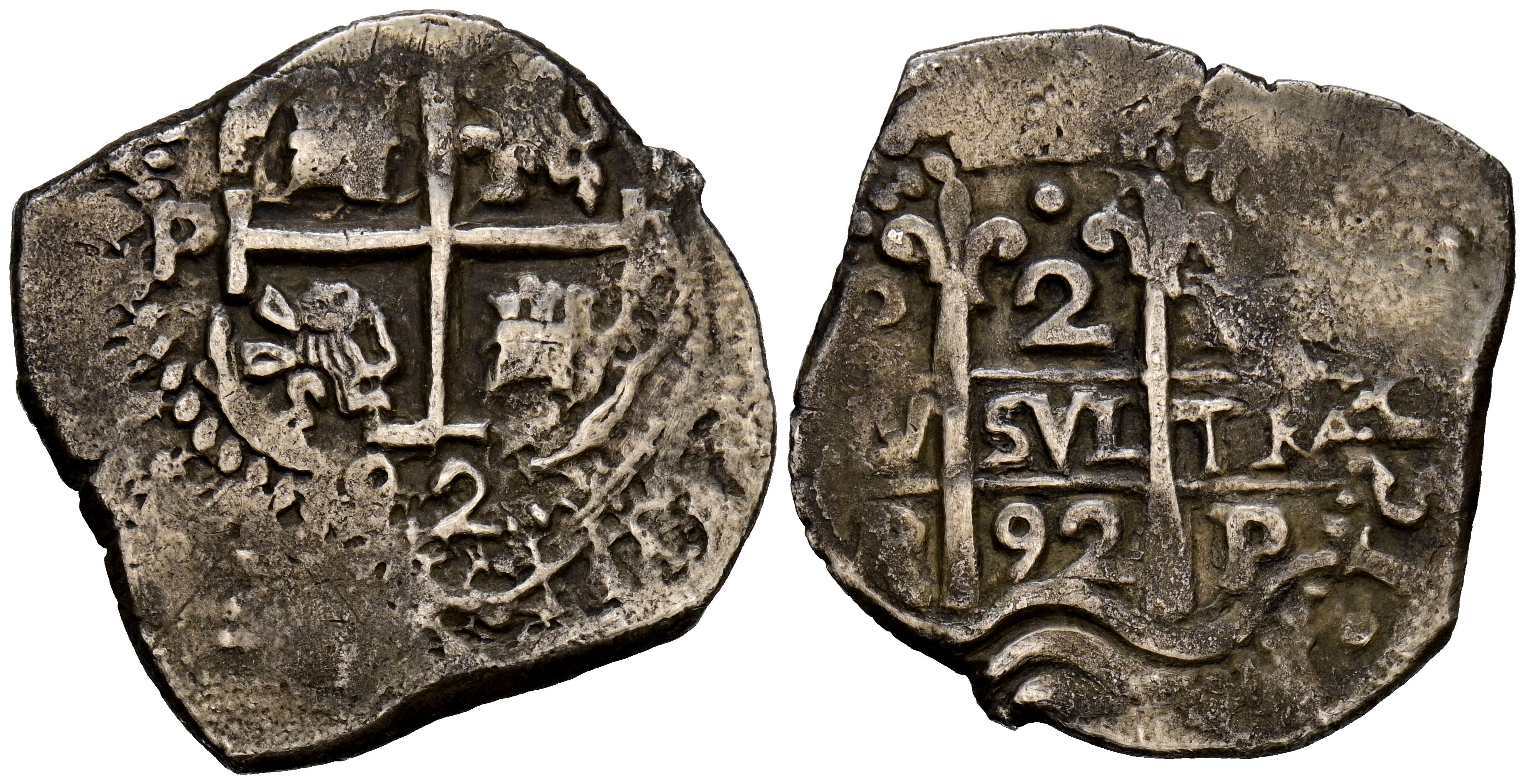 CARLOS II (1665-1700). 2 Reales. (Ar. 6,53g/28mm). 1692. Potosí VR. (Cal-2019-425). Doble fecha. MBC. Escaso así.