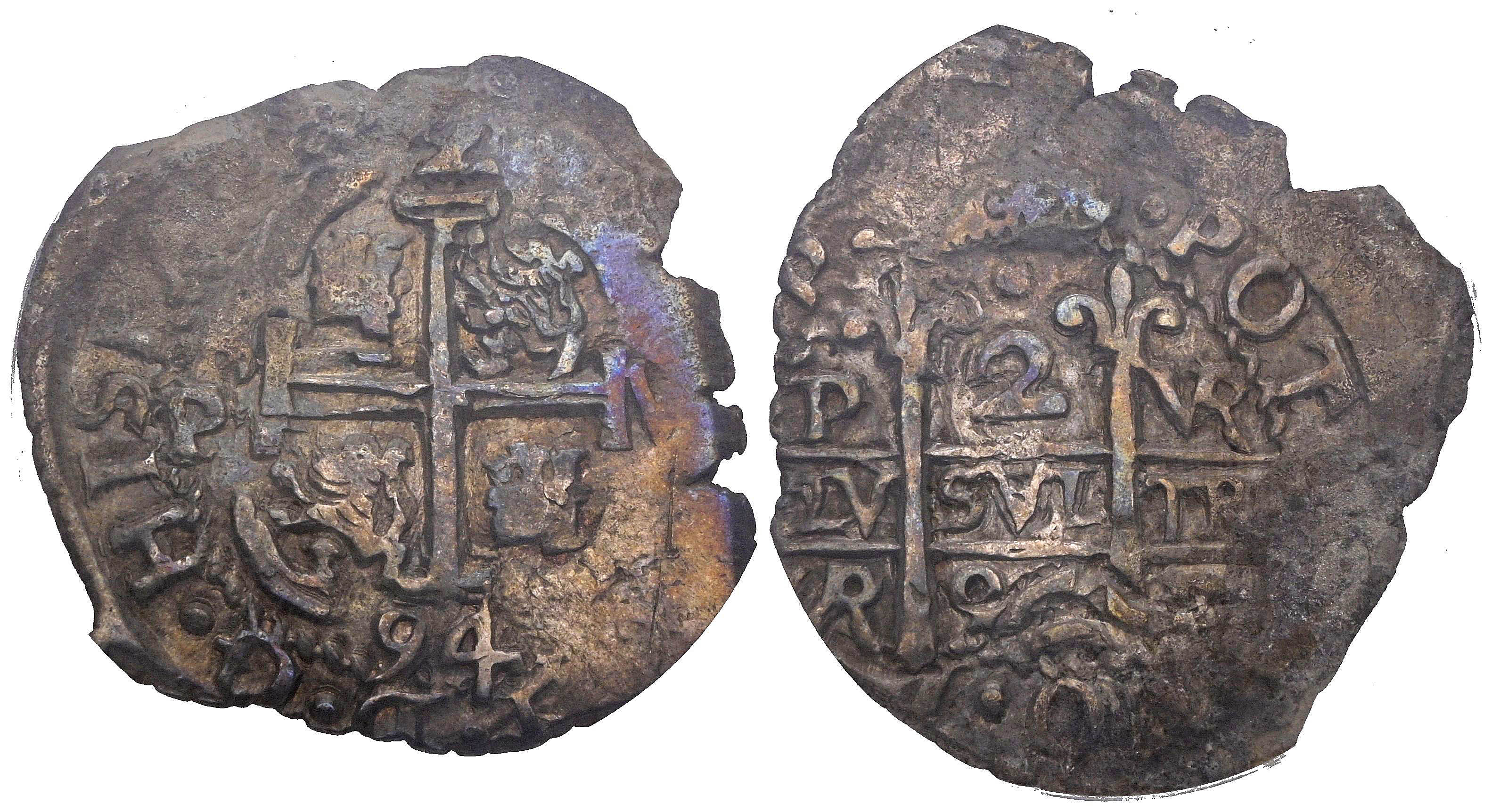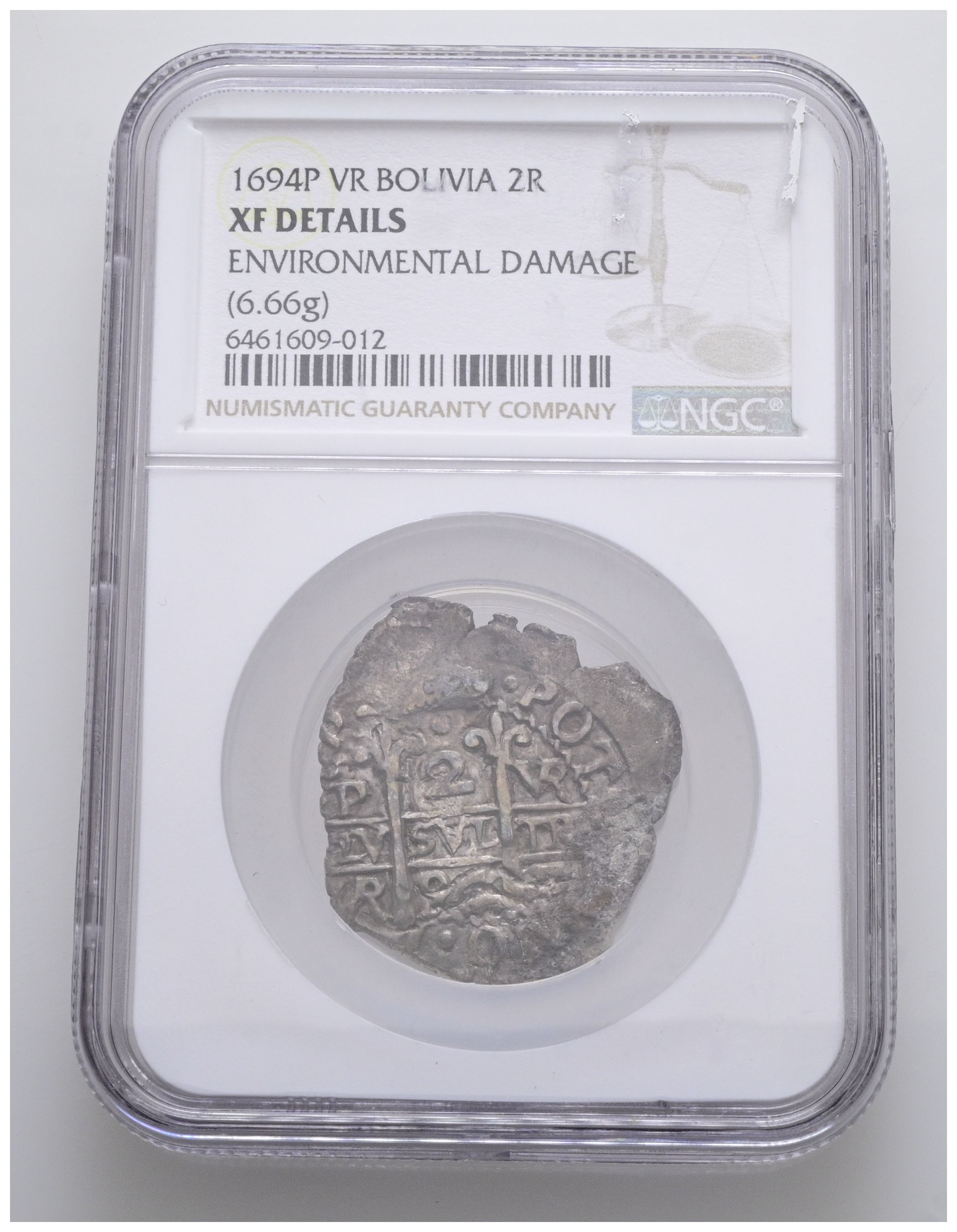 CARLOS II (1665-1700). 2 Reales. (Ar. 6,66g/26mm). 1694. Potosí VR. (Cal-2019-429). Doble fecha. Encapsulado por NGC XF Details, Environmental Damage.