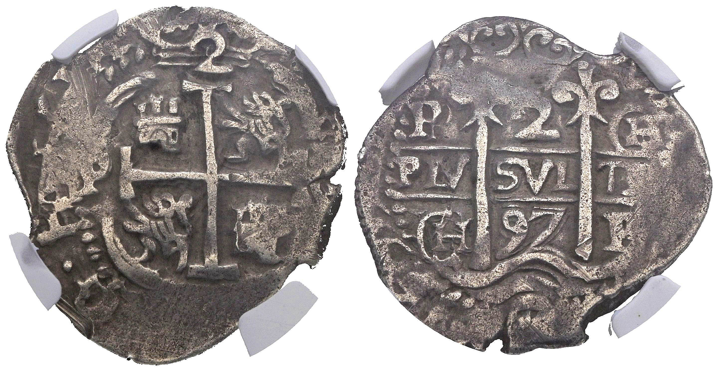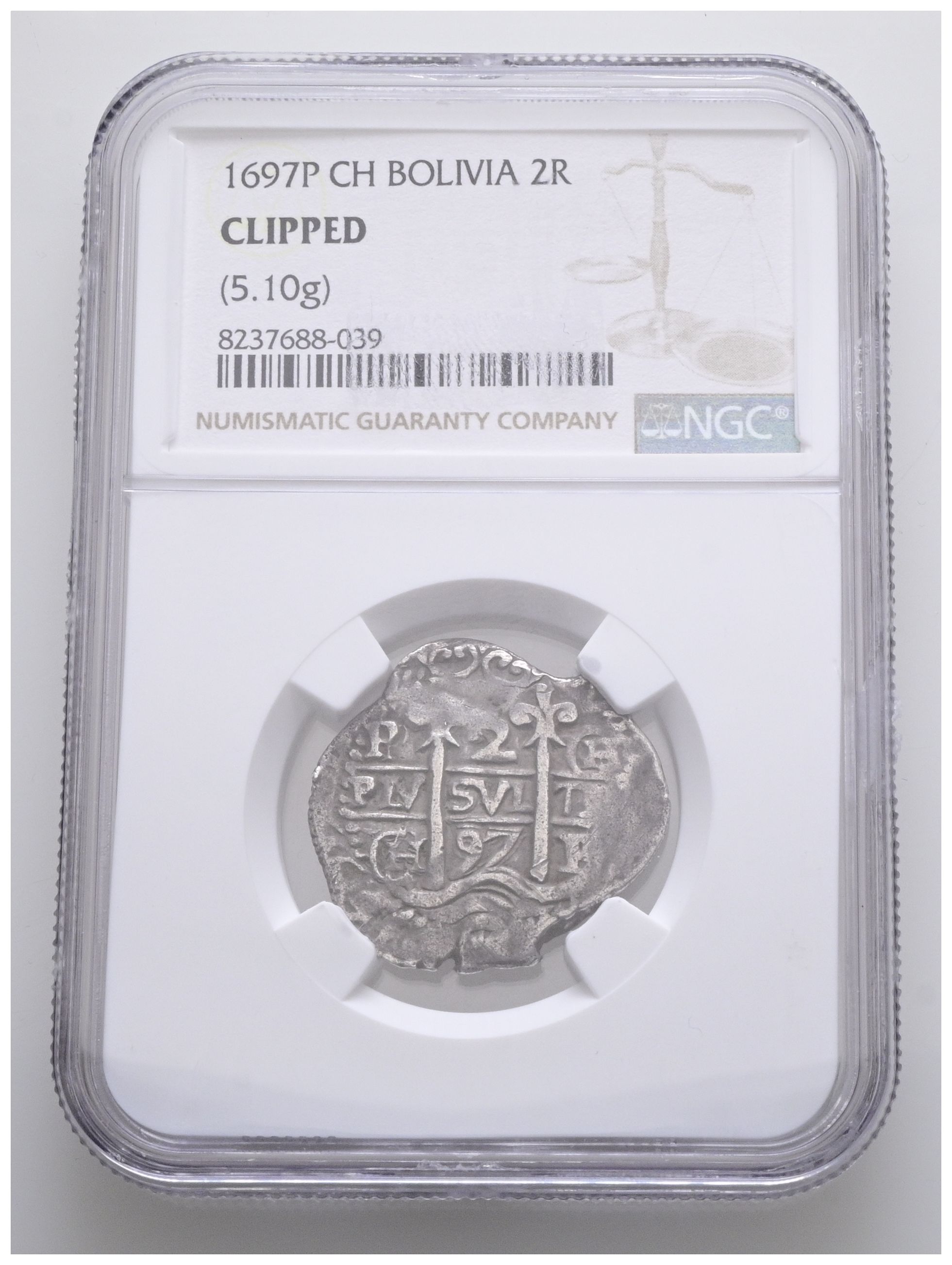 CARLOS II (1665-1700). 2 Reales. (Ar. 5,10g/19mm). 1697. Potosí CH. (Cal-2019-431). Encapsulado por NGC CLIPPED. Muy bonito ejemplar, raro con estos ensayadores.