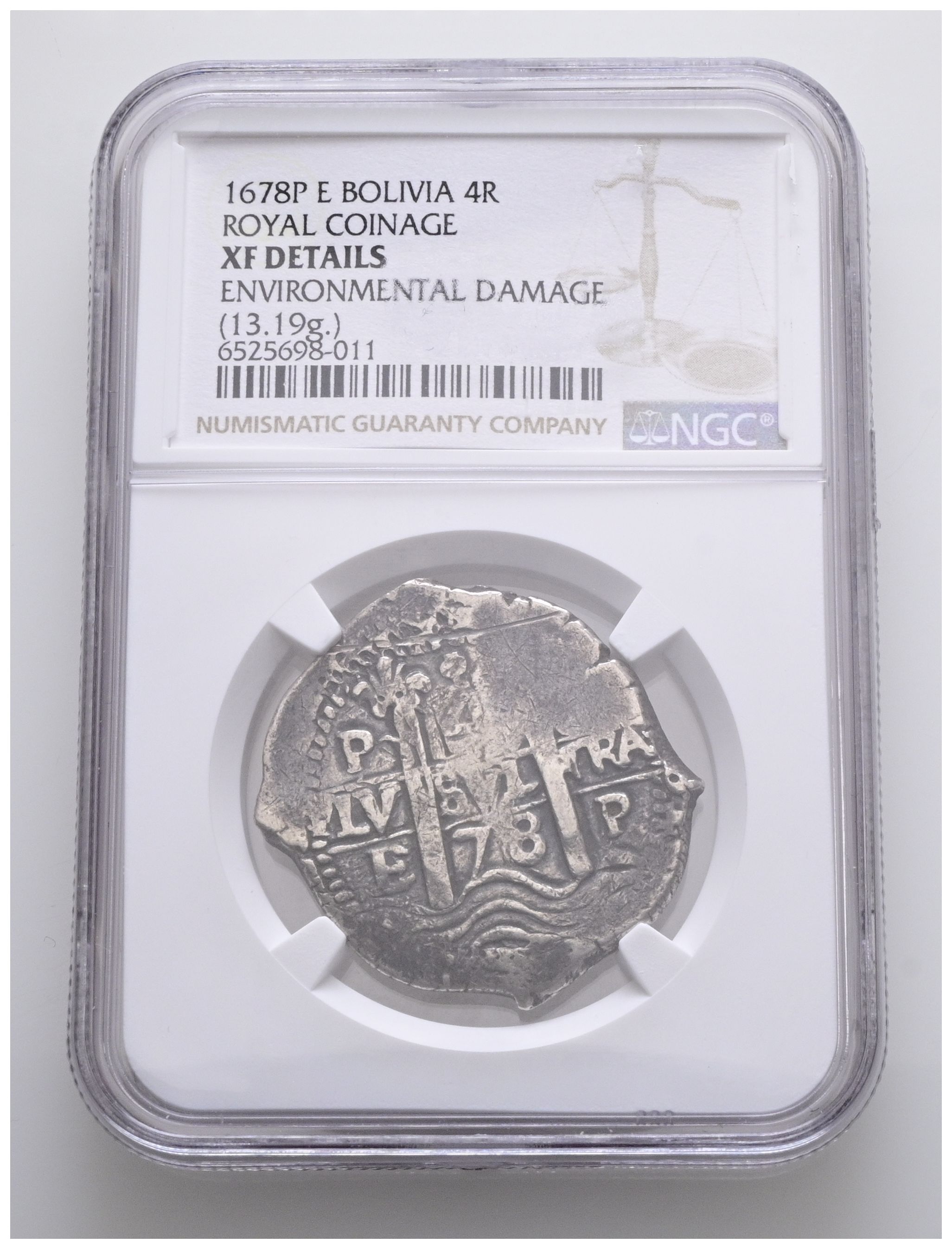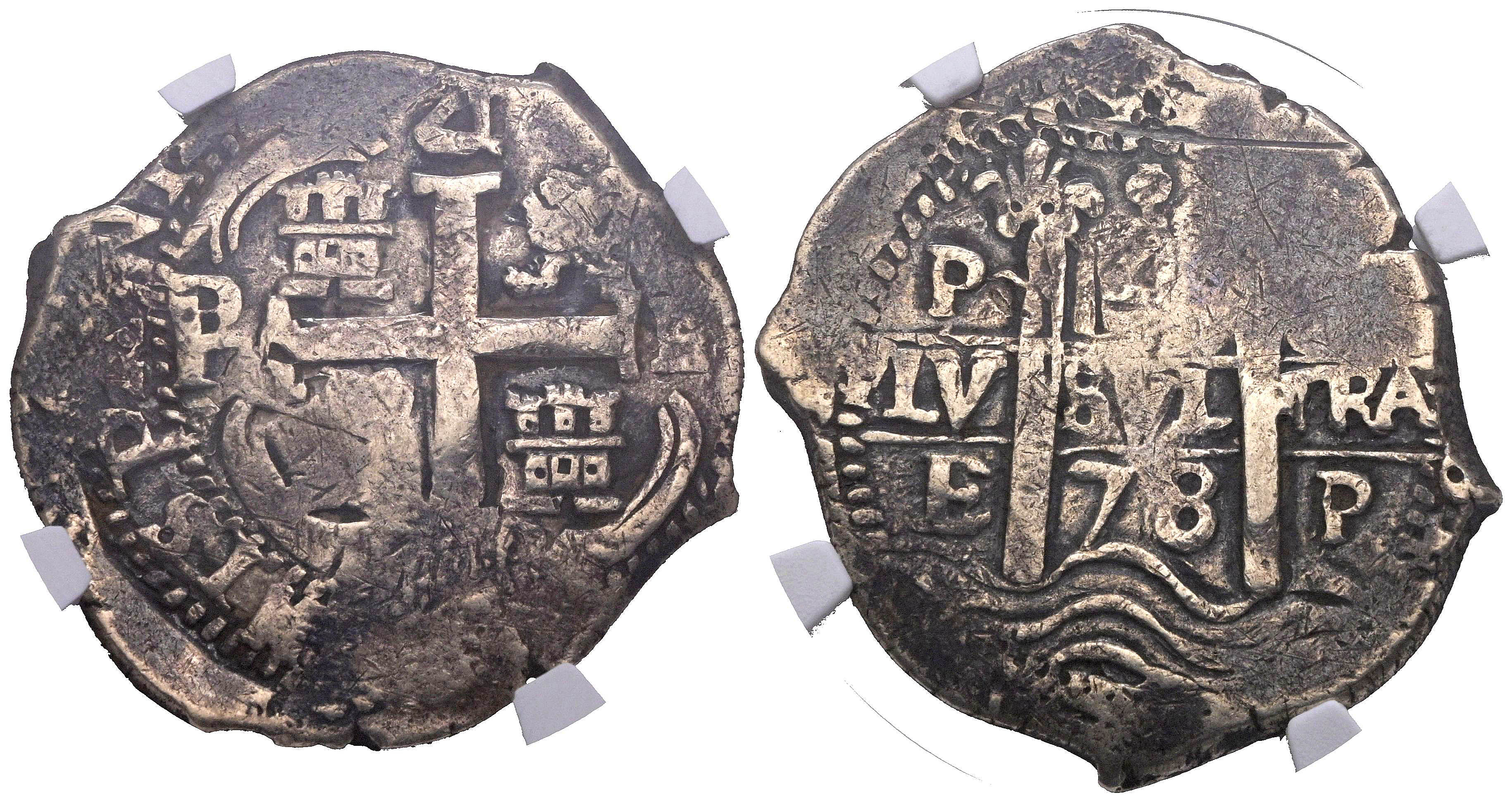 CARLOS II (1665-1700). 4 Reales. (Ar. 13,19g/33mm). 1678. Potosí E. (Cal-2019-522). Encapsulada por NGC XF Details, Environmental Damage.