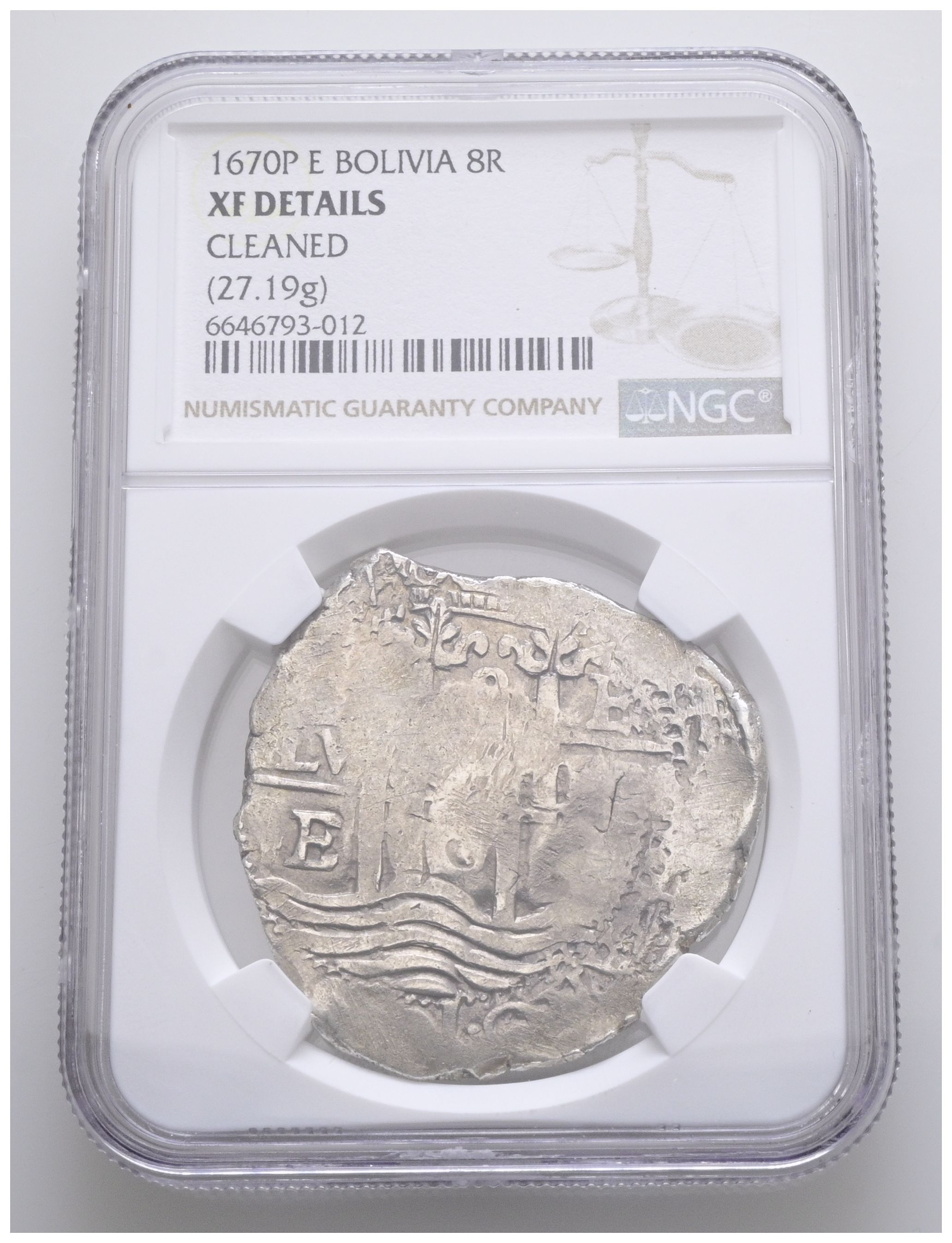 CARLOS II (1665-1700). 8 Reales. (Ar. 27,19g/37mm). 1670. Potosí E. (Cal-2019-701). Encapsulada por NGC XF Details, Cleaned.