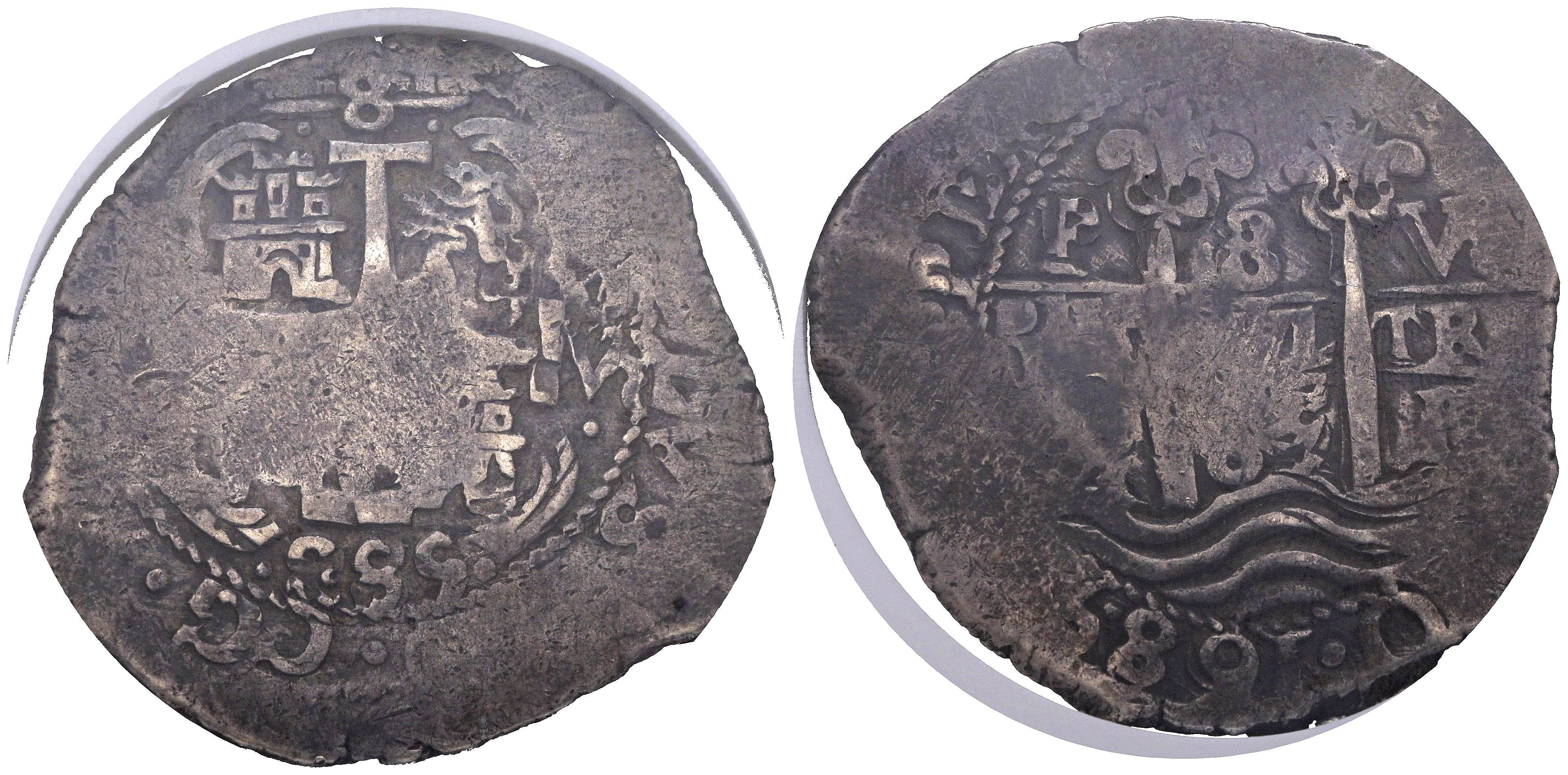 CARLOS II (1665-1700). 8 Reales. (Ar. 27,00g/40mm). 1685. Potosí VR. (Cal-2019-726). Triple fecha. Encapsulada por NGC VF 25. Interesante ejemplar.