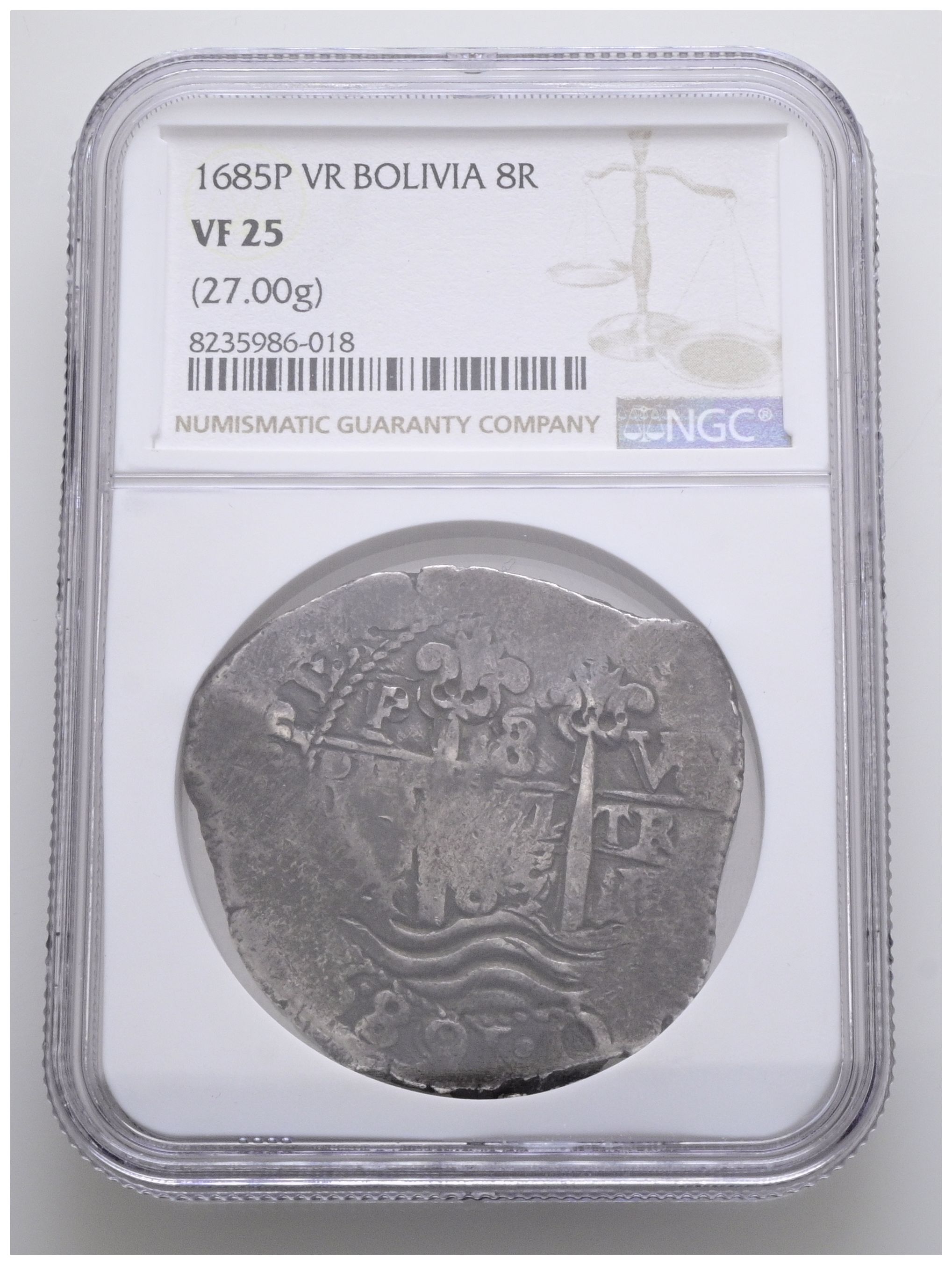 CARLOS II (1665-1700). 8 Reales. (Ar. 27,00g/40mm). 1685. Potosí VR. (Cal-2019-726). Triple fecha. Encapsulada por NGC VF 25. Interesante ejemplar.