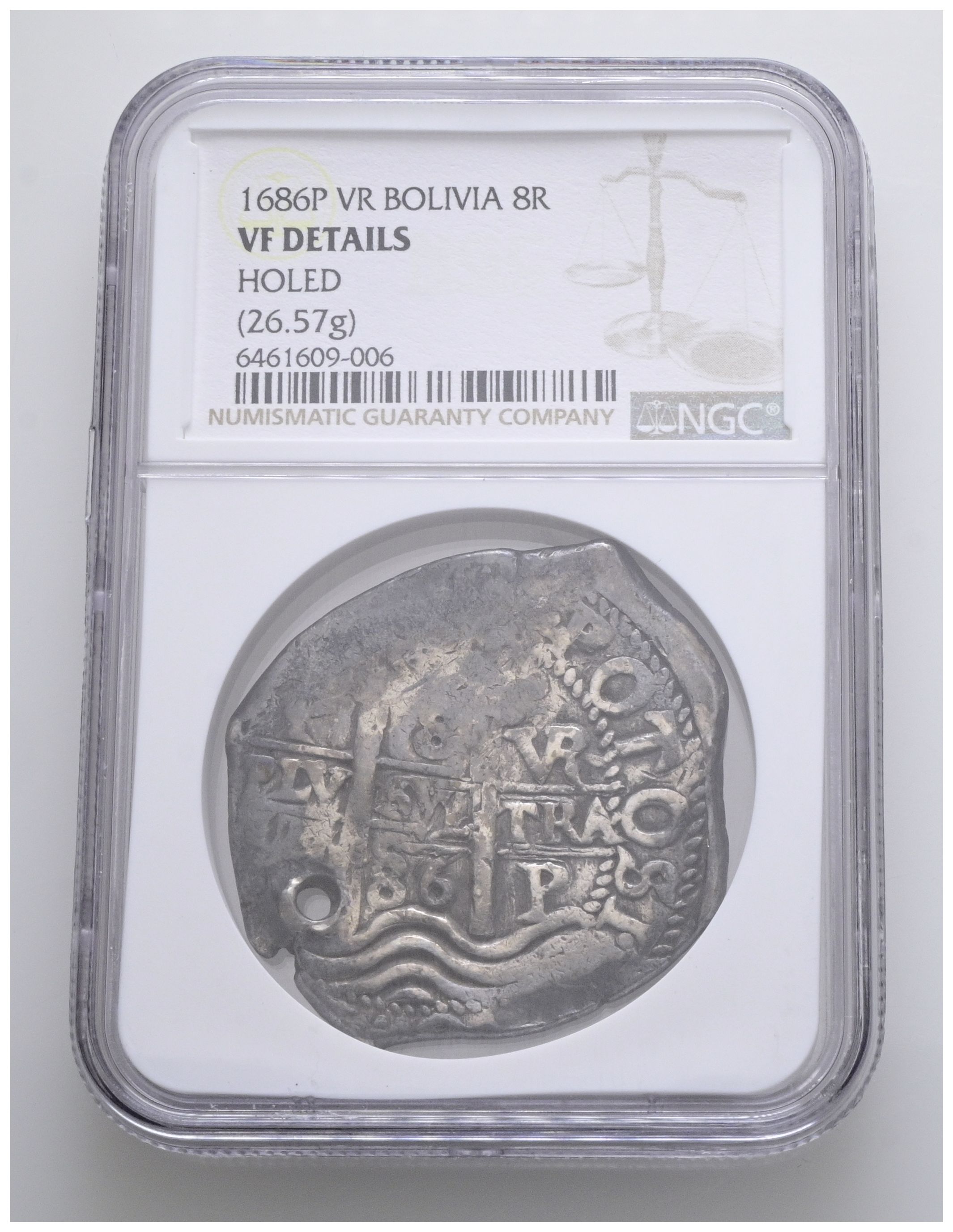 CARLOS II (1665-1700). 8 Reales. (Ar. 26,57g/39mm). 1686. Potosí VR. (Cal-2019-727). Encapsulada por NGC VF Details, Hooled.